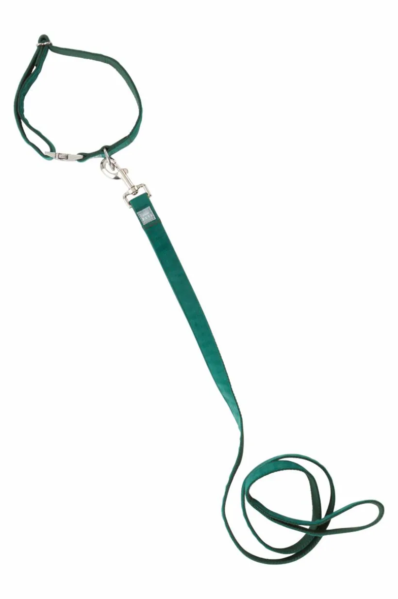 Halsbandet är mjukt och följsamt och det har ett snabbspänne av silverfärgad metall och halvring att fästa kopplet i. Halsbandets längd är justerbar. Kopplet har handögla i ena änden och pistolhake av silverfärgad metall att fästa i halsbandet i andra änden.