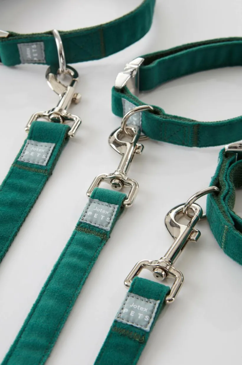 Set med halsband och koppel av polyester, det passar utmärkt till hundar och kan också passa bra till en katt. Både koppel och halsband har sammet på utsidan och vävt, lite grövre band på insidan.