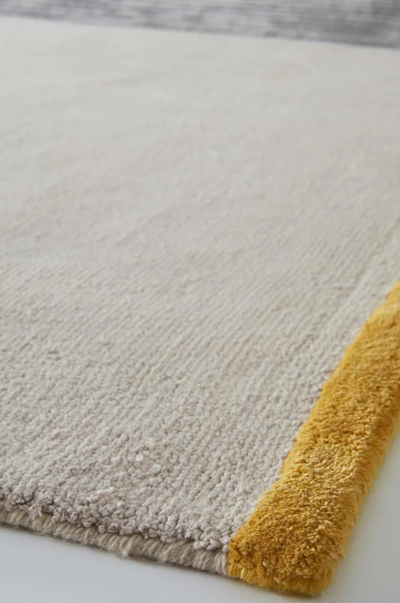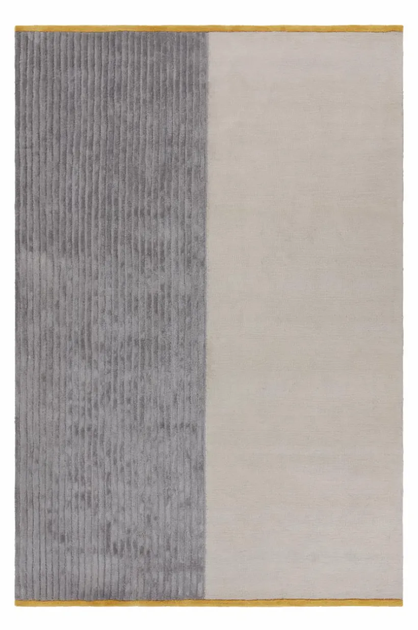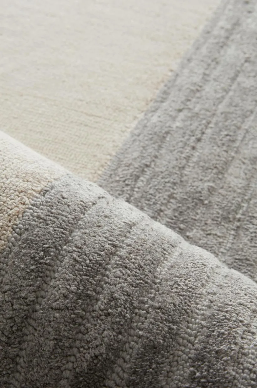 Handtuftad luggmatta av viskos. Mattan har effektfulla ränder i kontrastfärg som skapar mjuka bågar längs kortsidornas kant. Mattan är tätvävd och har olika höjd på luggen, klippt lugg kombinerat med vävda öglor. En handgjord matta är ett fint hantverk och varje matta är unik. Lugghöjd öglor 0,5-0,6 cm, klippt lugg 1-1,2 cm. Tjocklek 1,8-2 cm. 3500-3700 g/m².