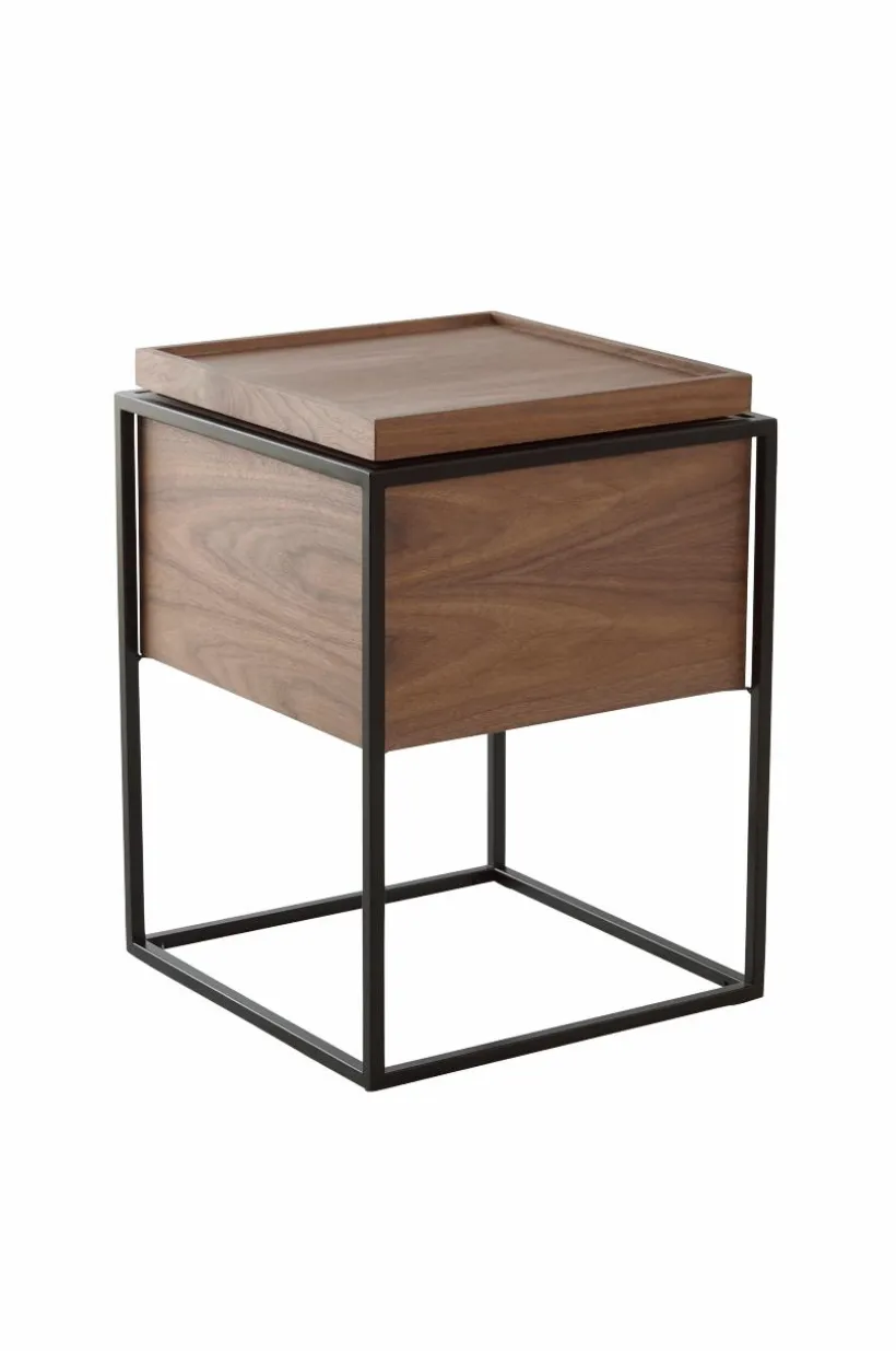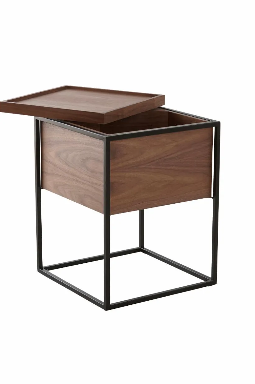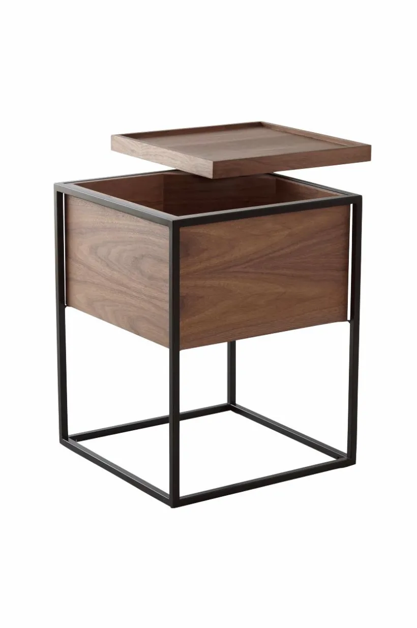 Fyrkantigt sidobord med förvaring av fanerad MDF och metallram. Modernt sidobord med smart förvaringslösning. Vrid locket åt sidan och stuva undan sådant du inte vill ha framme, eller varför inte förvara godis och annat gott som du kan plocka fram till filmen.