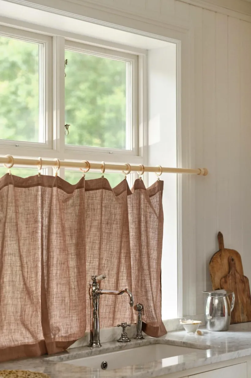 En cafégardin i luftigt tyg med melerad effekt. Tyget är vävt i bomull och har en skönt avslappnad känsla. Cafégardinen LUNI har en sydd kanal upptill och den hängs på gardinstång nedtill i ditt fönster och ger på så sätt insynsskydd samtidigt som ljuset kommer in ovanför gardinen, härligt att alltid se himlen.