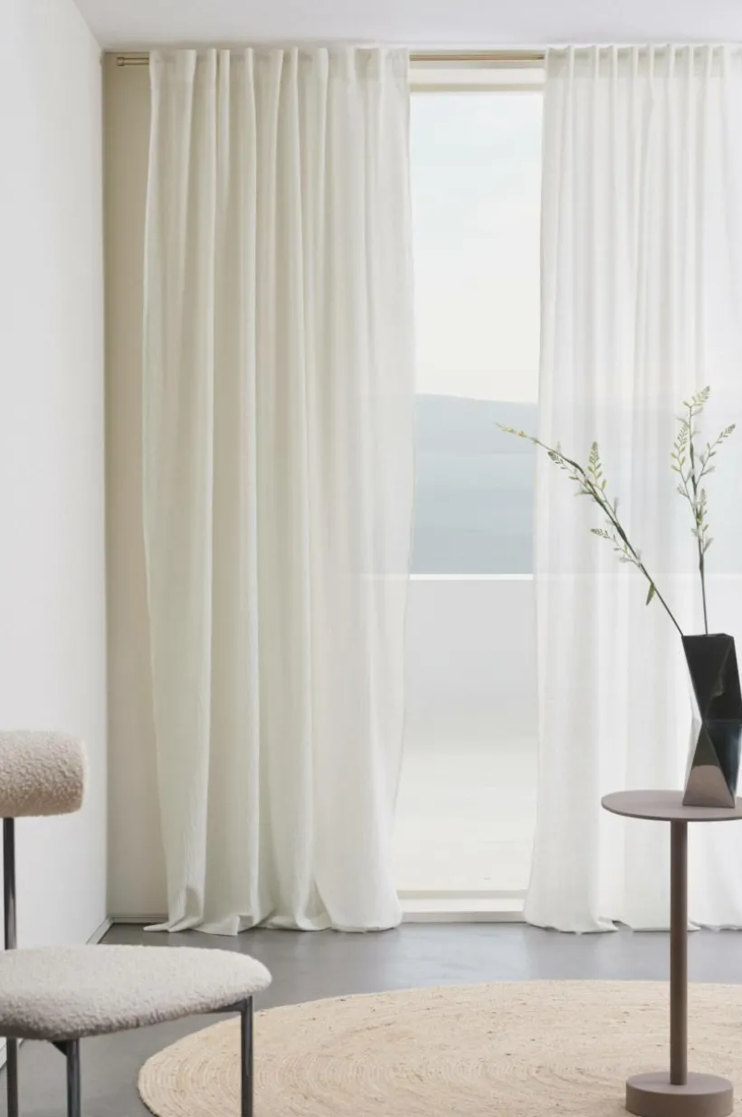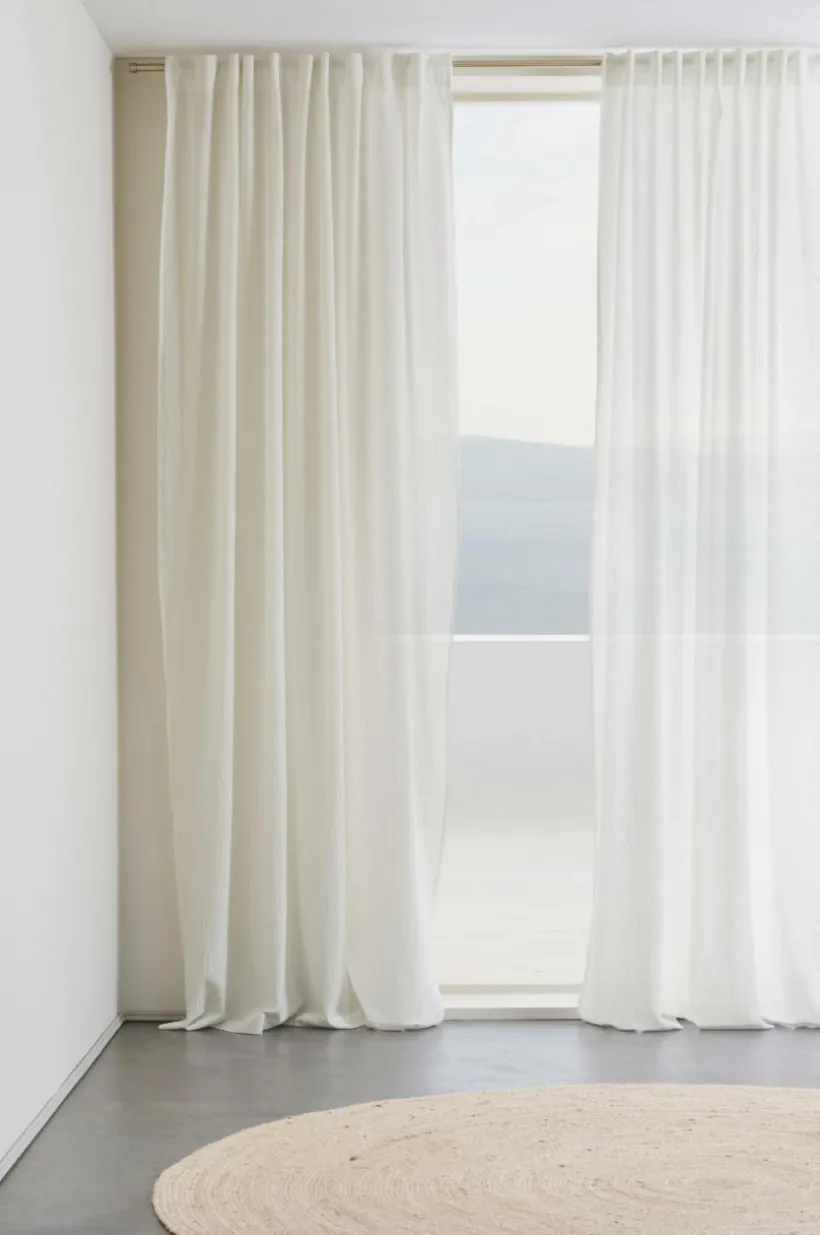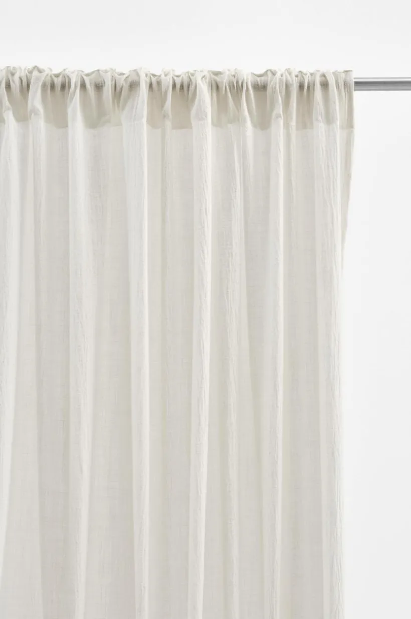 Två gardinlängder i luftigt tyg med melerad effekt. Tyget är vävt i bomull och har en skönt avslappnad känsla. LUNI har påsytt multifunktionsband och gardinen kan hängas upp med fingerkrokar, kanal samt dold hälla. Tygets gramvikt 105 g/m².