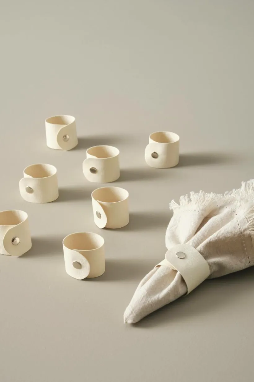 8-pack servettringar i konstläder av polyuretan. Servettringen stängs med en tryckknapp och ger en festlig dukning.