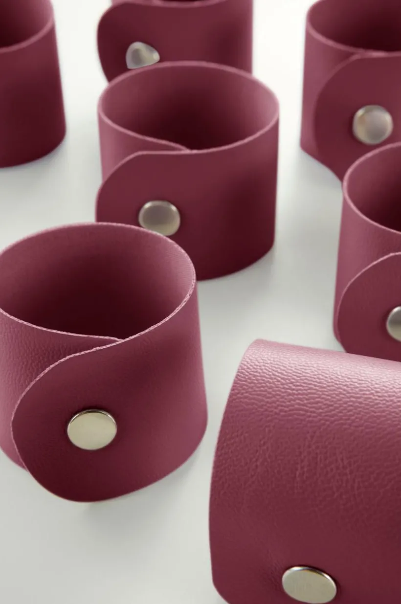 8-pack servettringar i konstläder av polyuretan. Servettringen stängs med en tryckknapp och ger en festlig dukning.