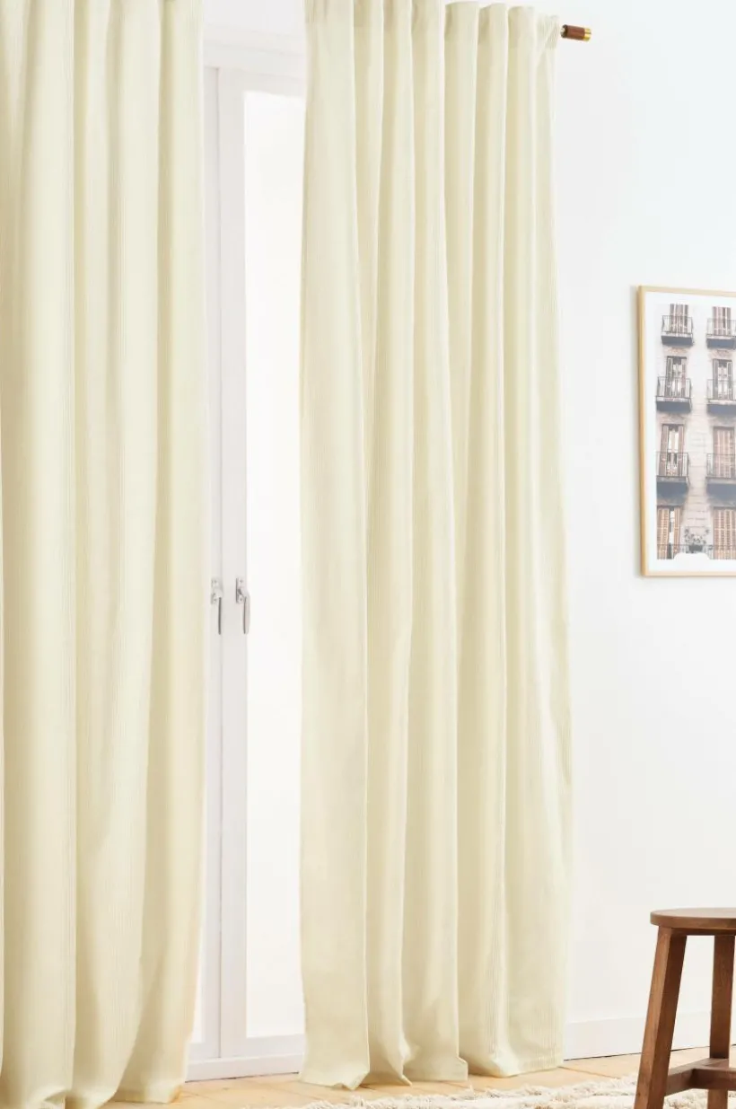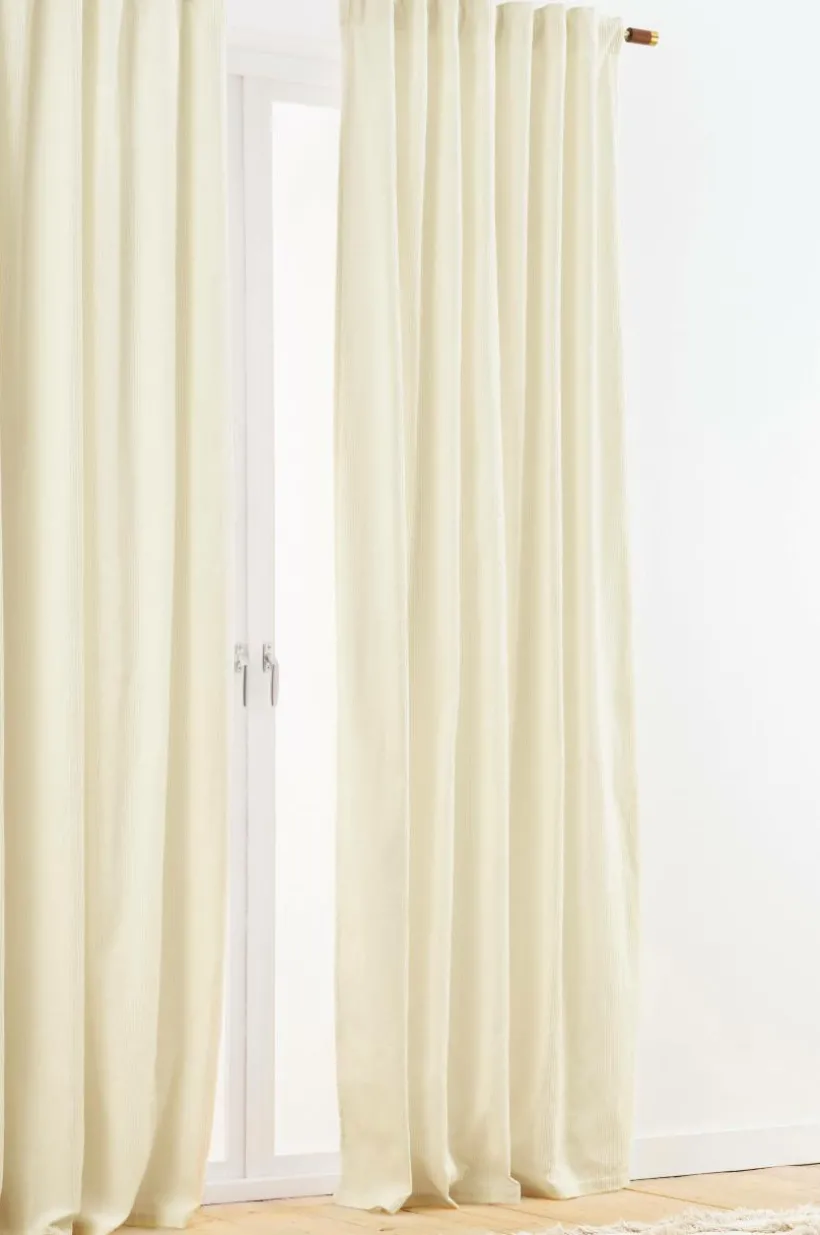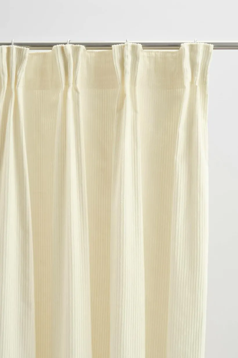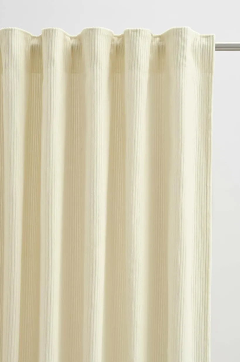 Två gardinlängder i manchester av bomull, ett härligt tyg som är trendigt och samtidigt kan väcka härlig nostalgi. Manchestern är bredspårig och längderna får tyngd och faller fint. Längderna har påsytt multifunktionsband och kan hängas upp med fingerkrokar, kanal samt dold hälla.