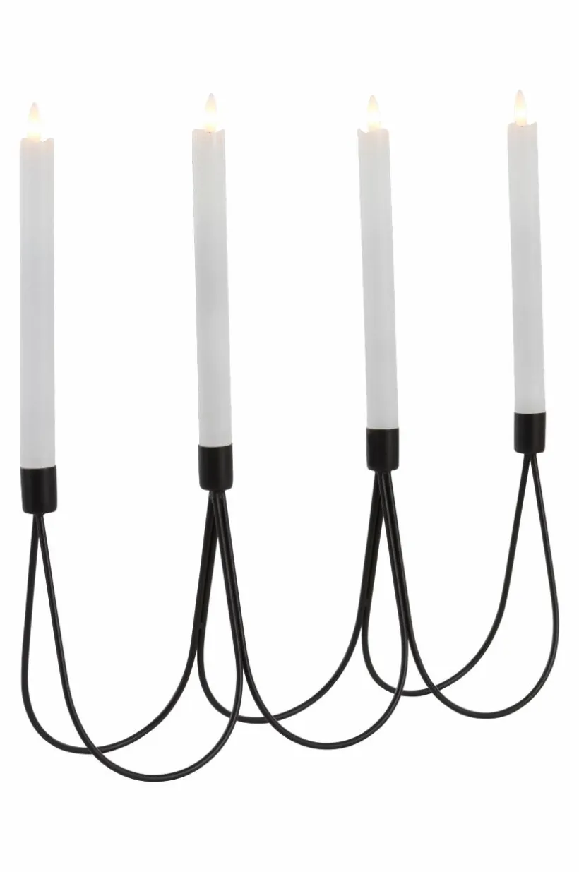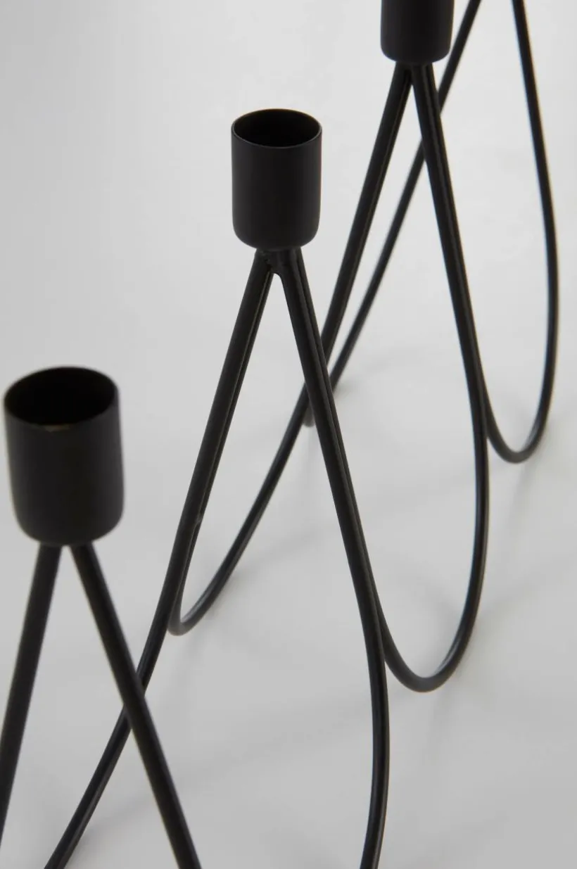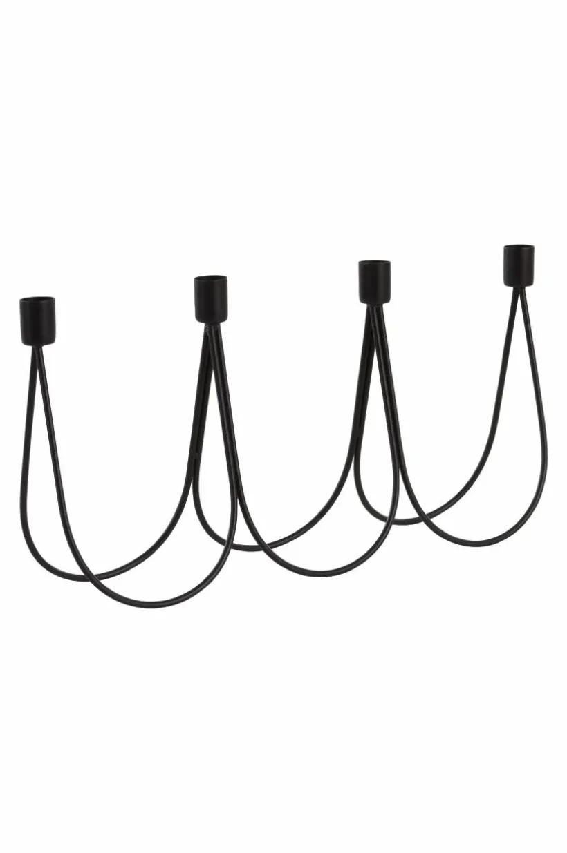 Ljusstake av järn. Den mjuka formen står i skön kontrast till materialet och de smala bågformade benen för tanken till en tvinnad vajer. Ljusstaken har fyra ljushållare vilket ger den en självklar plats i advent, men LUZIA är vacker året om. Den svarta har matt pulverlack och den guldfärgade har borstad finish. Ljus medföljer ej.