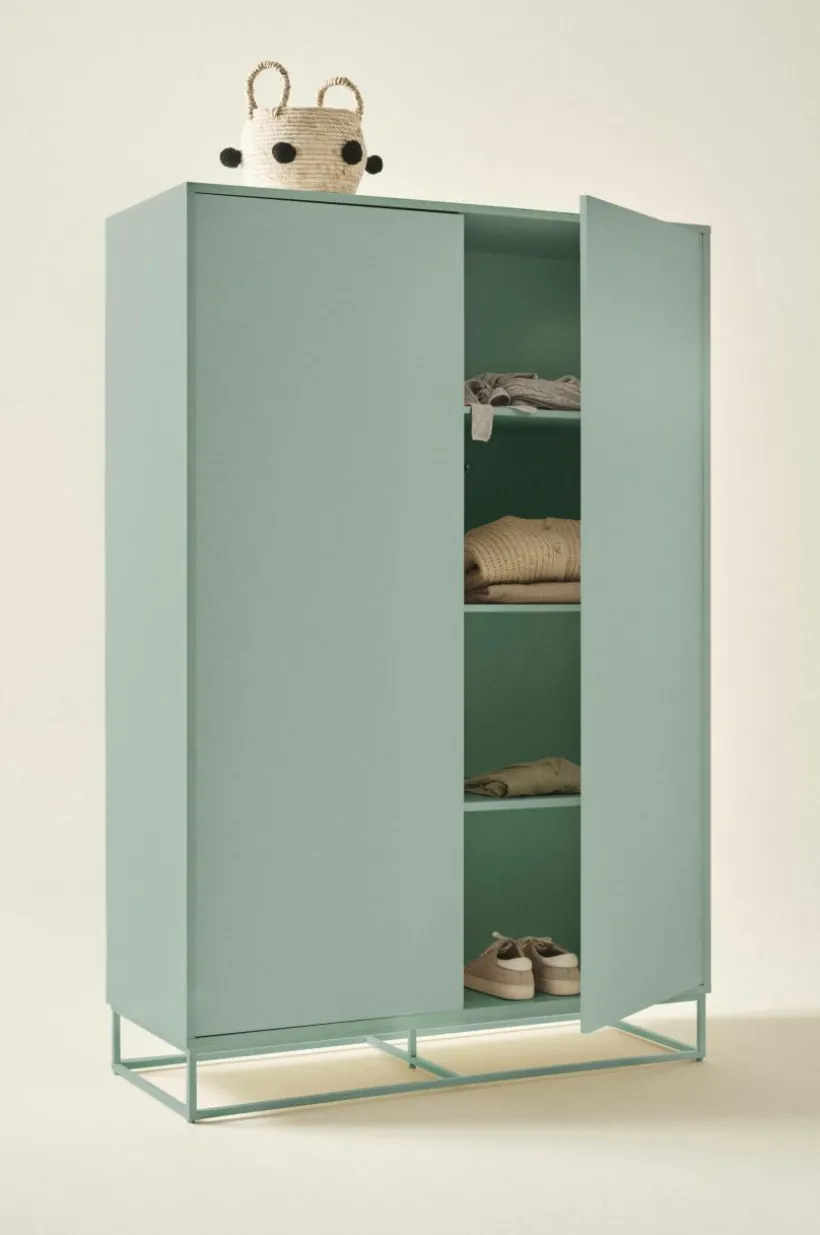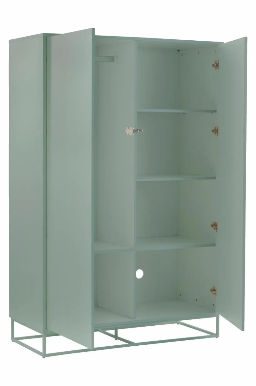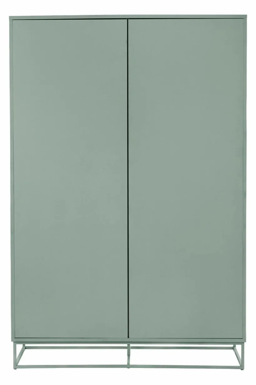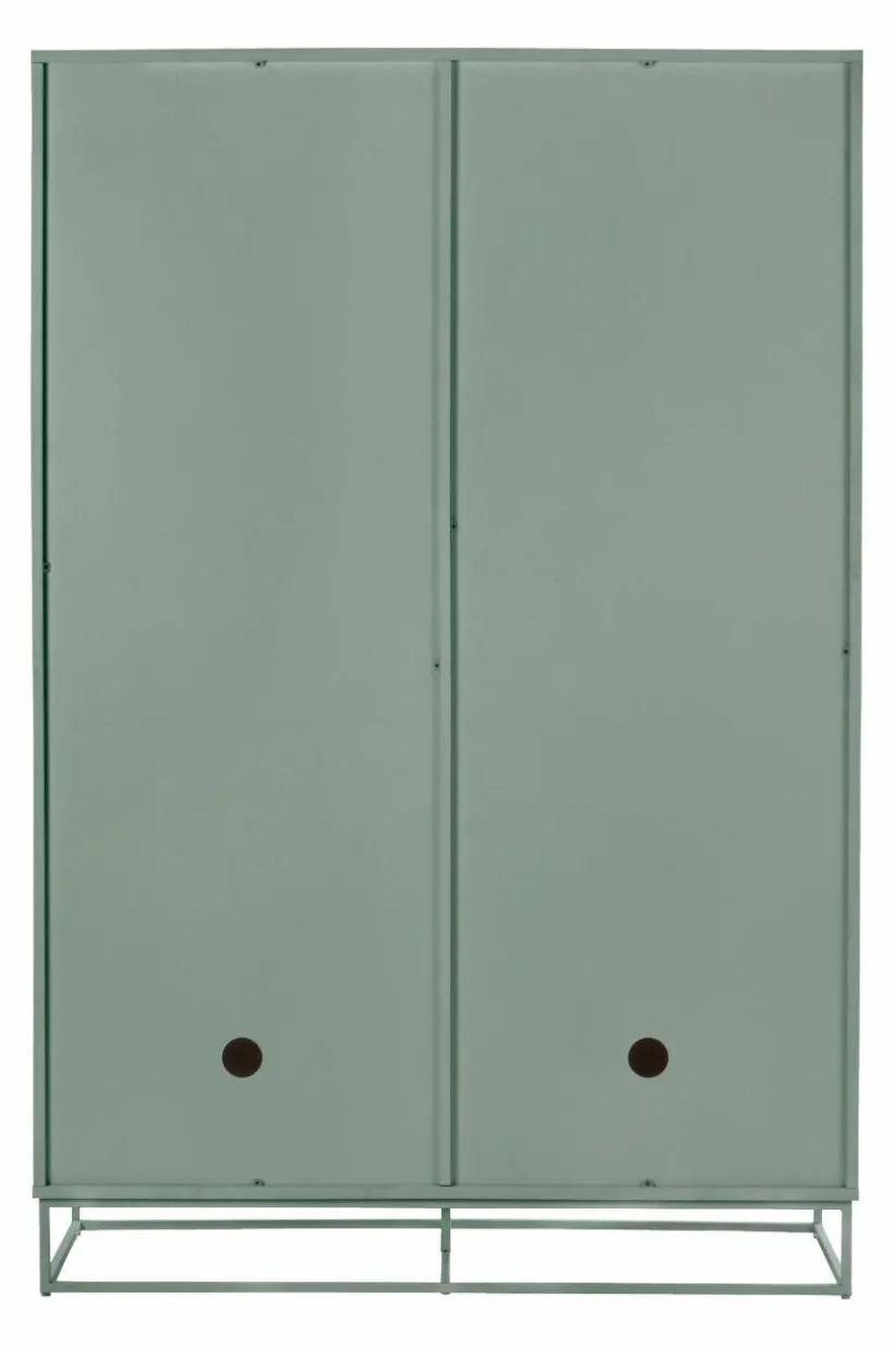Garderob av MDF med underrede av metall. Den avskalade och stilrena garderoben har två dörrar med pushfunktion. Det gör att garderoben är helt slät utan handtag och ändå lätt att öppna. Garderoben är tvådelad. Den vänstra delen har klädstång av massiv bok och en fast hylla. Den högra delen har tre flyttbara hyllor. Delarna av MDF har vattenbaserad lack. Underredet är av fyrkantsprofil med pulverlack. Väggfäste gör att skåpet kan fästas i väggen vid behov. Viss montering krävs. Monteringsanvisning medföljer.