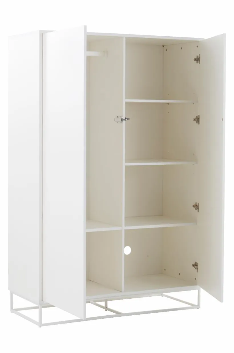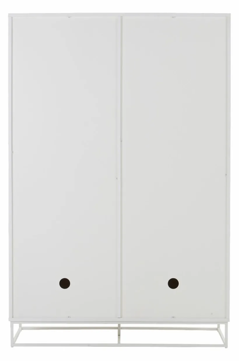 Garderob av MDF med underrede av metall. Den avskalade och stilrena garderoben har två dörrar med pushfunktion. Det gör att garderoben är helt slät utan handtag och ändå lätt att öppna. Garderoben är tvådelad. Den vänstra delen har klädstång av massiv bok och en fast hylla. Den högra delen har tre flyttbara hyllor. Delarna av MDF har vattenbaserad lack. Underredet är av fyrkantsprofil med pulverlack. Väggfäste gör att skåpet kan fästas i väggen vid behov. Viss montering krävs. Monteringsanvisning medföljer.