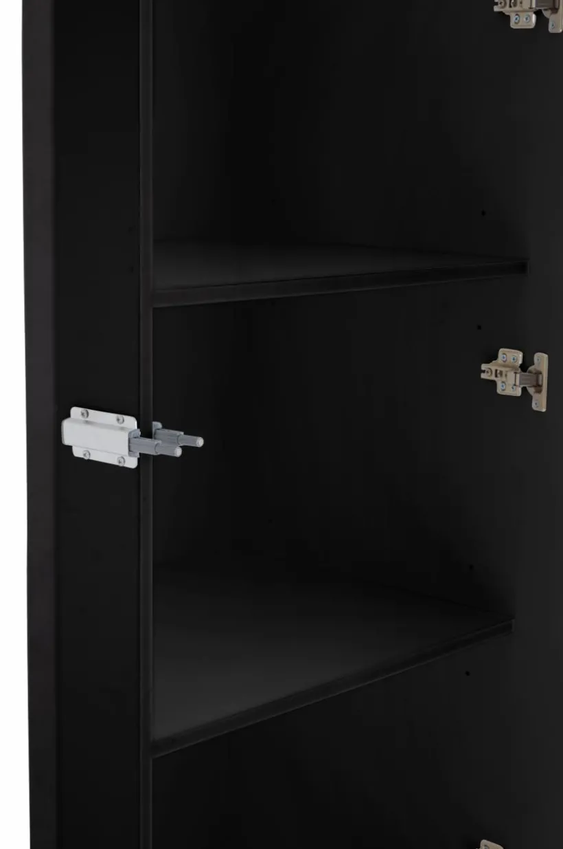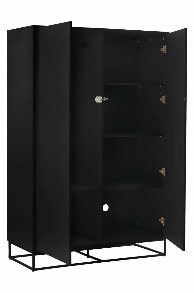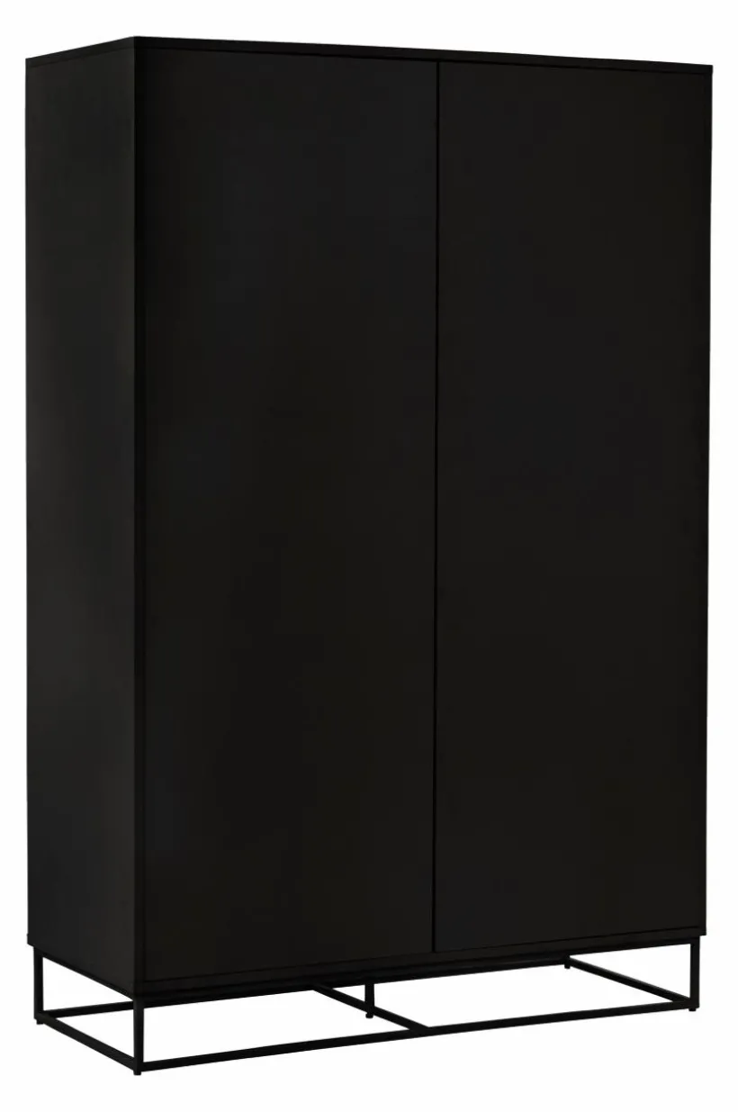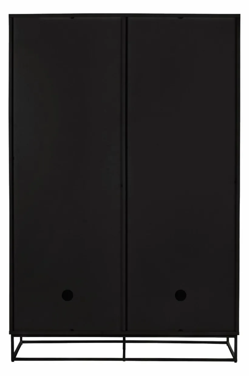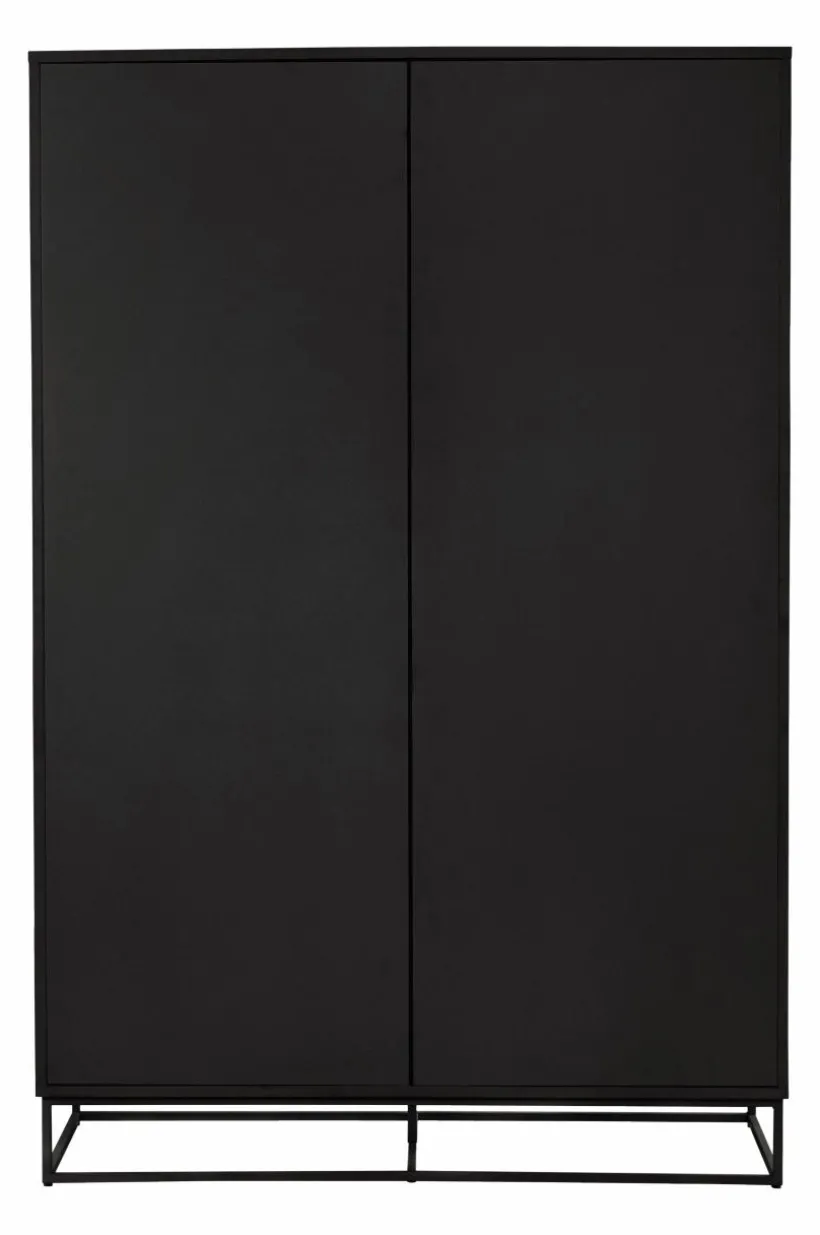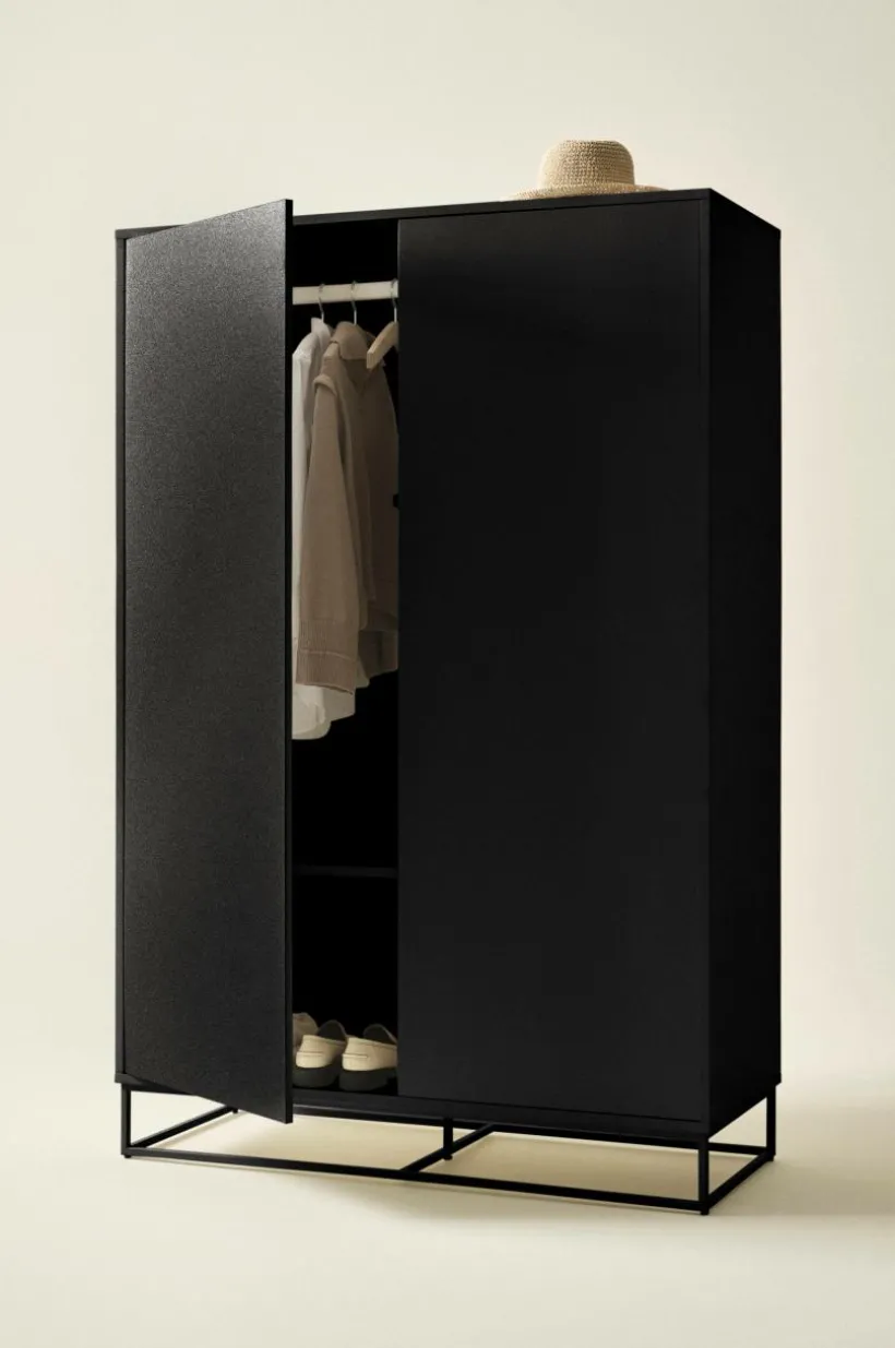 Garderob av MDF med underrede av metall. Den avskalade och stilrena garderoben har två dörrar med pushfunktion. Det gör att garderoben är helt slät utan handtag och ändå lätt att öppna. Garderoben är tvådelad. Den vänstra delen har klädstång av massiv bok och en fast hylla. Den högra delen har tre flyttbara hyllor. Delarna av MDF har vattenbaserad lack. Underredet är av fyrkantsprofil med pulverlack. Väggfäste gör att skåpet kan fästas i väggen vid behov. Viss montering krävs. Monteringsanvisning medföljer.