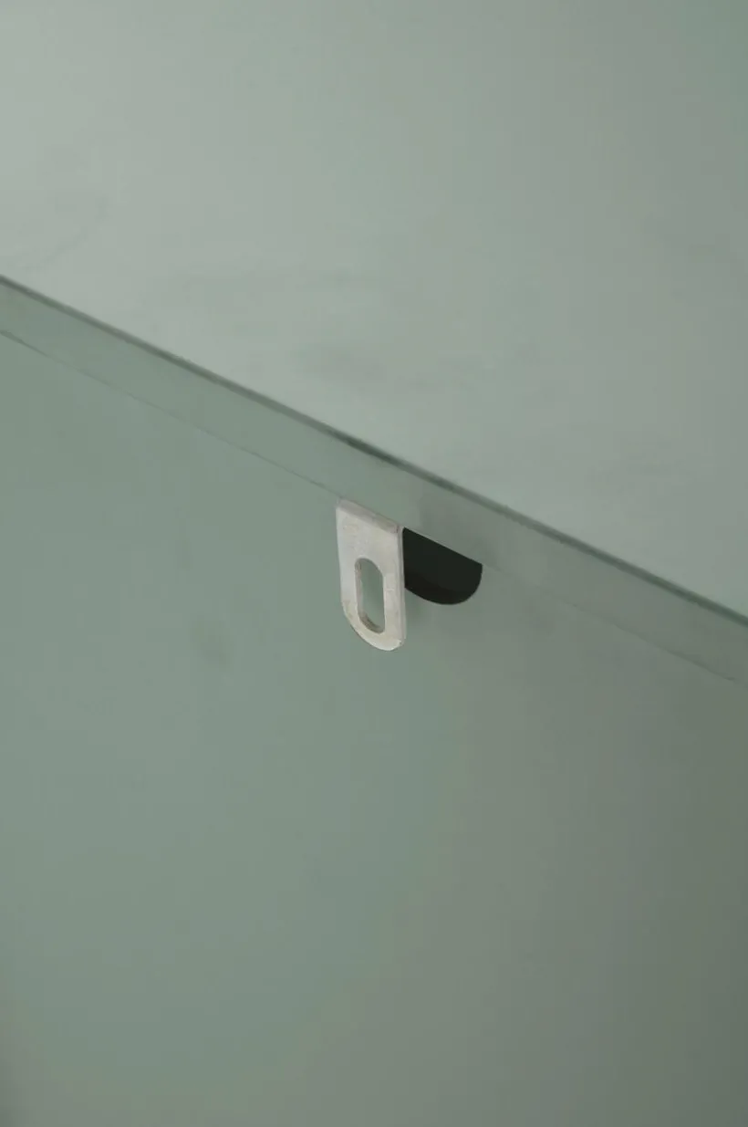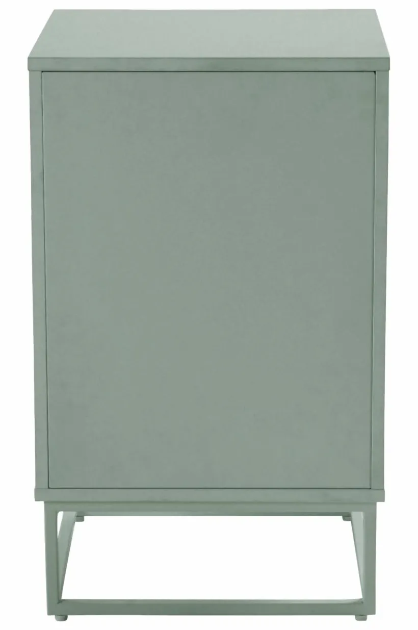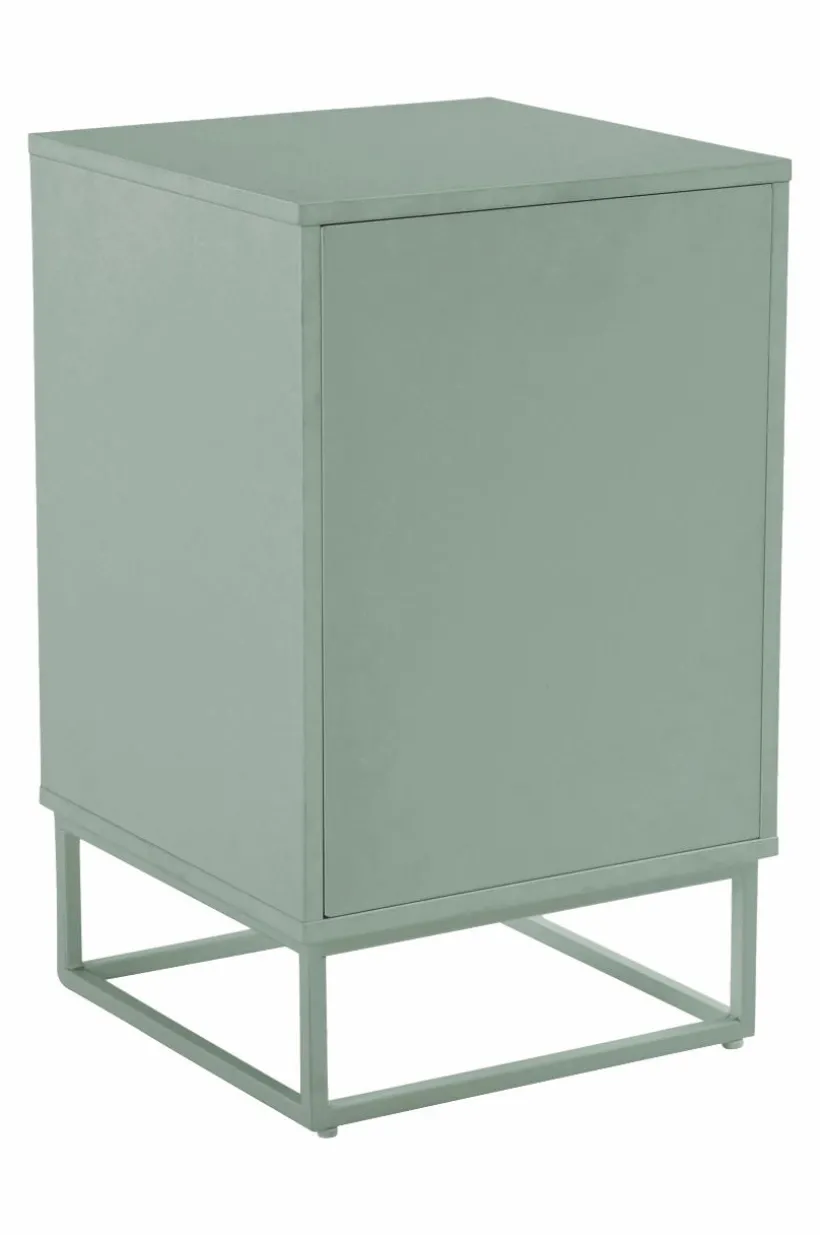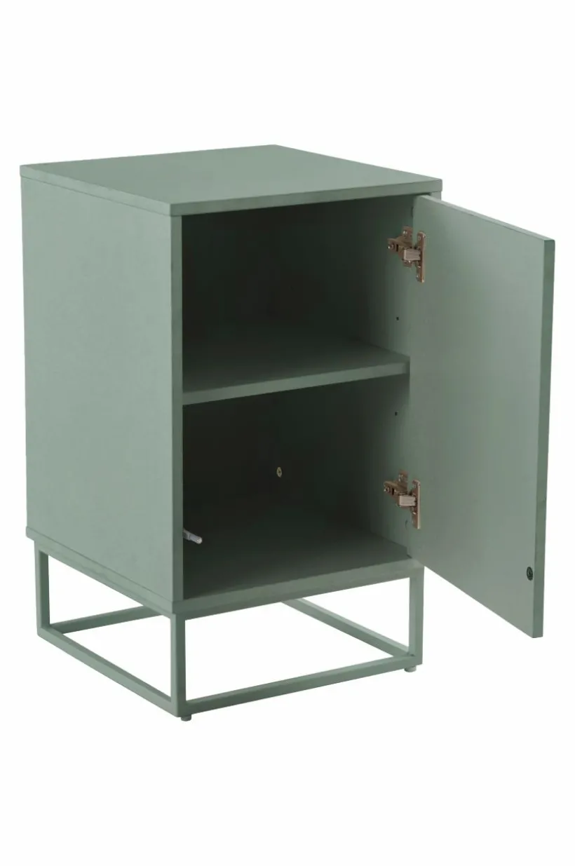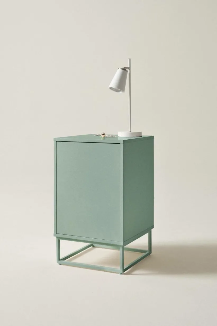 Sängbord av MDF med underrede av metall. Det avskalade och stilrena sängbordet har en skåpsdörr med pushfunktion. Det gör att dörren är helt slät utan handtag och ändå lätt att öppna. I skåpet finns en hylla. Delarna av MDF har vattenbaserad lack. Underredet är av fyrkantsprofil med pulverlack. Väggfäste gör att sängbordet kan fästas i väggen vid behov. Viss montering krävs. Monteringsanvisning medföljer.