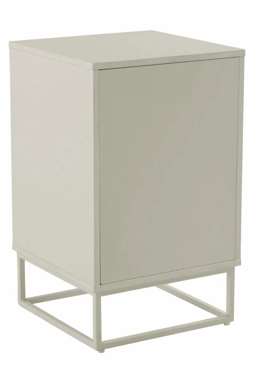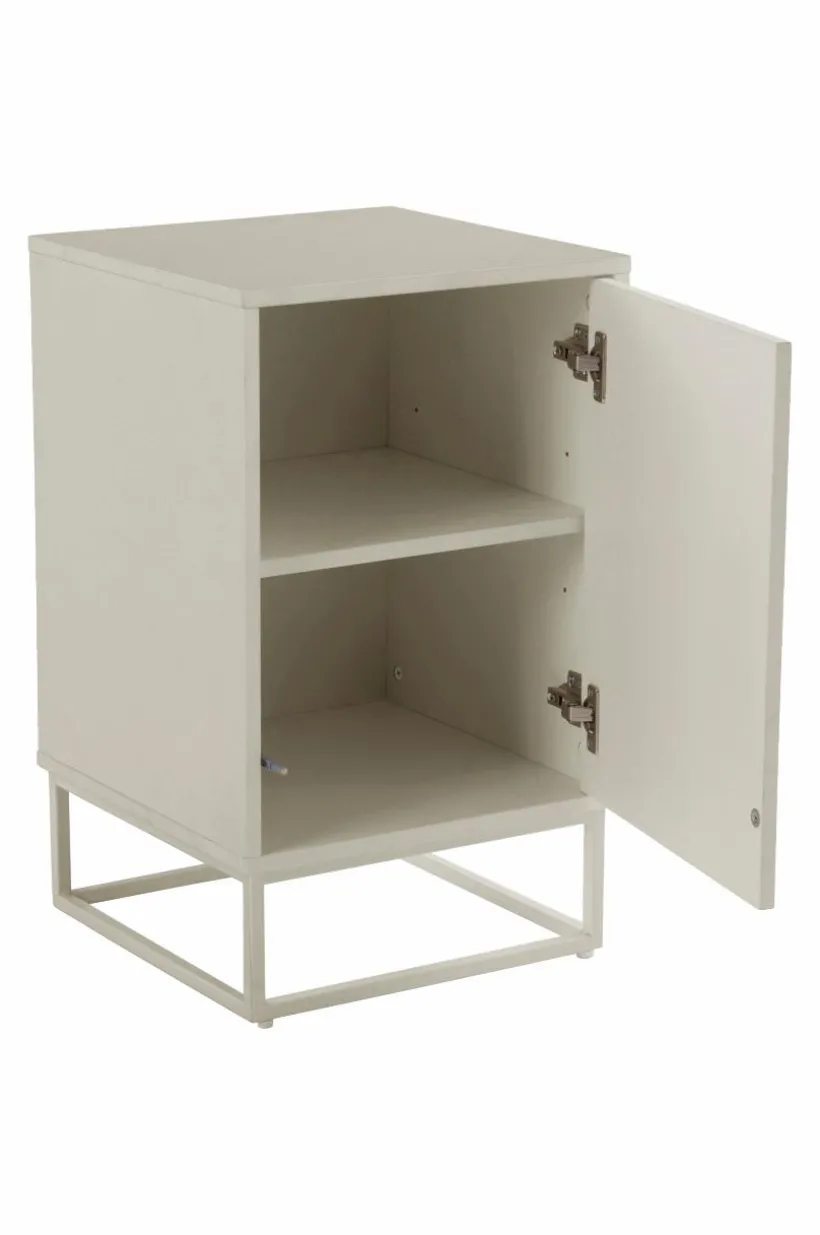 Sängbord av MDF med underrede av metall. Det avskalade och stilrena sängbordet har en skåpsdörr med pushfunktion. Det gör att dörren är helt slät utan handtag och ändå lätt att öppna. I skåpet finns en hylla. Delarna av MDF har vattenbaserad lack. Underredet är av fyrkantsprofil med pulverlack. Väggfäste gör att sängbordet kan fästas i väggen vid behov. Viss montering krävs. Monteringsanvisning medföljer.