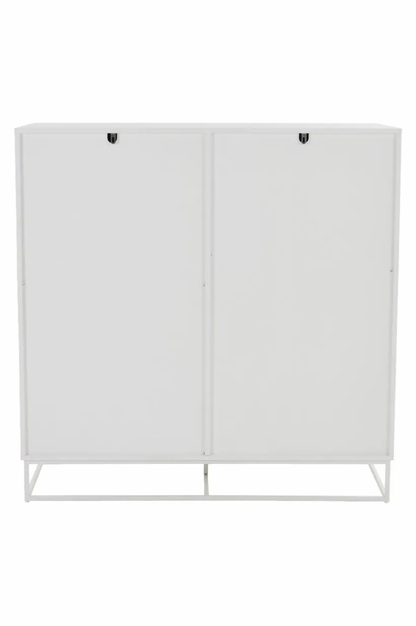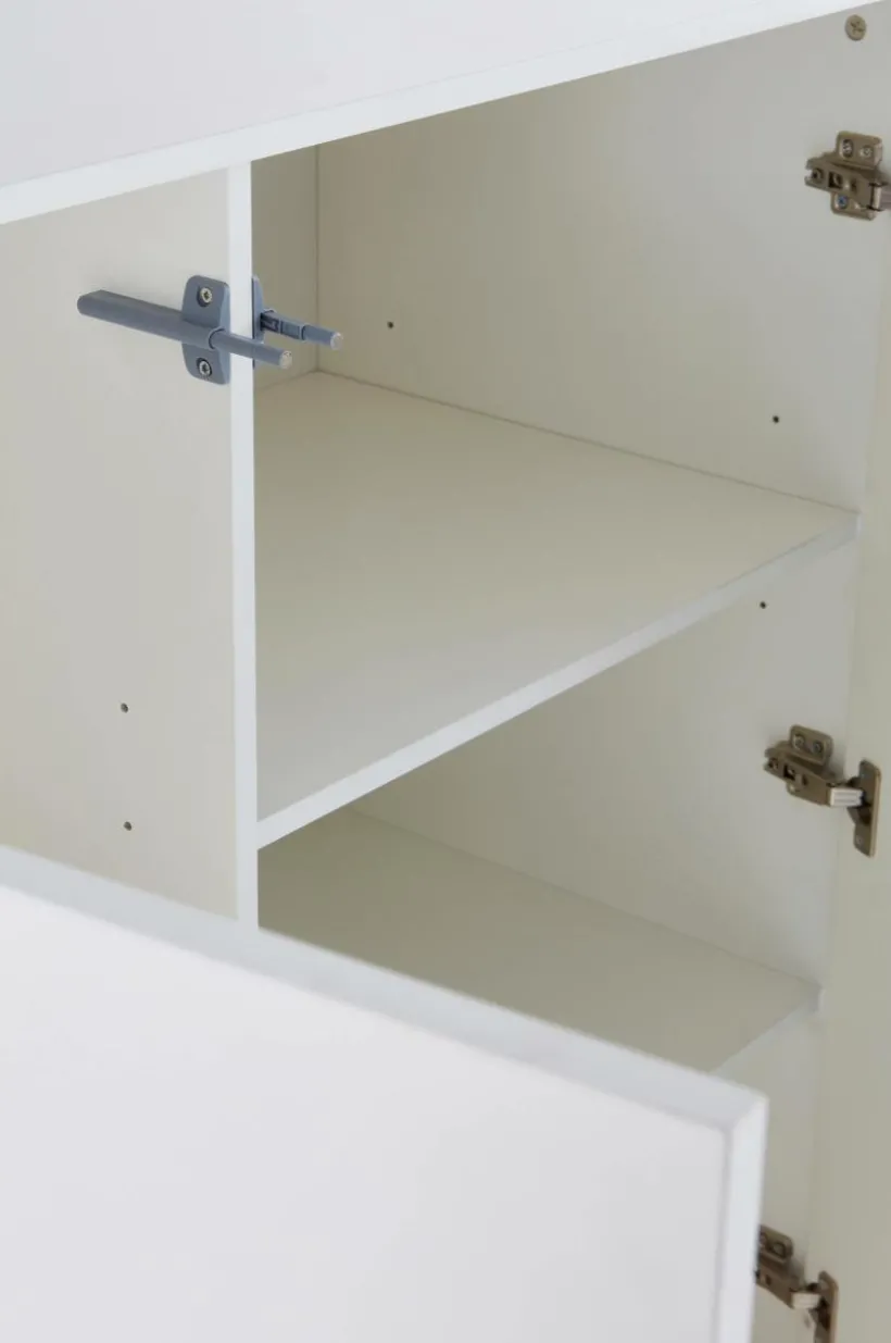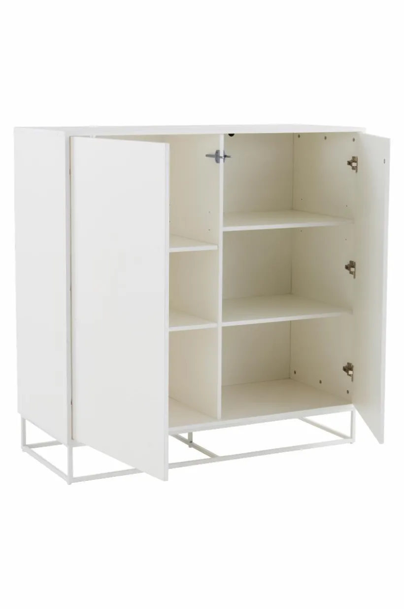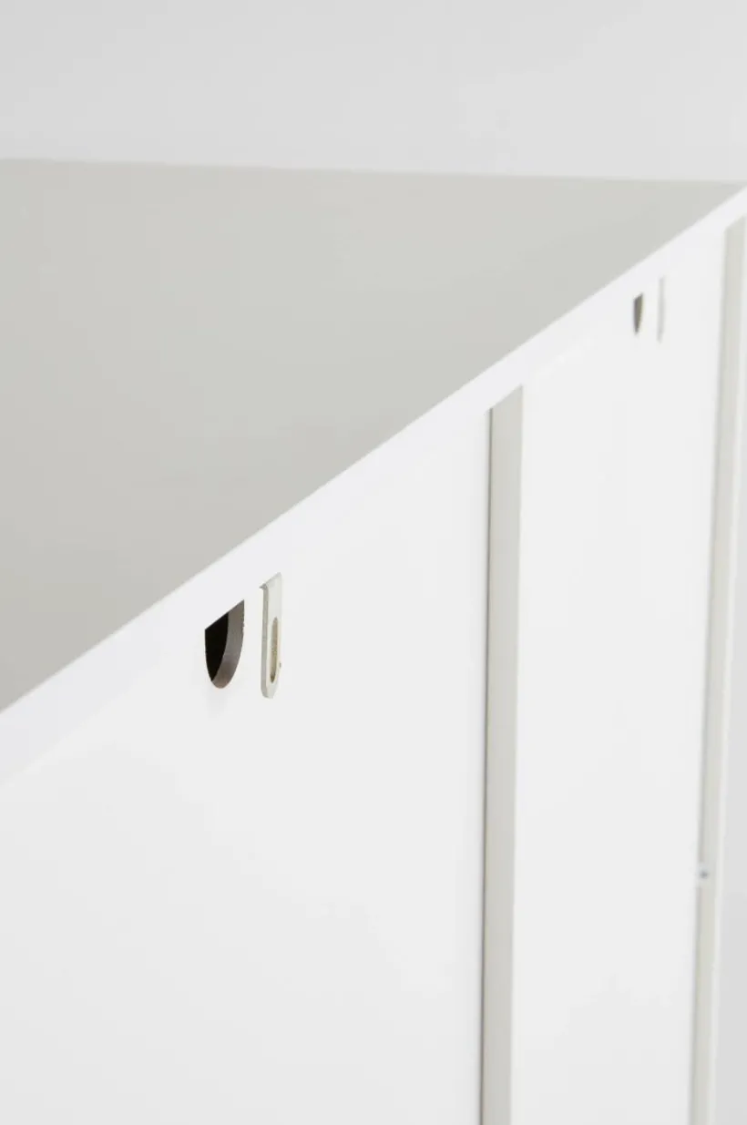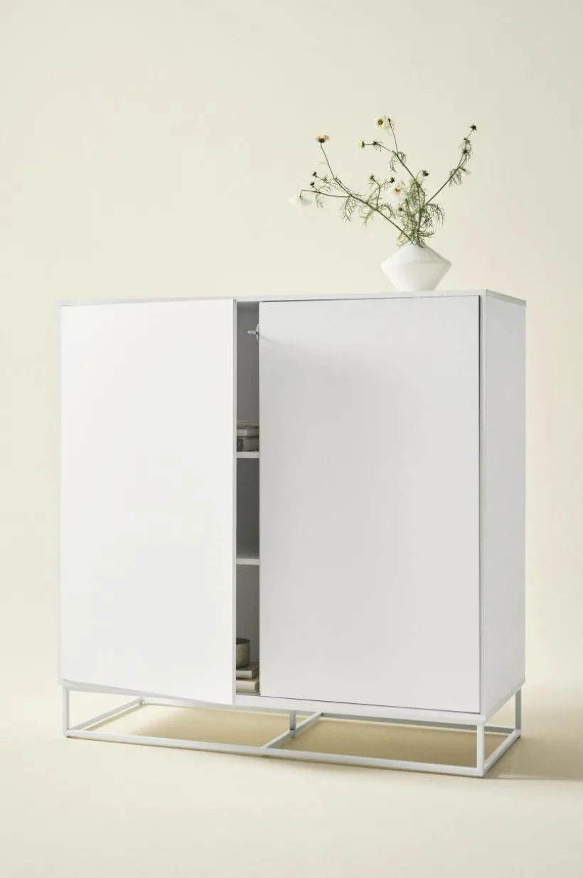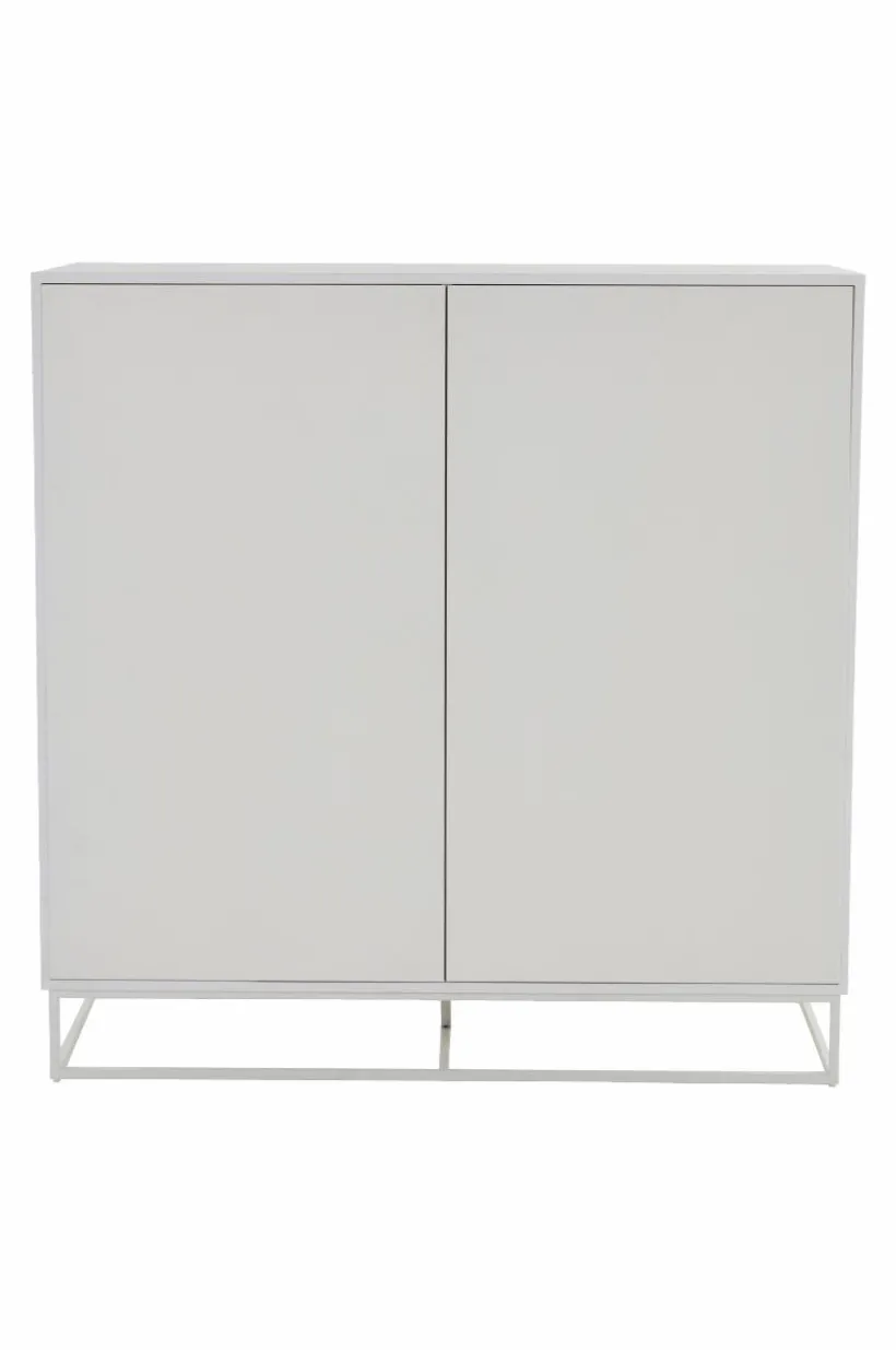 Skåp av MDF med underrede av metall. Det avskalade och stilrena skåpet har två dörrar med pushfunktion. Det gör att skåpet är helt slätt utan handtag och ändå lätt att öppna. I skåpet finns två hyllor. Skåpet är tvådelat och det finns två flyttbara hyllplan i varje del. Delarna av MDF har vattenbaserad lack. Underredet är av fyrkantsprofil med pulverlack. Väggfäste gör att skåpet kan fästas i väggen vid behov. Viss montering krävs. Monteringsanvisning medföljer.