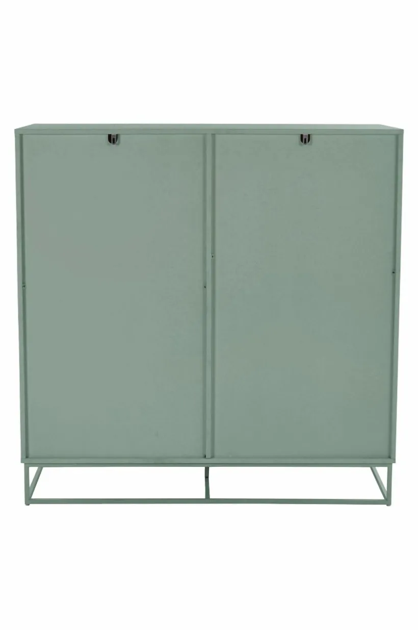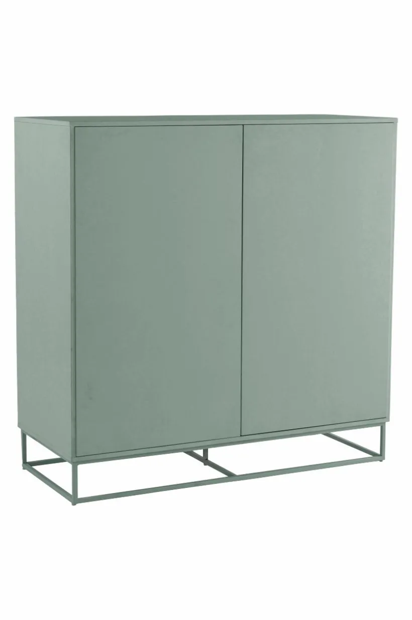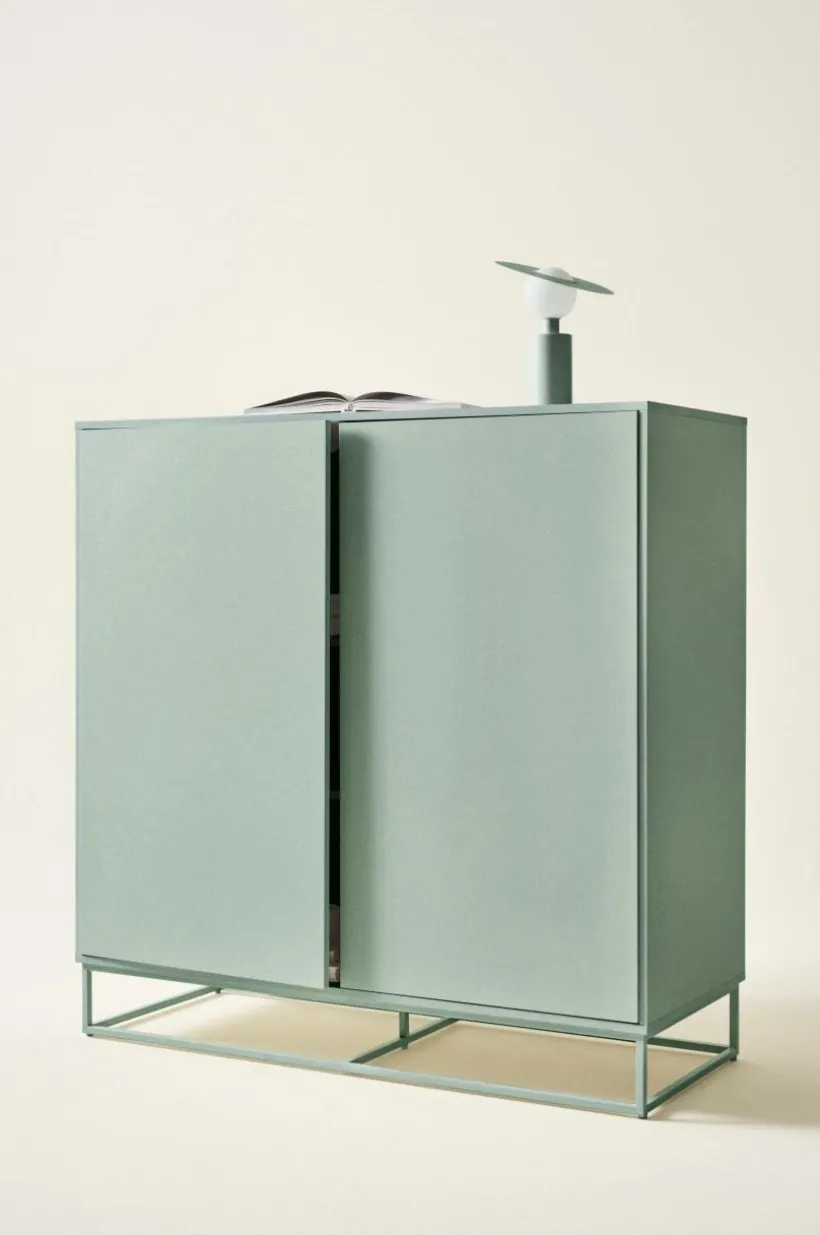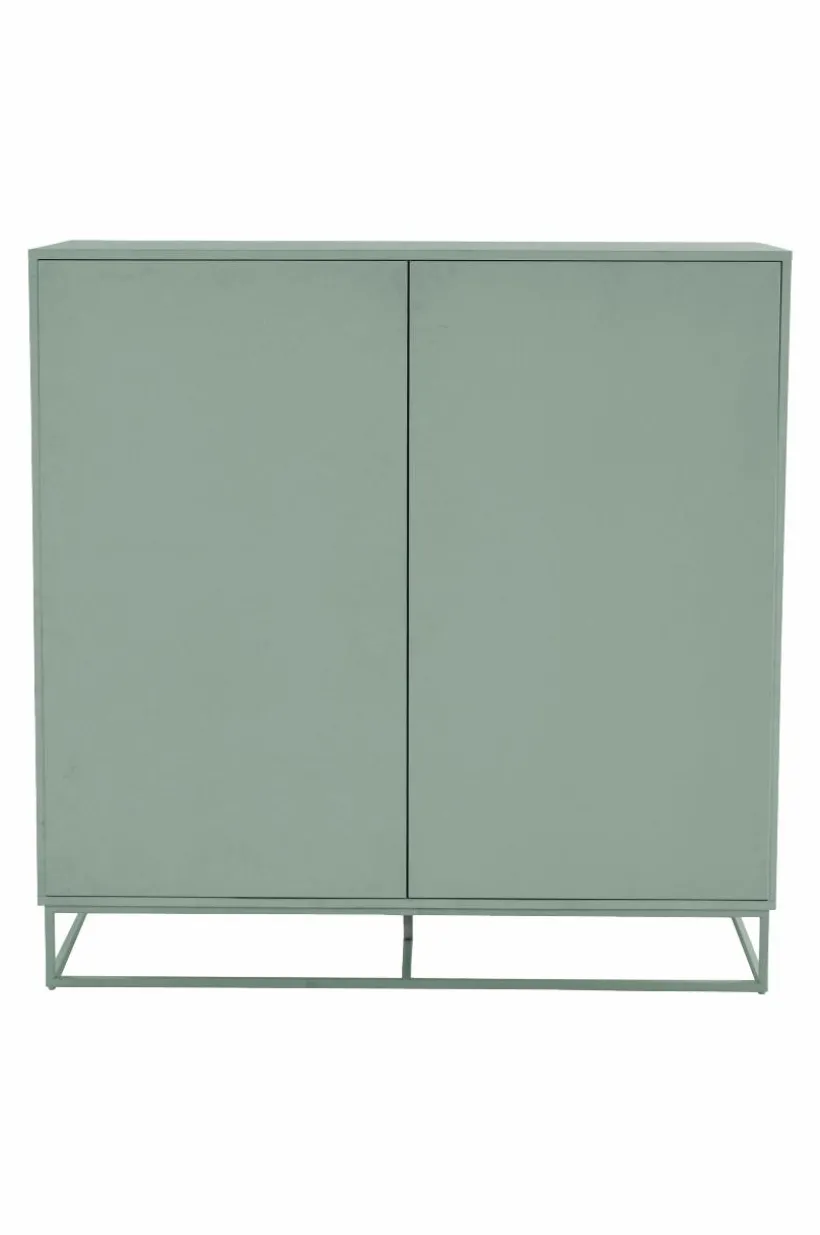 Skåp av MDF med underrede av metall. Det avskalade och stilrena skåpet har två dörrar med pushfunktion. Det gör att skåpet är helt slätt utan handtag och ändå lätt att öppna. I skåpet finns två hyllor. Skåpet är tvådelat och det finns två flyttbara hyllplan i varje del. Delarna av MDF har vattenbaserad lack. Underredet är av fyrkantsprofil med pulverlack. Väggfäste gör att skåpet kan fästas i väggen vid behov. Viss montering krävs. Monteringsanvisning medföljer.