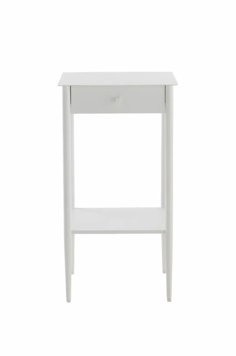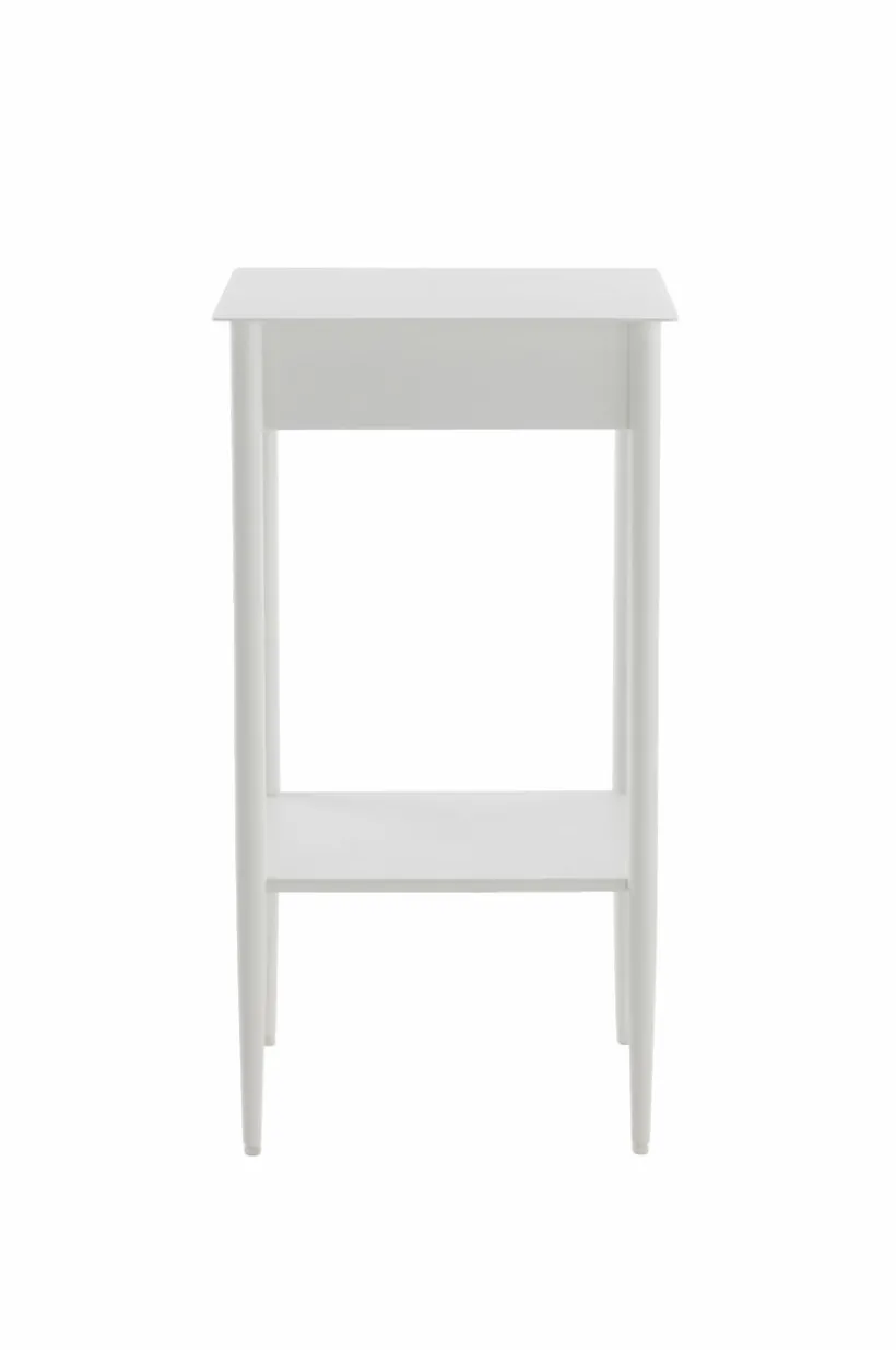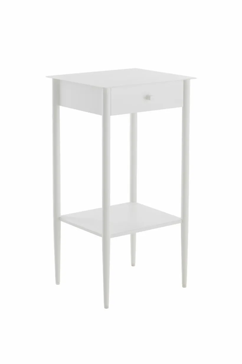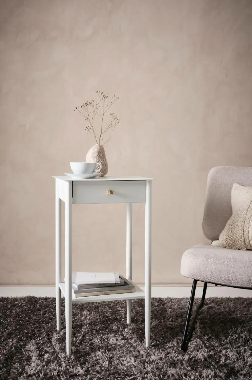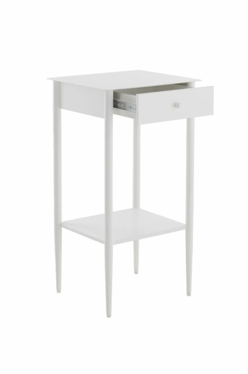 Sidobord av pulverlackat stål med en låda och ett hyllplan. Knoppen i lådan är utbytbar, så du enkelt kan variera stilen på ditt sidobord. Tre knoppar följer med – en kantig metallknopp i matchande färg, en rund mässingsknopp och en kantig mässingsknopp. LYNTON är ett flärdfullt bord i snygg form som passar fint vid soffan och blir en vacker solitär i ditt hem.
