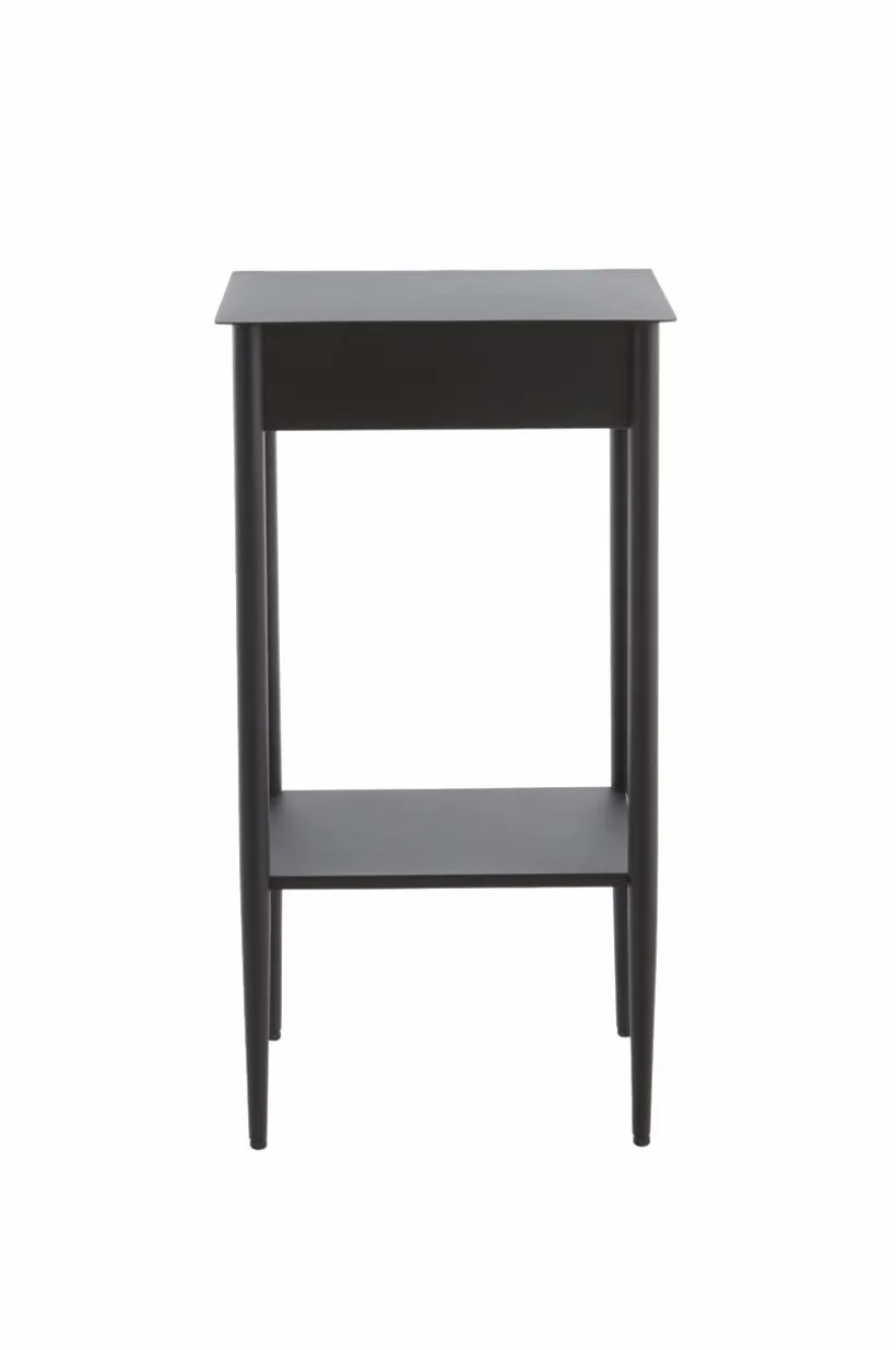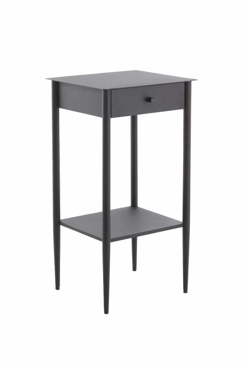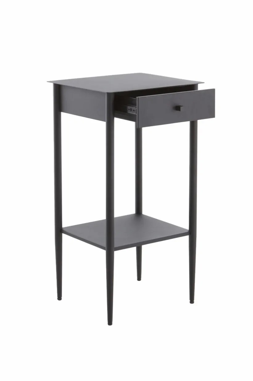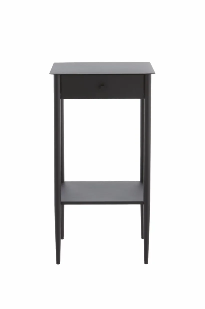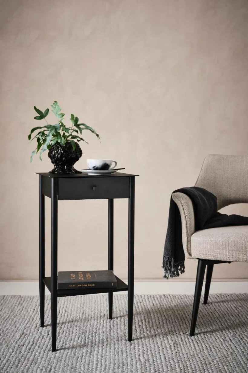 Sidobord av pulverlackat stål med en låda och ett hyllplan. Knoppen i lådan är utbytbar, så du enkelt kan variera stilen på ditt sidobord. Tre knoppar följer med – en kantig metallknopp i matchande färg, en rund mässingsknopp och en kantig mässingsknopp. LYNTON är ett flärdfullt bord i snygg form som passar fint vid soffan och blir en vacker solitär i ditt hem.