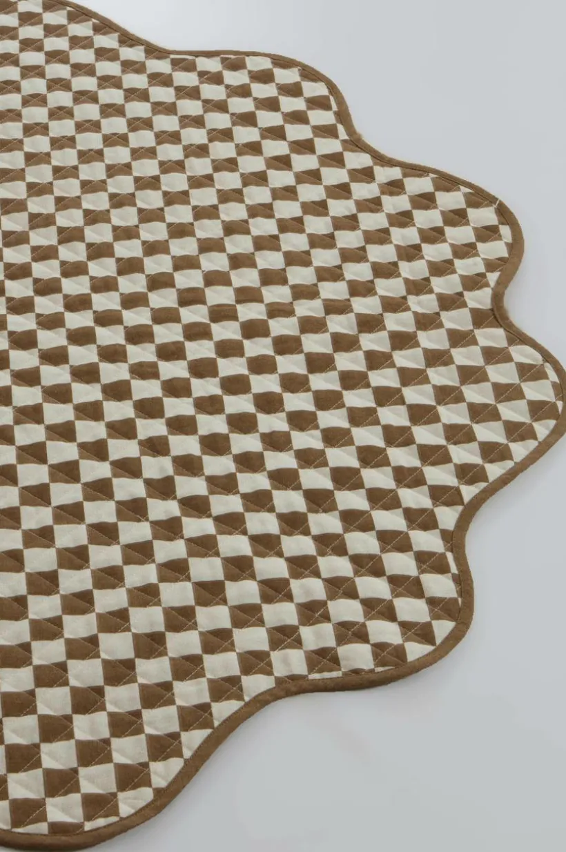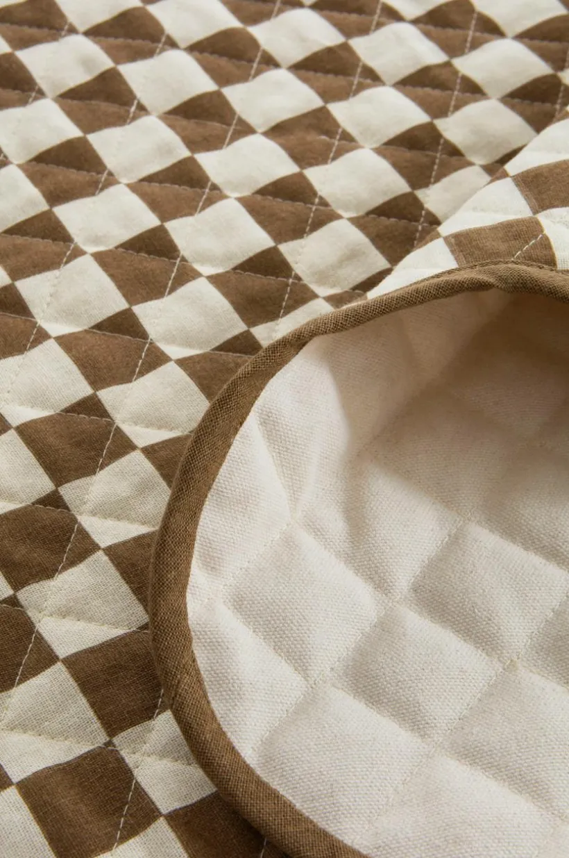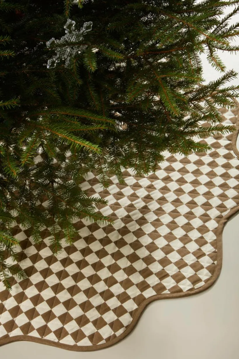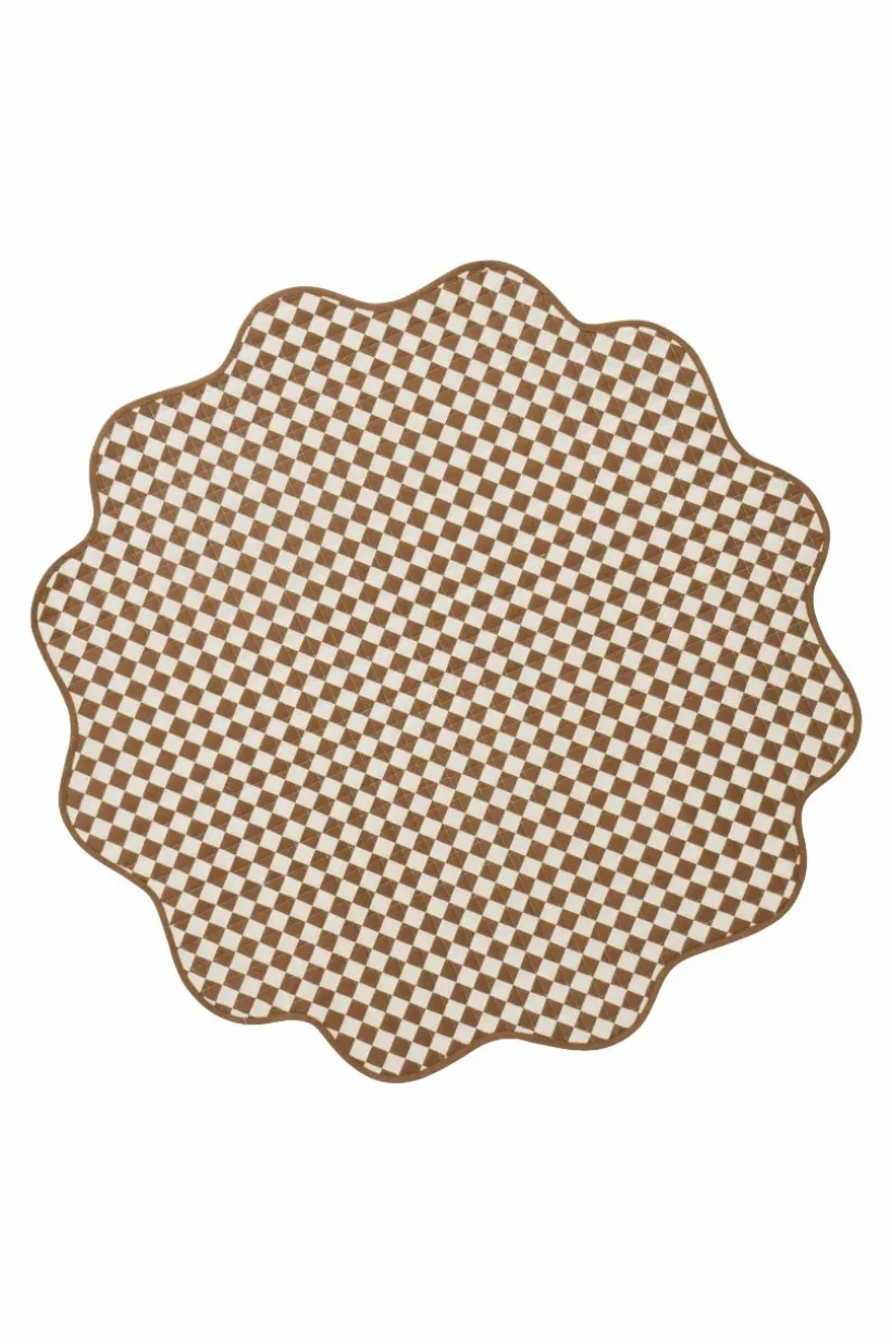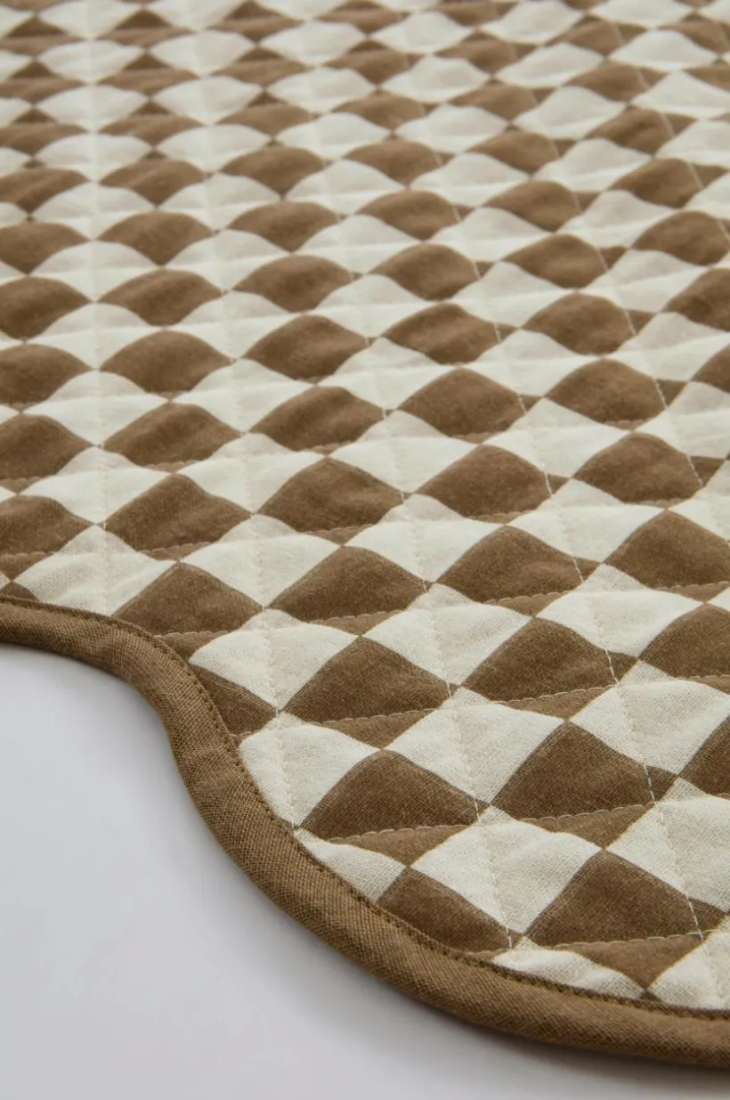 Matta LYRA är charmig med sin blomliknande runda form. Den är tillverkad av bomull med en baksida av bomullscanvas och är perfekt att lägga under julgranen. Mattan är quiltad med tunn stoppning, det tryckta fyrkantiga mönstret och de fina kanterna ger en ombonad känsla. Mattan är vändbar och du kan välja mellan mönster eller enfärgad för att passa din stil.