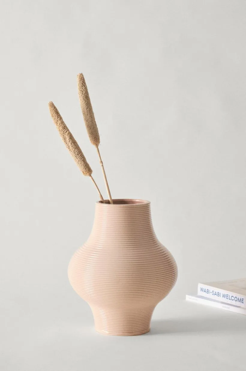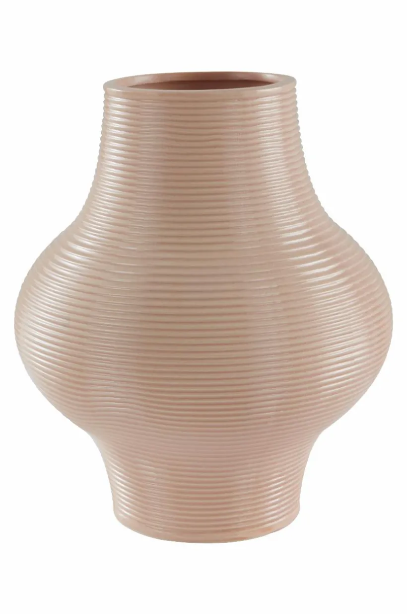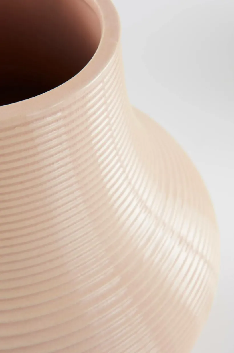 Handgjord vas av keramik. Vasen har mjukt rundad form och smala, vågräta strukturränder, hela vasen har sedan glaserats med en behaglig färgton. Även insidan är glaserad. Det fina hantverket gör varje vas unik. Tänk på att keramik kan släppa igenom fukt.