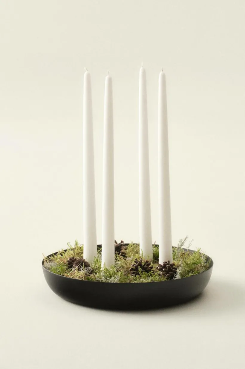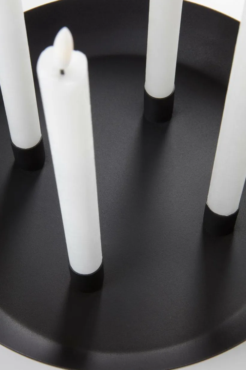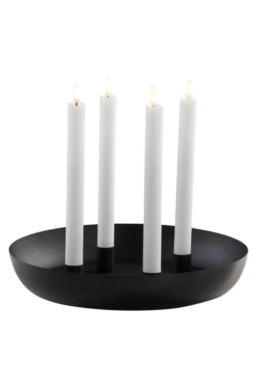 Ljusstake av järn med fyra ljushållare för stearinljus. De fyra ljushållarna har ett rundat fat, vackert som det är eller dekorerat med till exempel små rund stenar. Tänk på brandrisken när du väljer vad du lägger i fatet. Ljusstaken har en matt yta. Ljus medföljer ej.