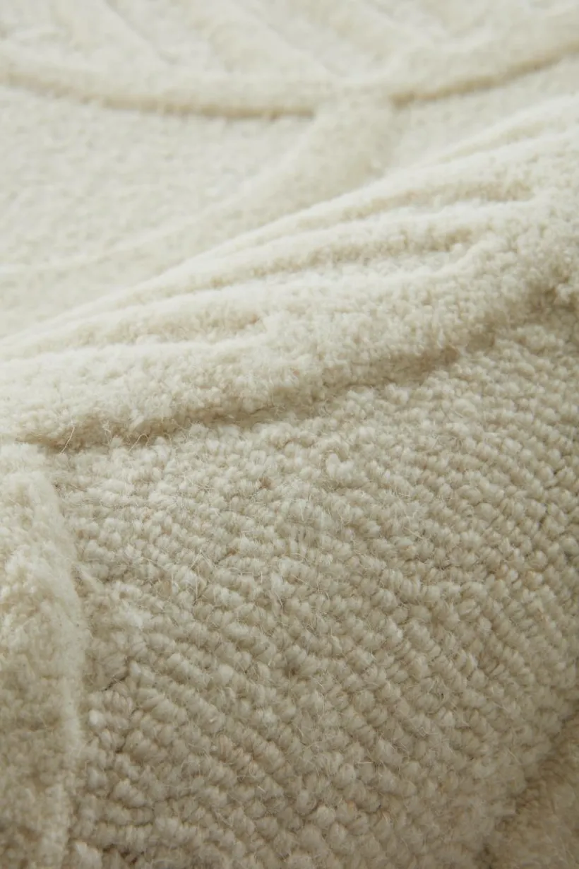 Handtuftad ullmatta som är enfärgad och har diskret blommönster som skapats av vävtekniken i kombination med varierande längd på luggen. Mattan har tät lugg som är mjuk och varm att gå på. Ull ger en naturligt varm och praktiskt smutsavvisande matta. Lugghöjd 0,8-1 cm. Tjocklek 1,6 to 2,5 cm. 3500-3700 g/m².