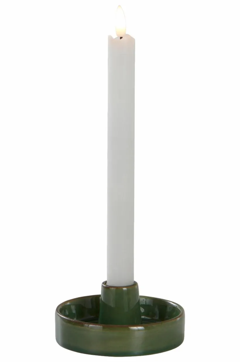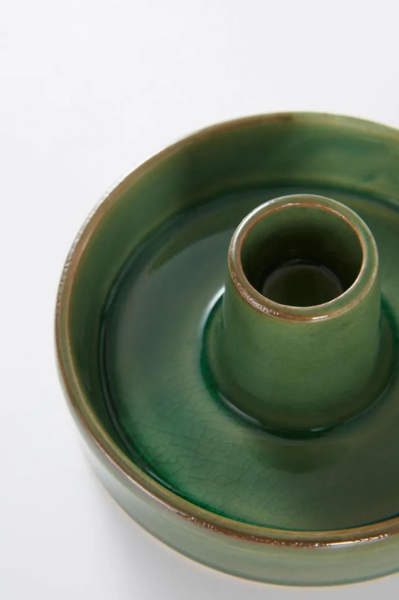 Handgjord ljusstake av keramik. Ljusstaken är stilren och klassisk i sin form och den har glaserats i en fin nyans. Ljusstaken smälter in fint i en gammaldags rustik miljö och den gör sig också bra i en modern, avskalad stil. Den praktiska kanten runt foten gör att stearinet samlas upp om det skulle råka rinna lite, och din duk eller bordsskivan klarar sig från fläckar. Det fina hantverket gör varje ljusstake unik.