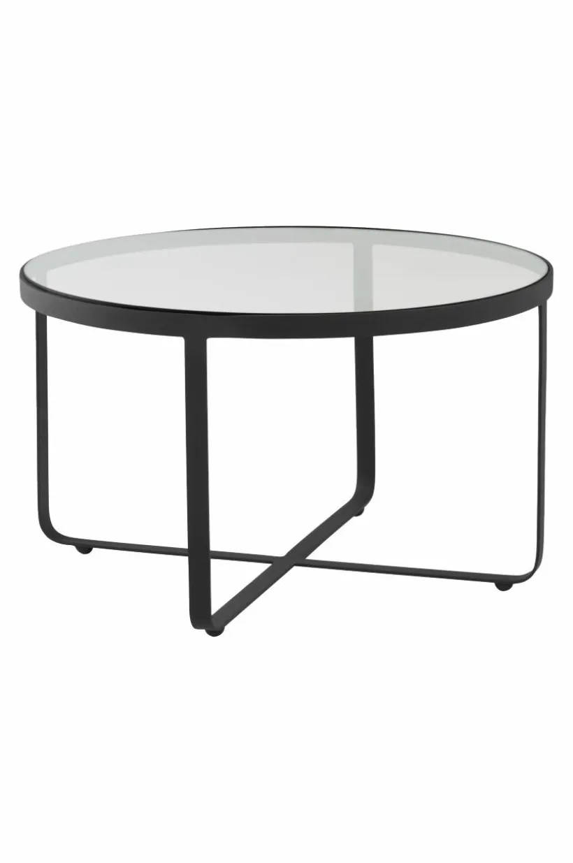 Runt glasbord med fint underrede av järn. MALBUN har en fin detalj i att glasskivan är nedfälld i ramen. Det fyrbenta underredet skapar ett kryss under bordet. Underredet är målat och har matt yta med lätt struktur.