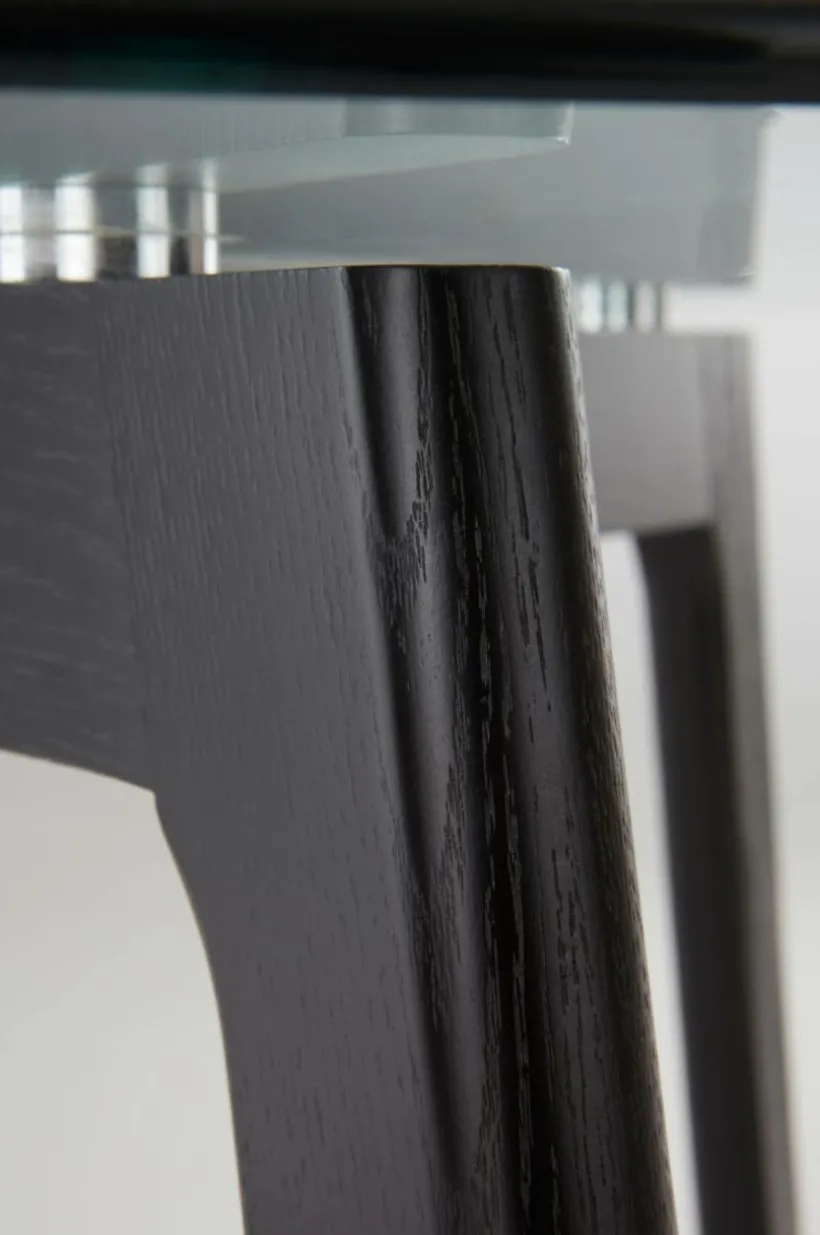 Stilrent matbord i massiv ek, toppat med en glasskiva som ger luftig känsla. Underredets snygga konstruktion syns dekorativt genom bordsskivan. Glasskivan har fästen under som skruvas fast i benen/underredet. Viss montering krävs. Monteringsanvisning medföljer.