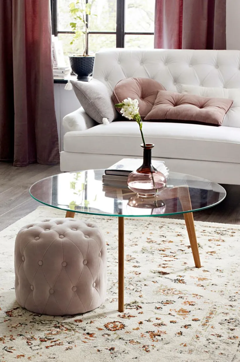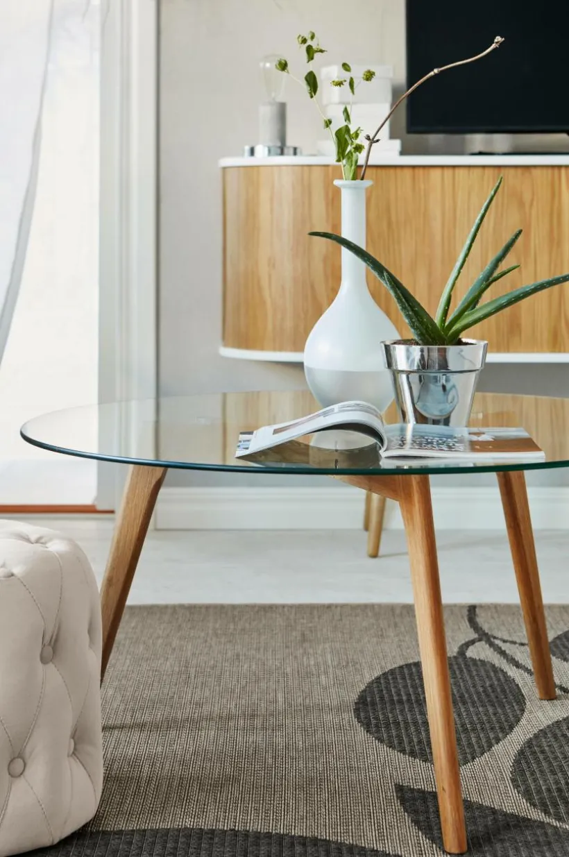 Tips/råd: Välj gärna en mönstrad matta till bordet som exponeras snyggt genom glasskivan.