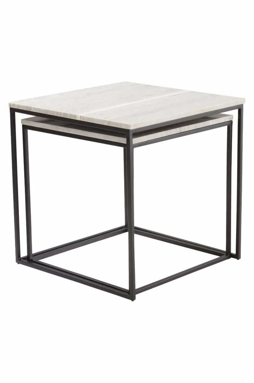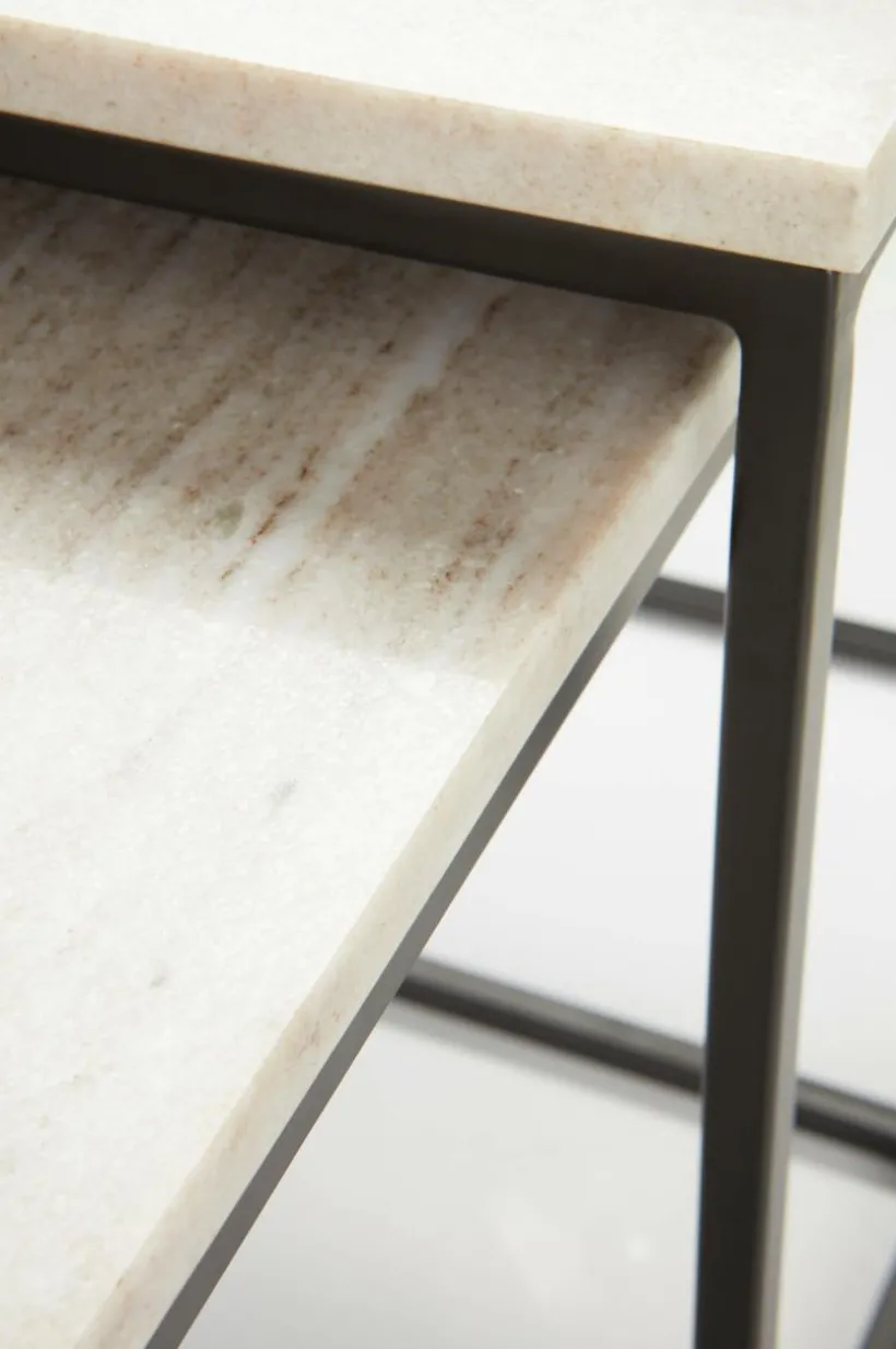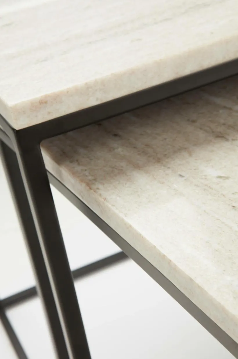 Sidobord i 2-pack och borden fungerar som ett klassiskt satsbord, där du kan skjuta in det ena bordet under det andra. MALMA har stomme av järn och bordsskivorna är av marmor. I tidlös design med spännande materialmix av massiv marmor och lackad metall, får du ett satsbord som du har glädje av i många år framöver. Marmor är en natursten och mönstret varierar alltid lite beroende på bergartens sammansättning, vilket gör varje möbel unik. Stommen är pulverlackerad.