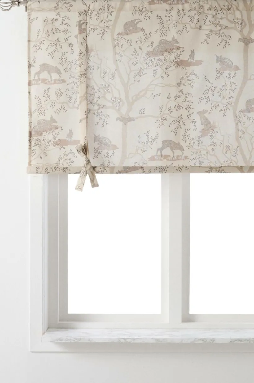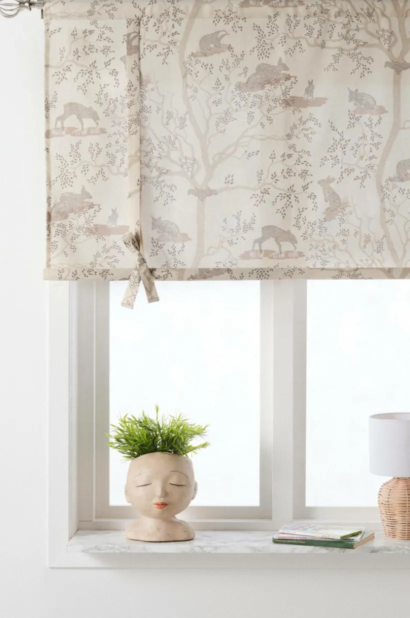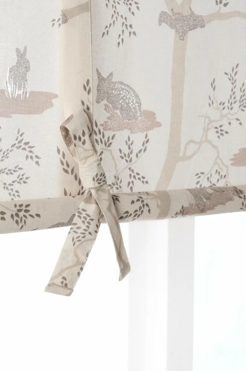 Roll up-gardin i mönstertryckt bomull med mjuk yta. Hängs på gardinstång. Höjden regleras med knytband.