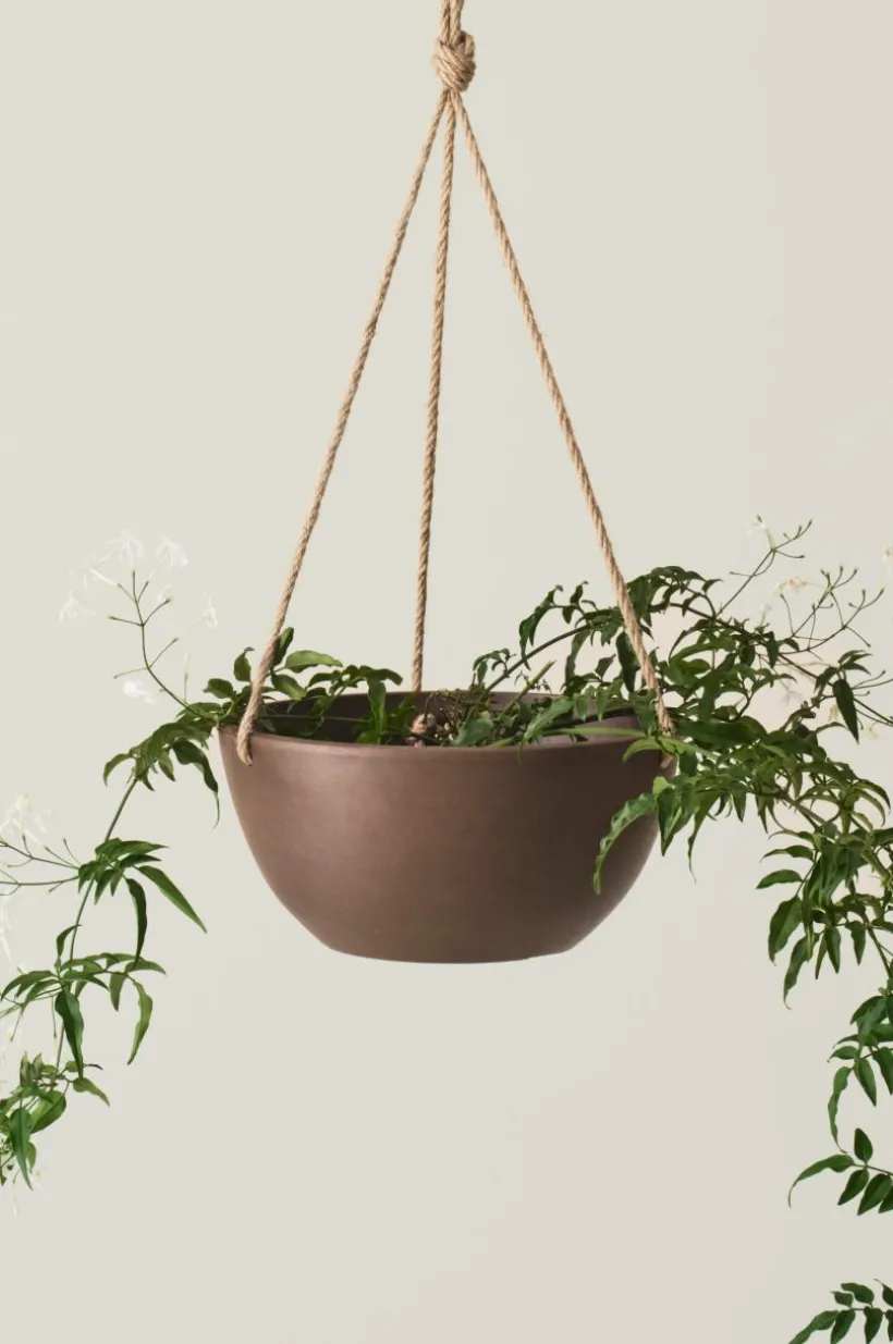 Ampelkrukan har snören för upphängning. Snöret är tillverkat av jute, som är ett naturmaterial. Jute påverkas av sol och vatten och bryts ner med tiden.