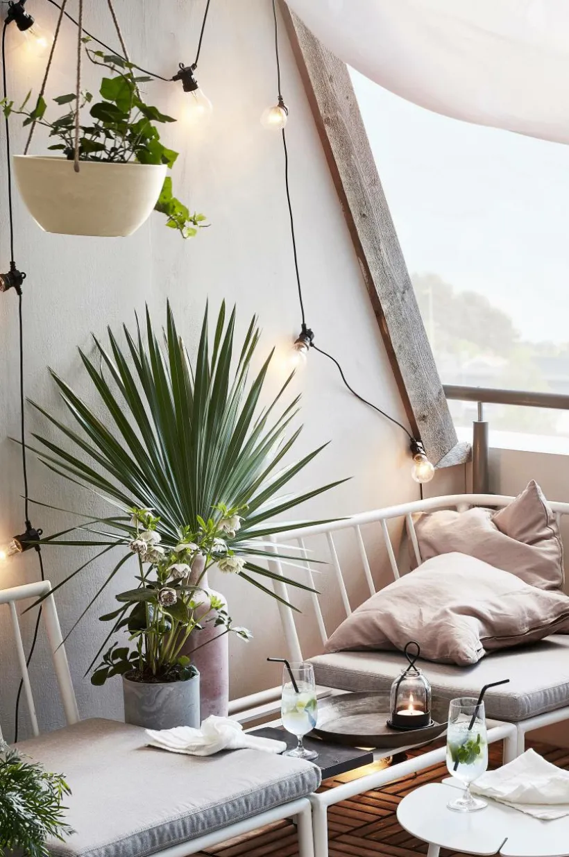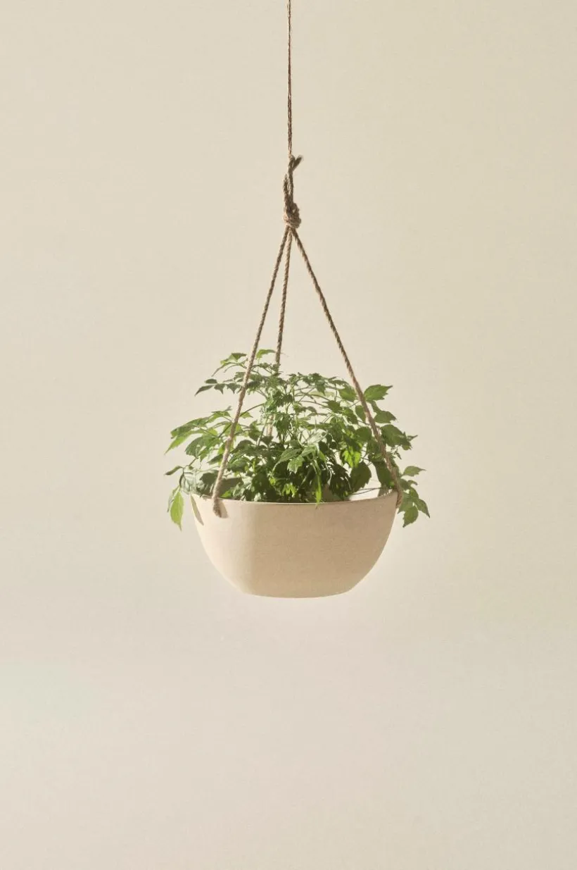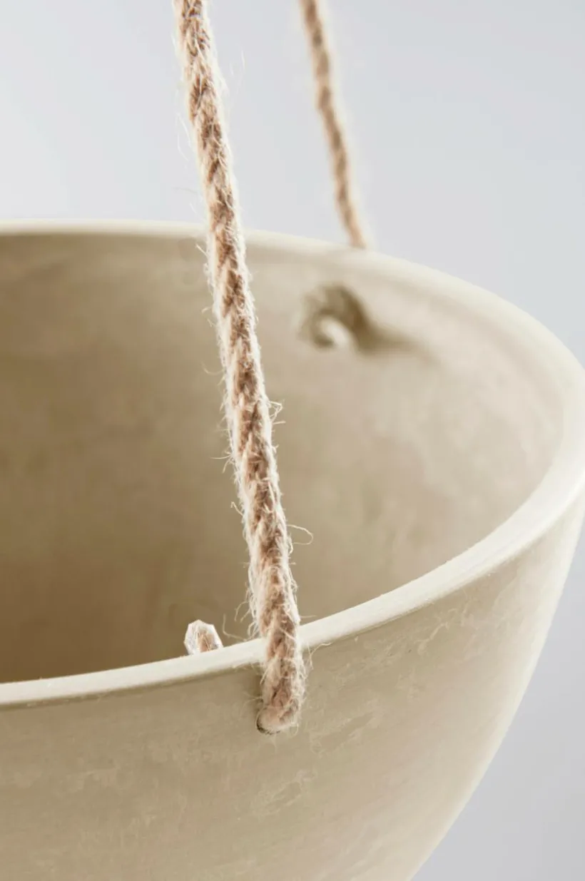Ampelkrukan har snören för upphängning. Snöret är tillverkat av jute, som är ett naturmaterial. Jute påverkas av sol och vatten och bryts ner med tiden.
