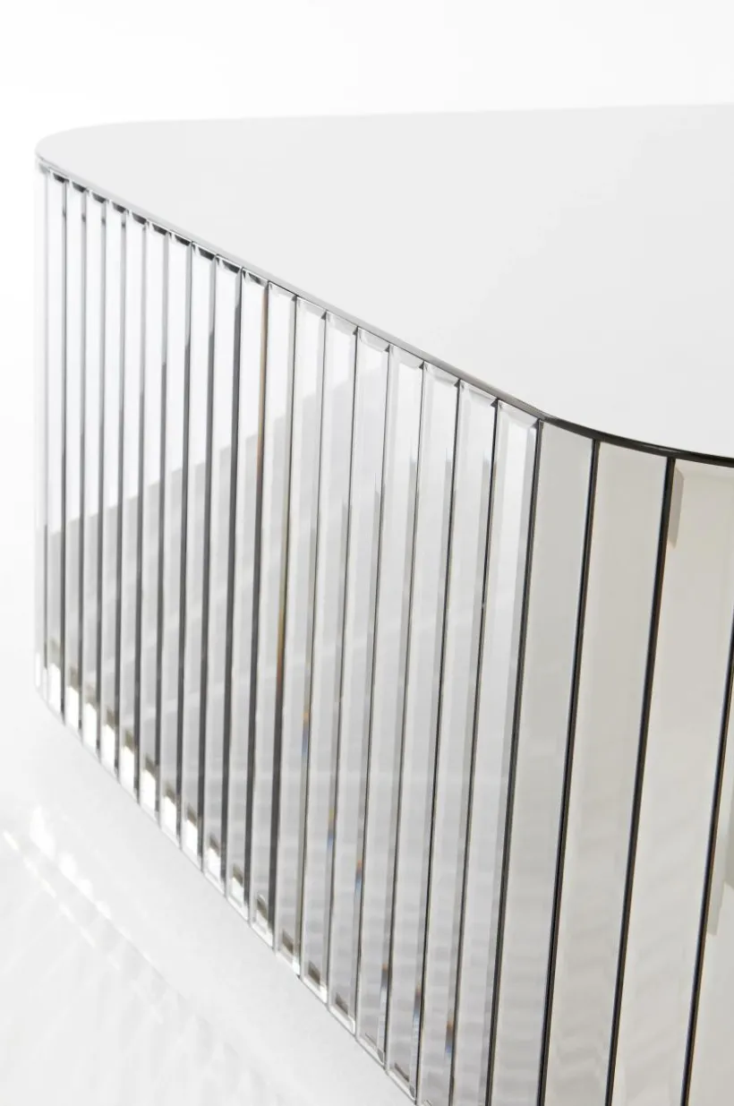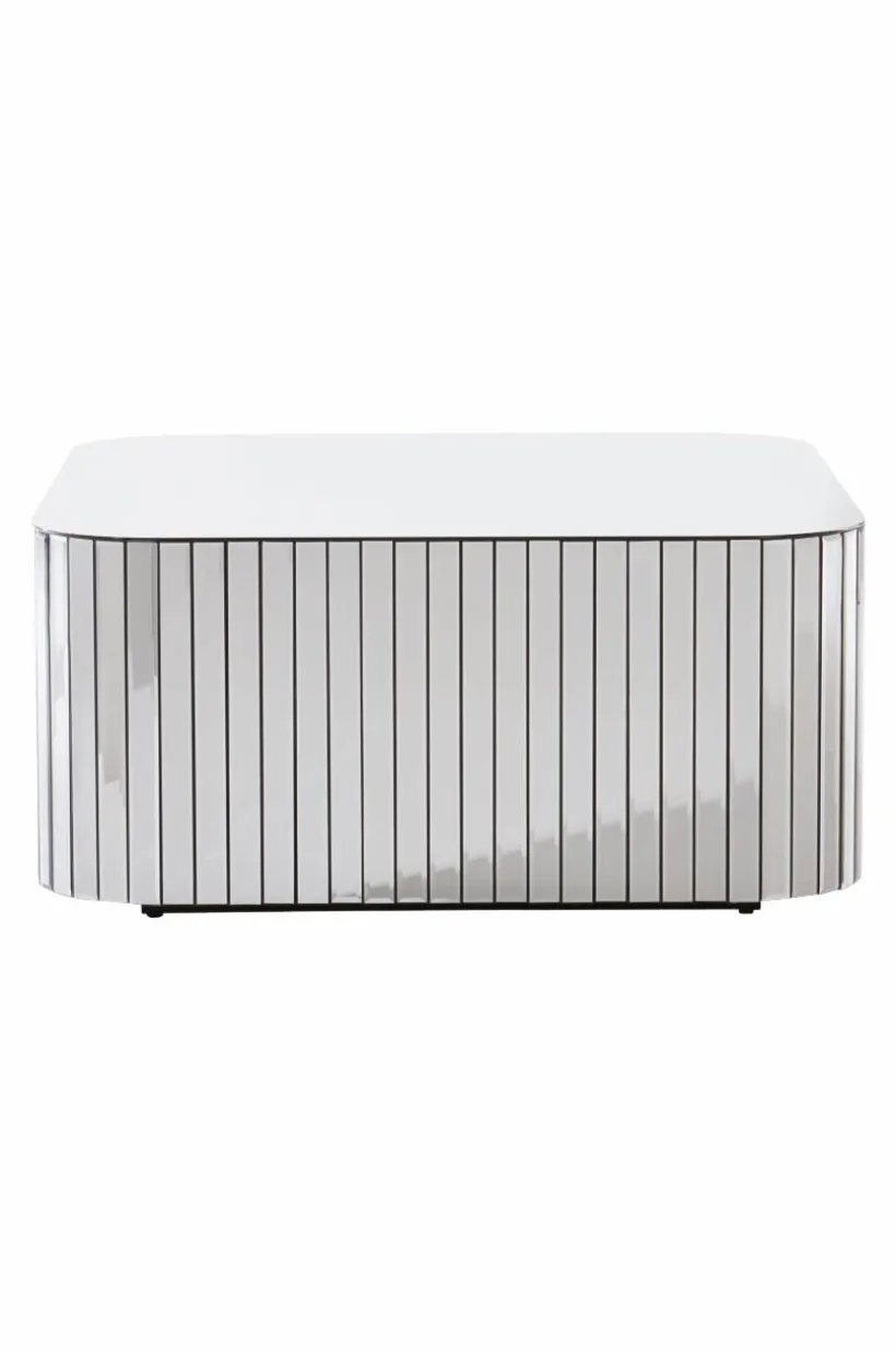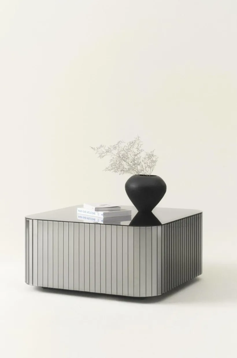 Kvadratiskt soffbord med bordsskiva och stående paneler runt om av rökfärgat glas. Bordets hörn är rundade och glaspanelerna på sidorna har fasade kanter. Stommen är av FSC-märkt MDF.