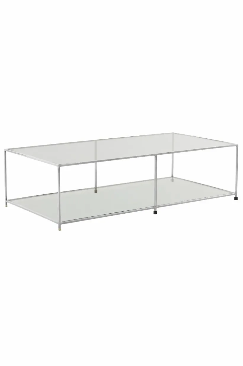 Rektangulärt soffbord i metall och klarglas. Den nätta, smidiga metallstommen har både avlastningsyta och borsskiva i klarglas vilket förstärker möbelns lätta känsla.