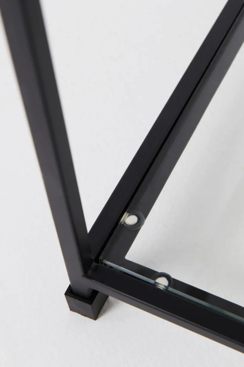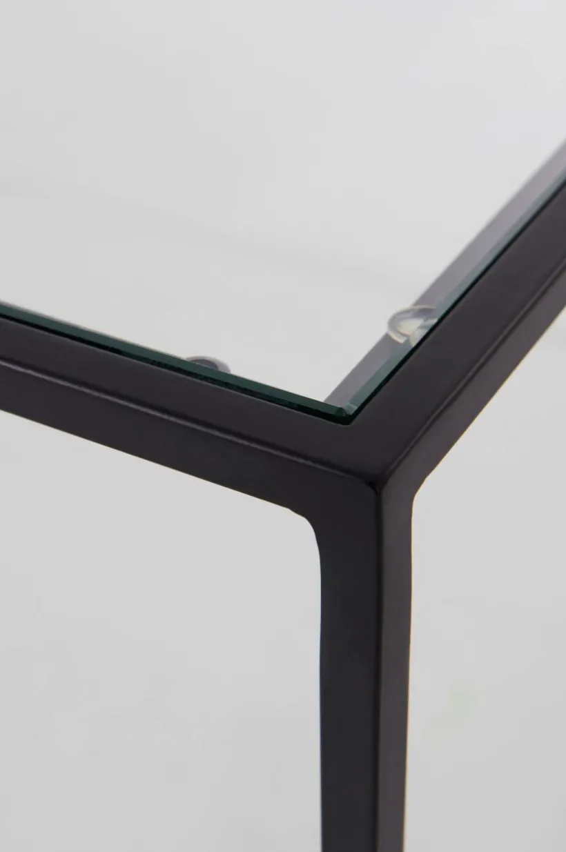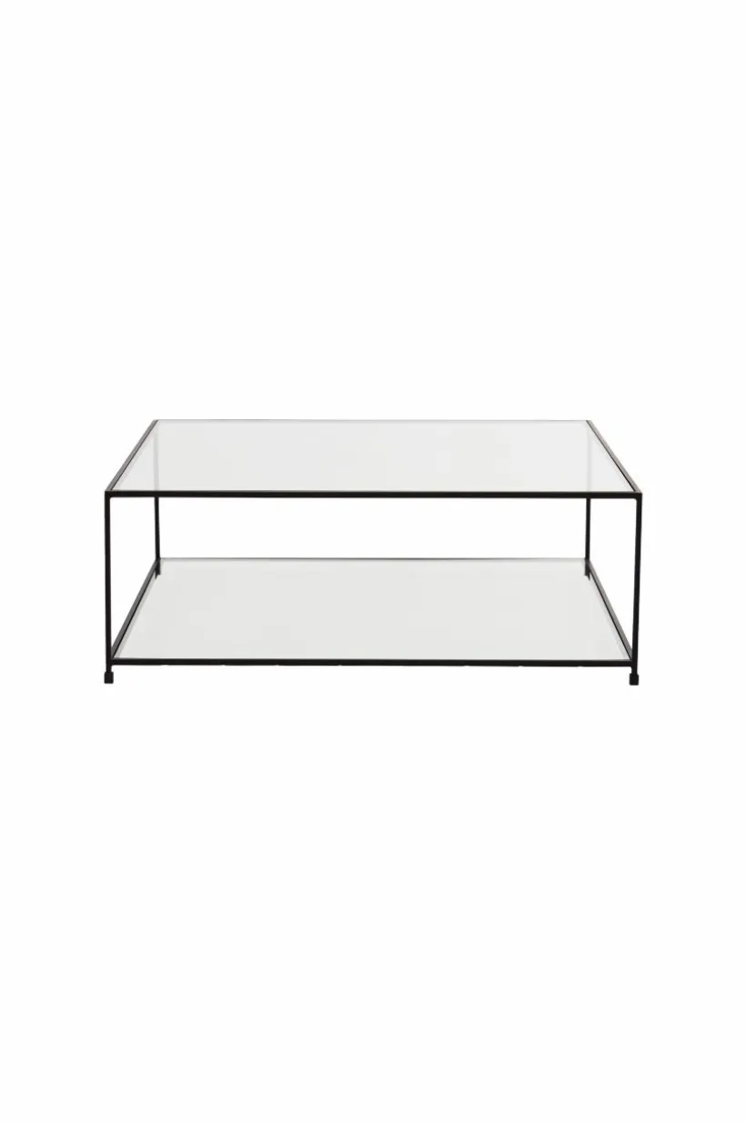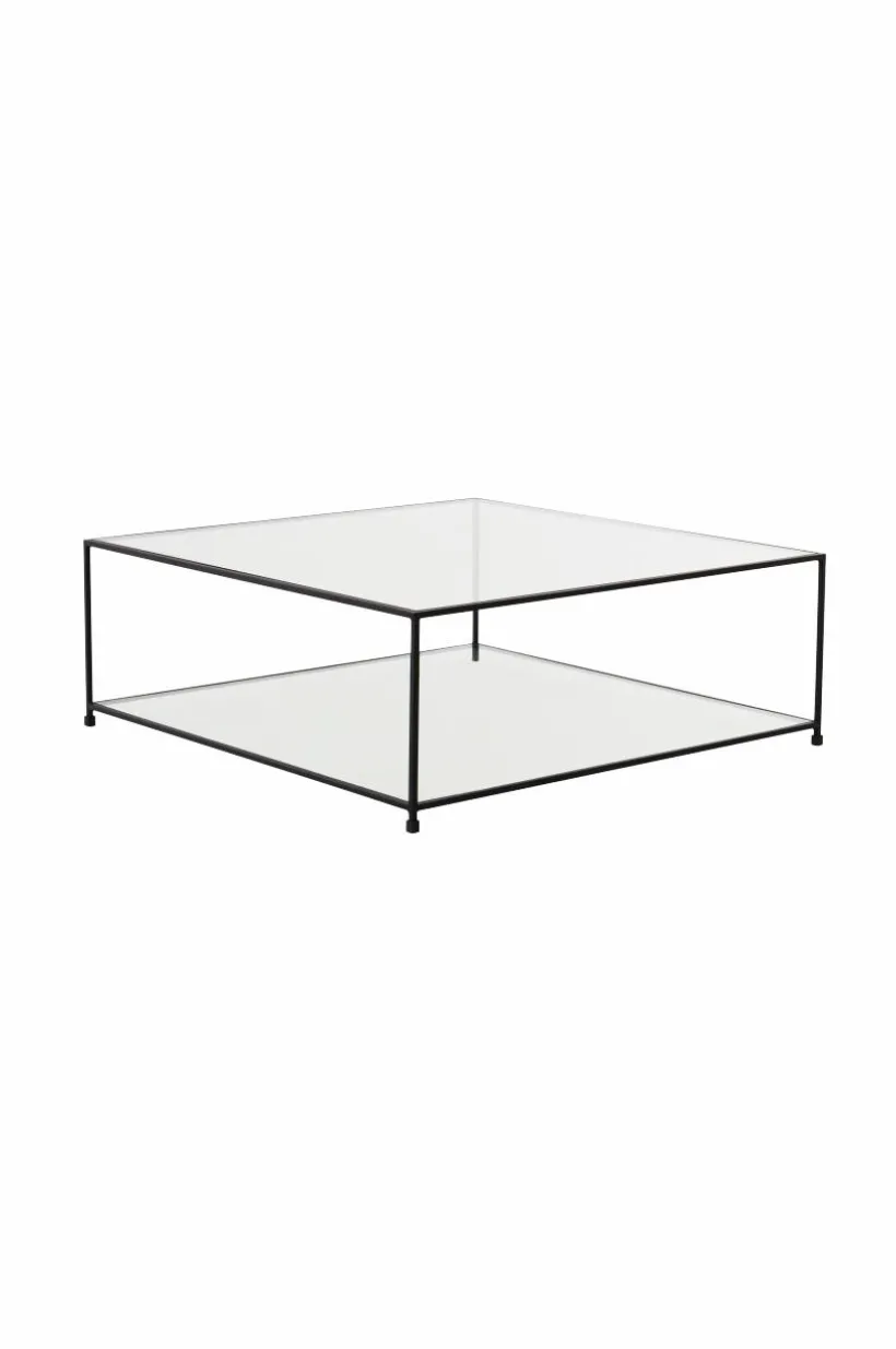 Kvadratiskt soffbord i metall och klarglas. Den nätta, smidiga metallstommen har både avlastningsyta och borsskiva i klarglas vilket förstärker möbelns lätta känsla.