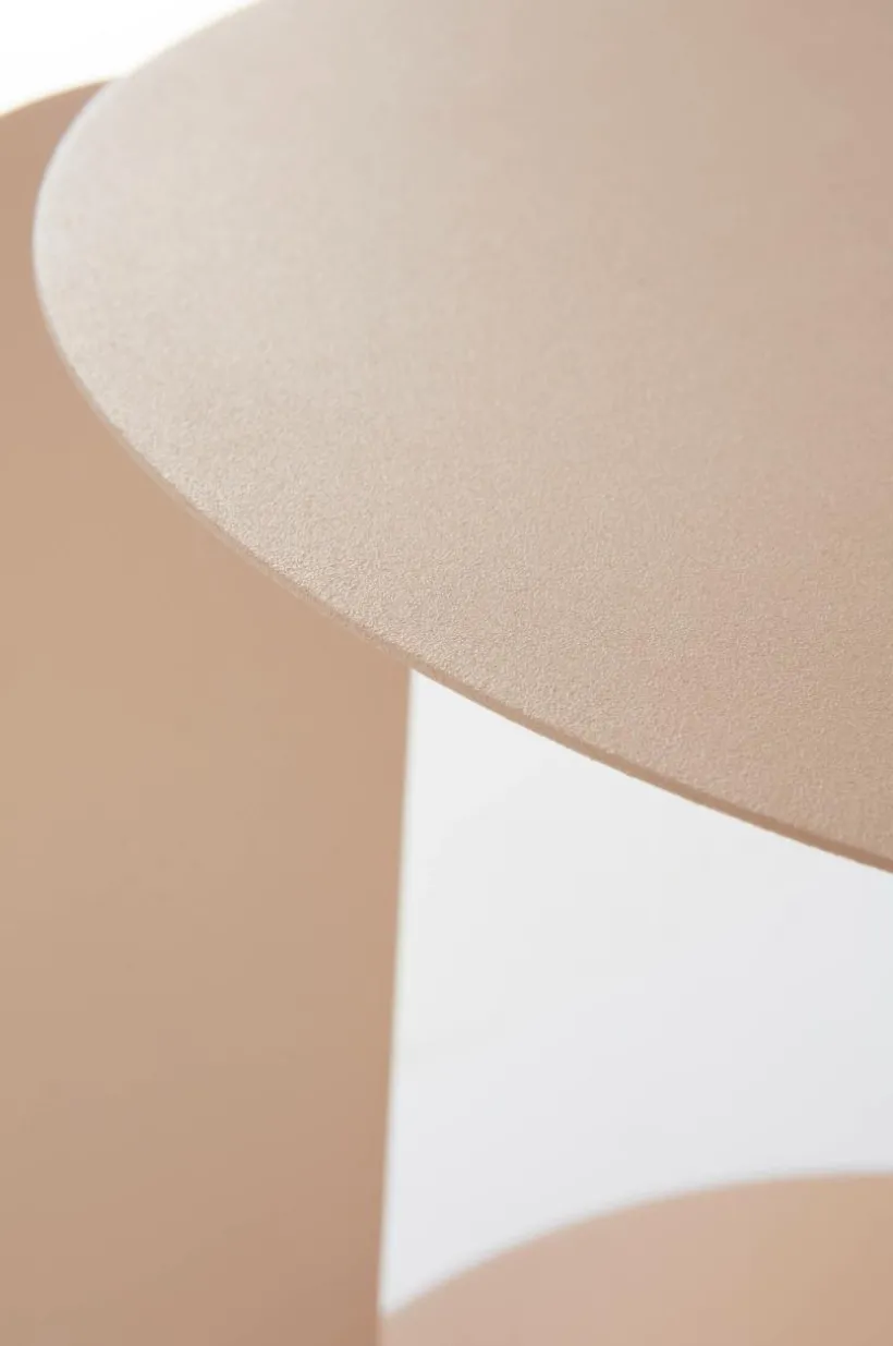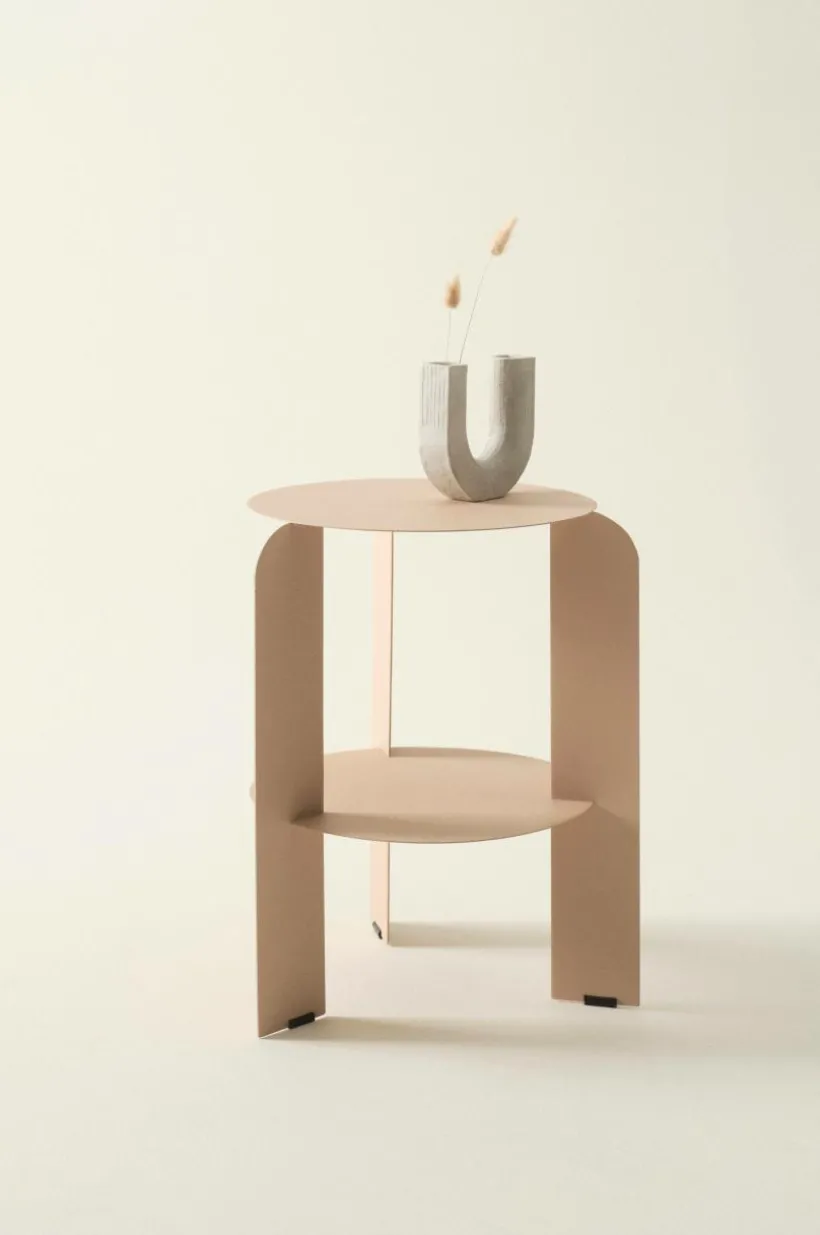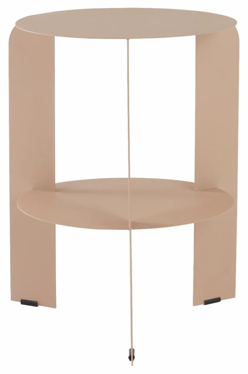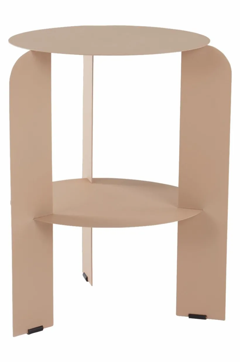 MAUREN är ett runt sidobord av järn med en tunn bordsskiva på toppen och en lika tunn avlastningsskiva under den. De tre benen är raka med rundat hörn upptill och de sticker ut lite utanför bordsskivan. Bordet är målat med färg som ger lätt struktur. Små gummiskydd under benen skyddar ditt golv.