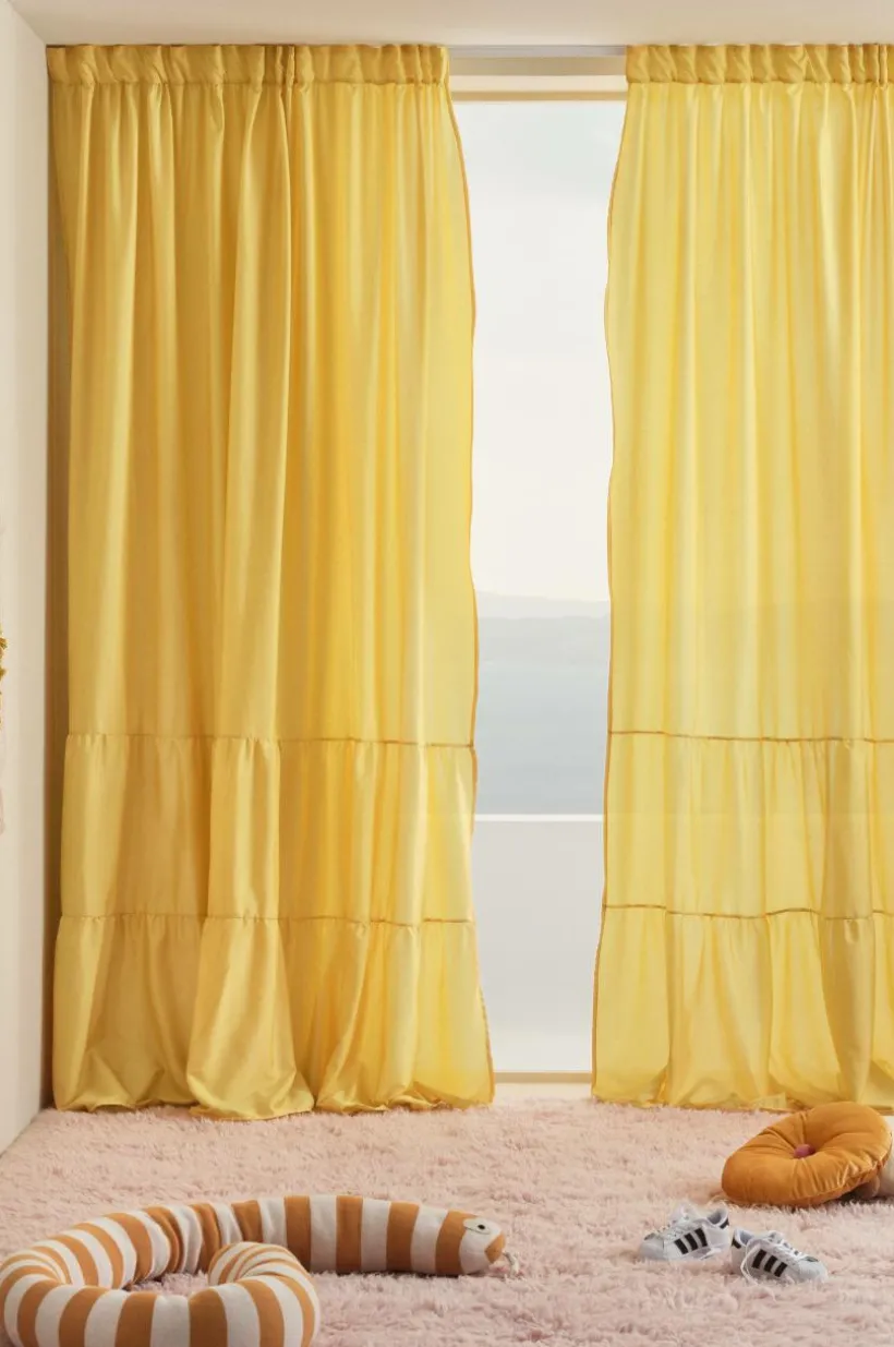 Två gardinlängder i enfärgat tyg av polyester i fina färger som skimrar och glittrar lite lätt. Längderna har breda volanger nedtill, en fin detalj som gör längderna speciella. Påsytt multifunktionsband upptill. Gardinen kan hängas upp med fingerkrokar, kanal samt dold hälla.