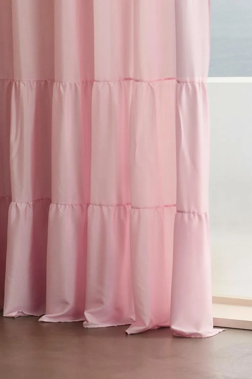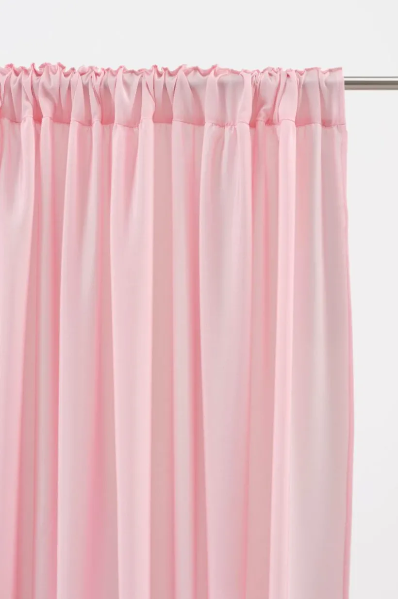 Två gardinlängder i enfärgat tyg av polyester i fina färger som skimrar och glittrar lite lätt. Längderna har breda volanger nedtill, en fin detalj som gör längderna speciella. Påsytt multifunktionsband upptill. Gardinen kan hängas upp med fingerkrokar, kanal samt dold hälla.