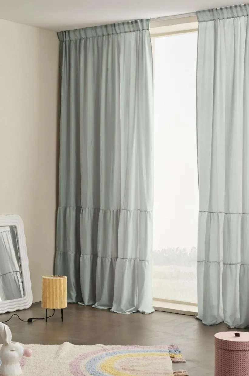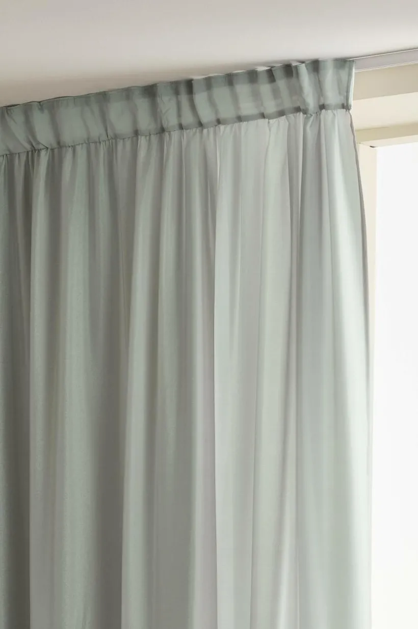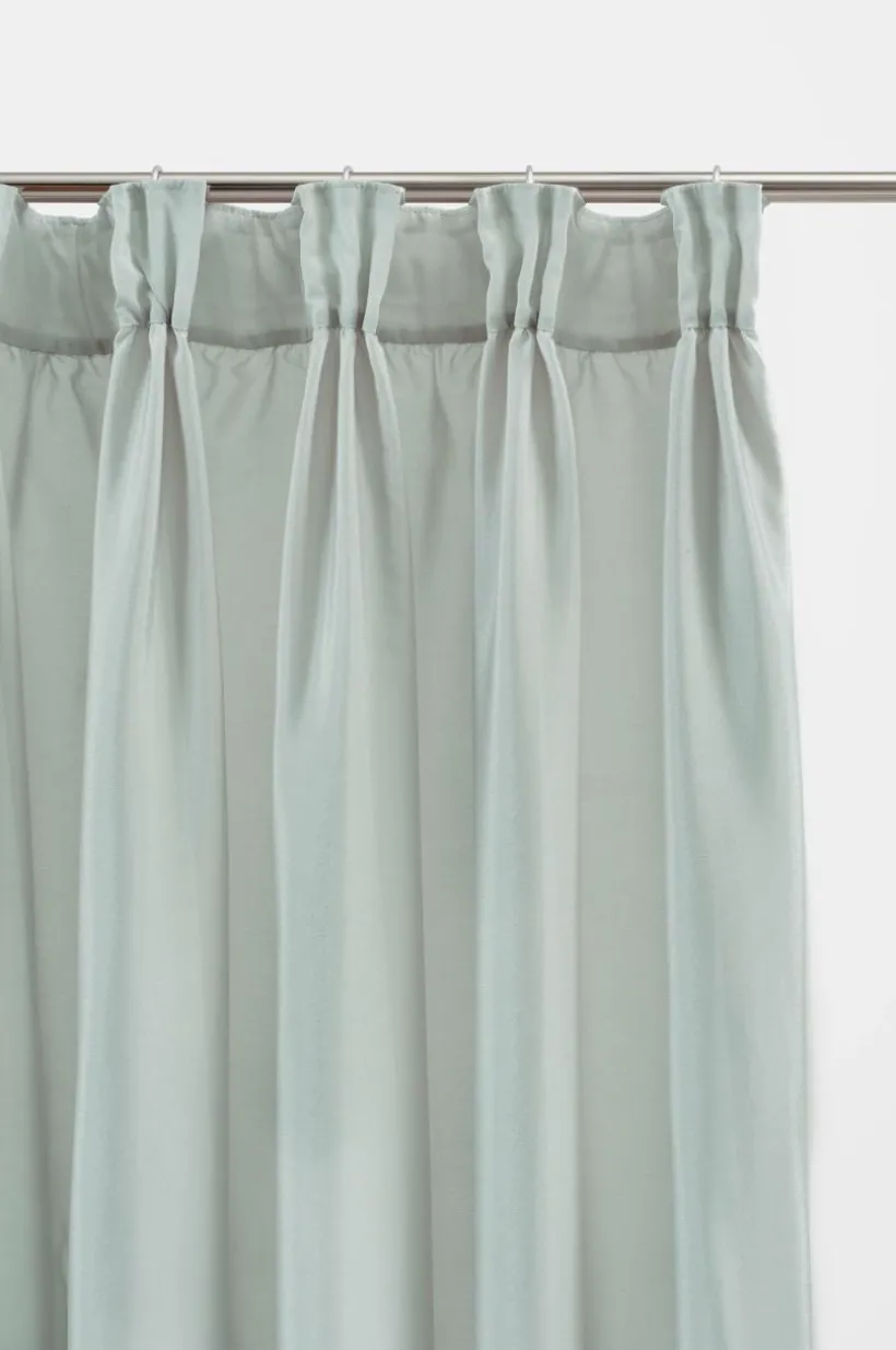 Två gardinlängder i enfärgat tyg av polyester i fina färger som skimrar och glittrar lite lätt. Längderna har breda volanger nedtill, en fin detalj som gör längderna speciella. Påsytt multifunktionsband upptill. Gardinen kan hängas upp med fingerkrokar, kanal samt dold hälla.