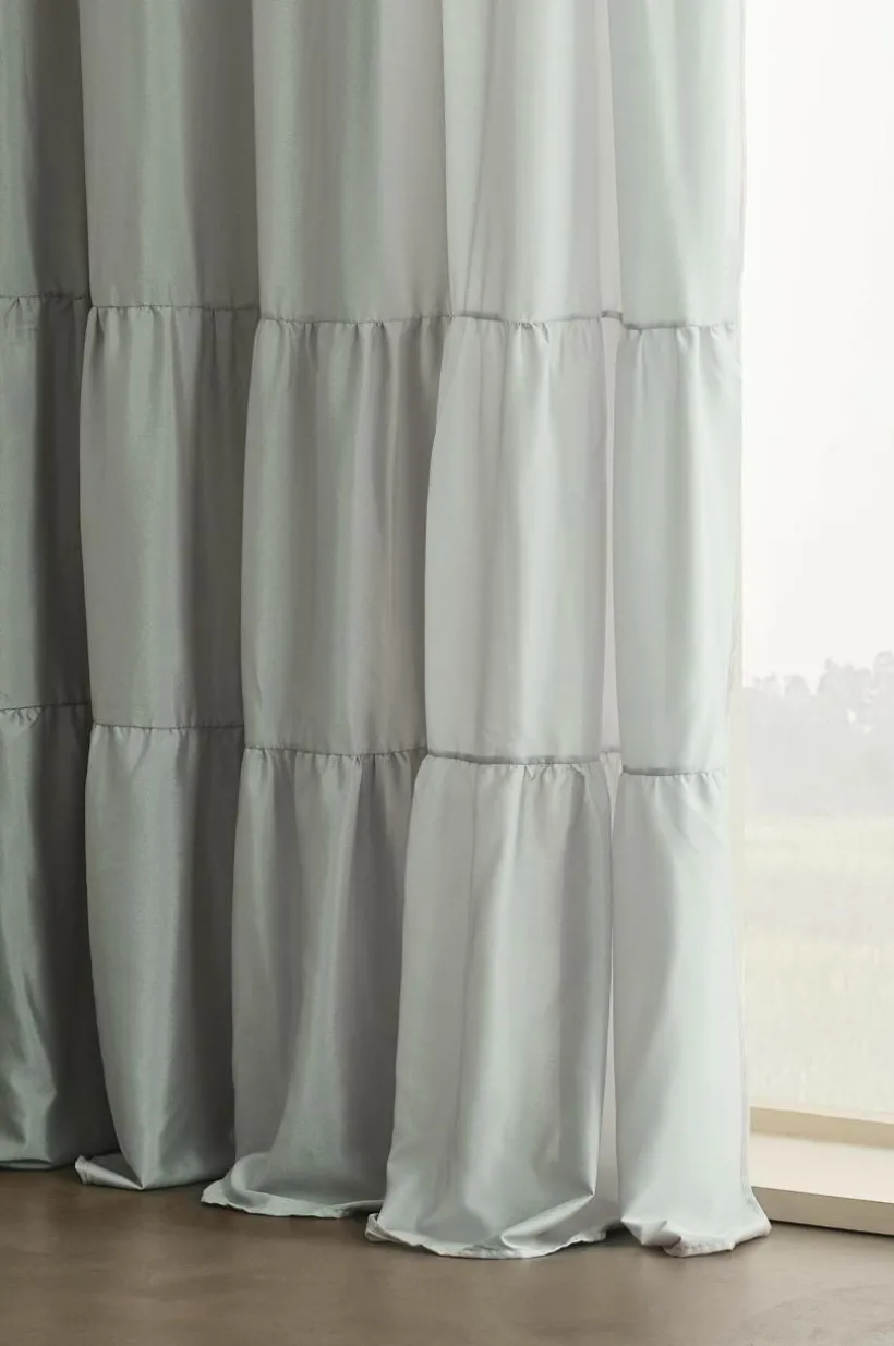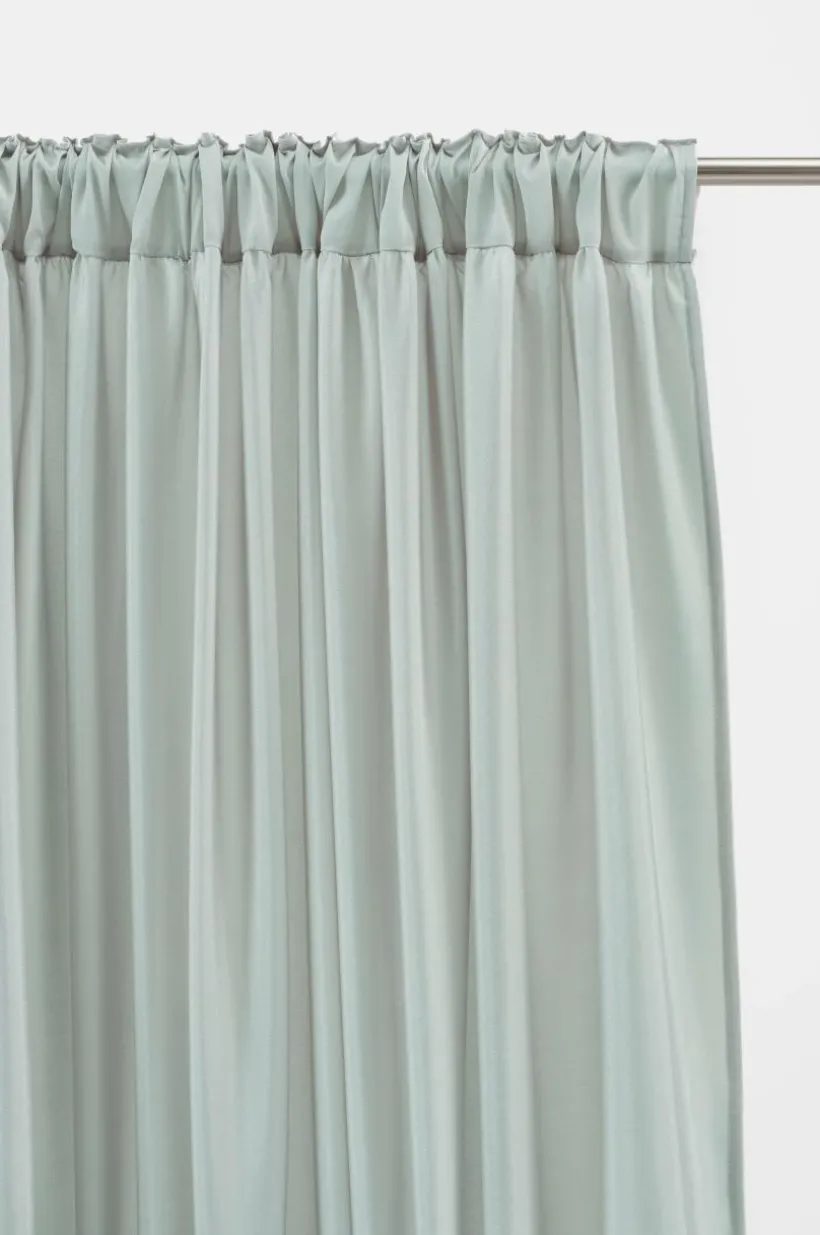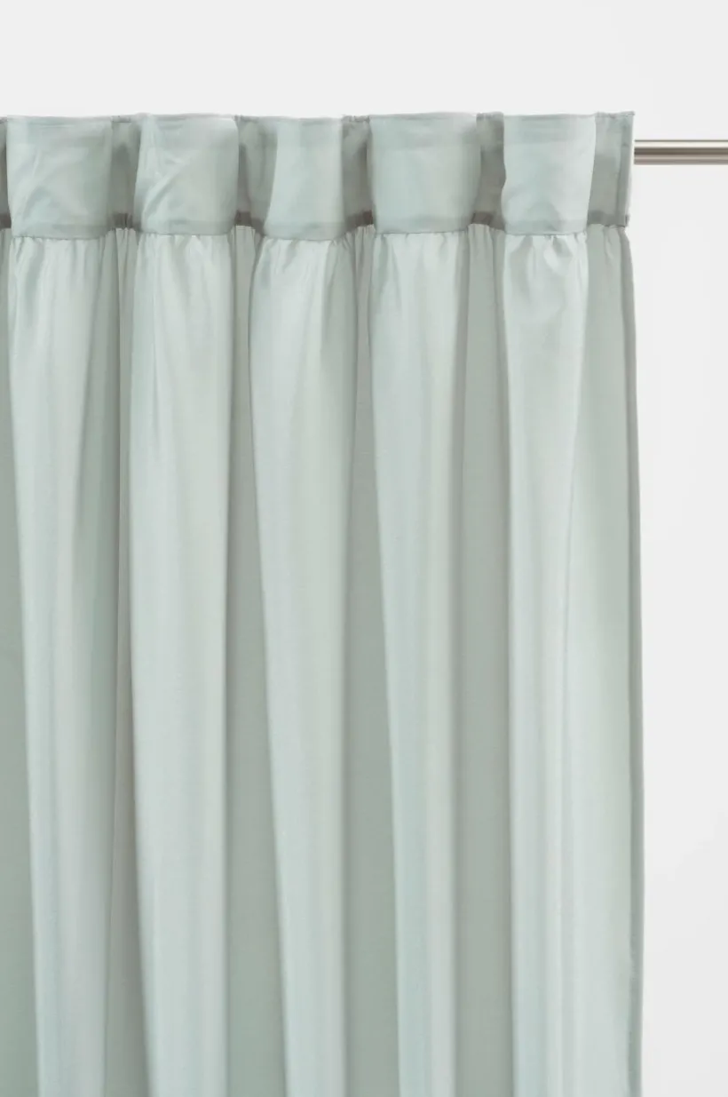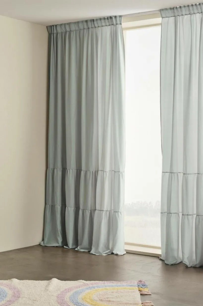 Två gardinlängder i enfärgat tyg av polyester i fina färger som skimrar och glittrar lite lätt. Längderna har breda volanger nedtill, en fin detalj som gör längderna speciella. Påsytt multifunktionsband upptill. Gardinen kan hängas upp med fingerkrokar, kanal samt dold hälla.