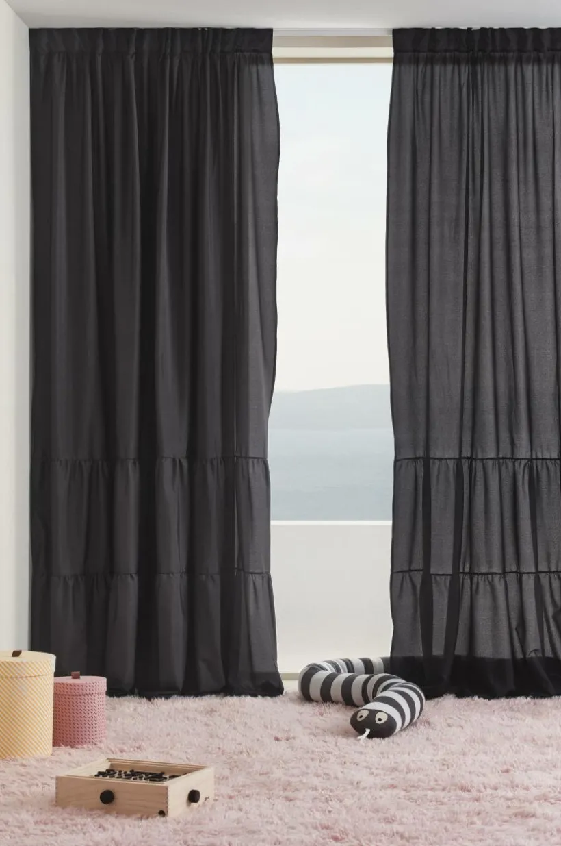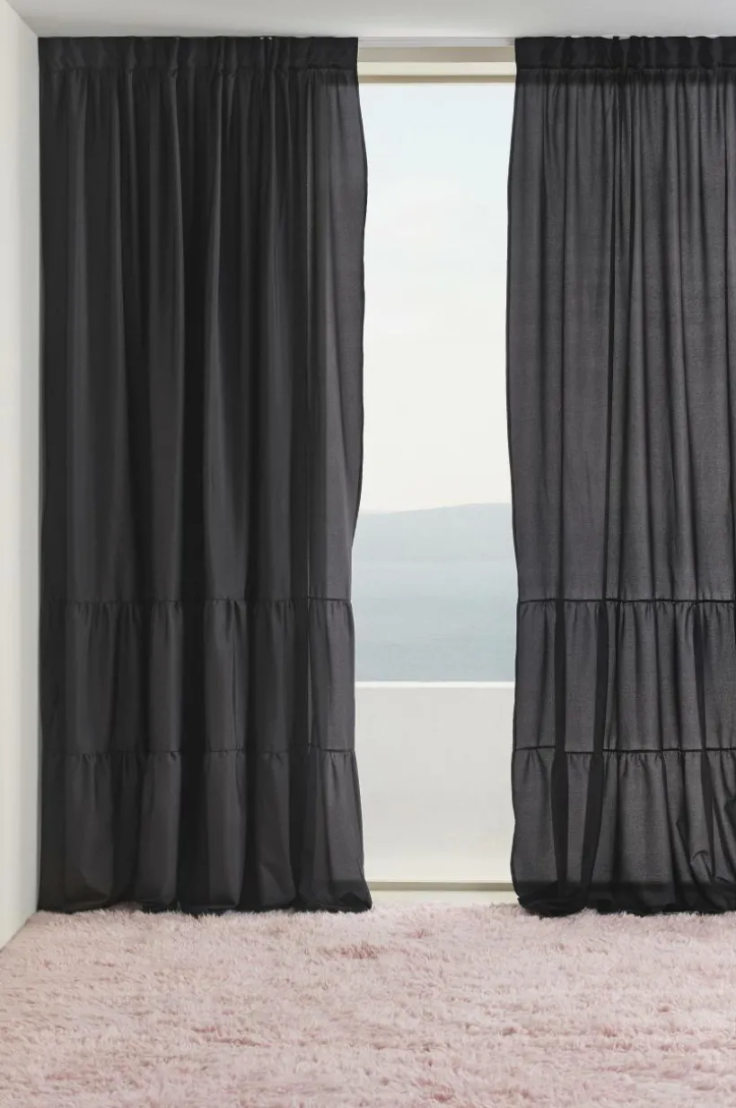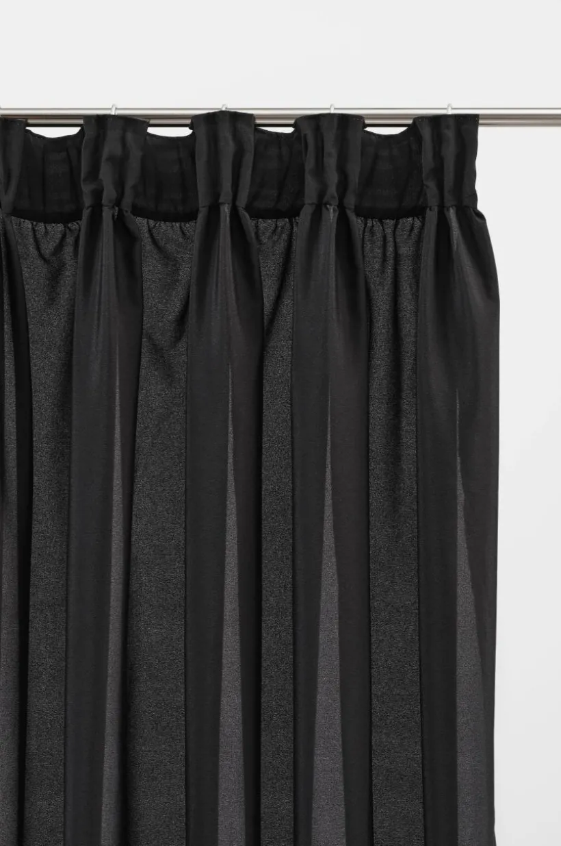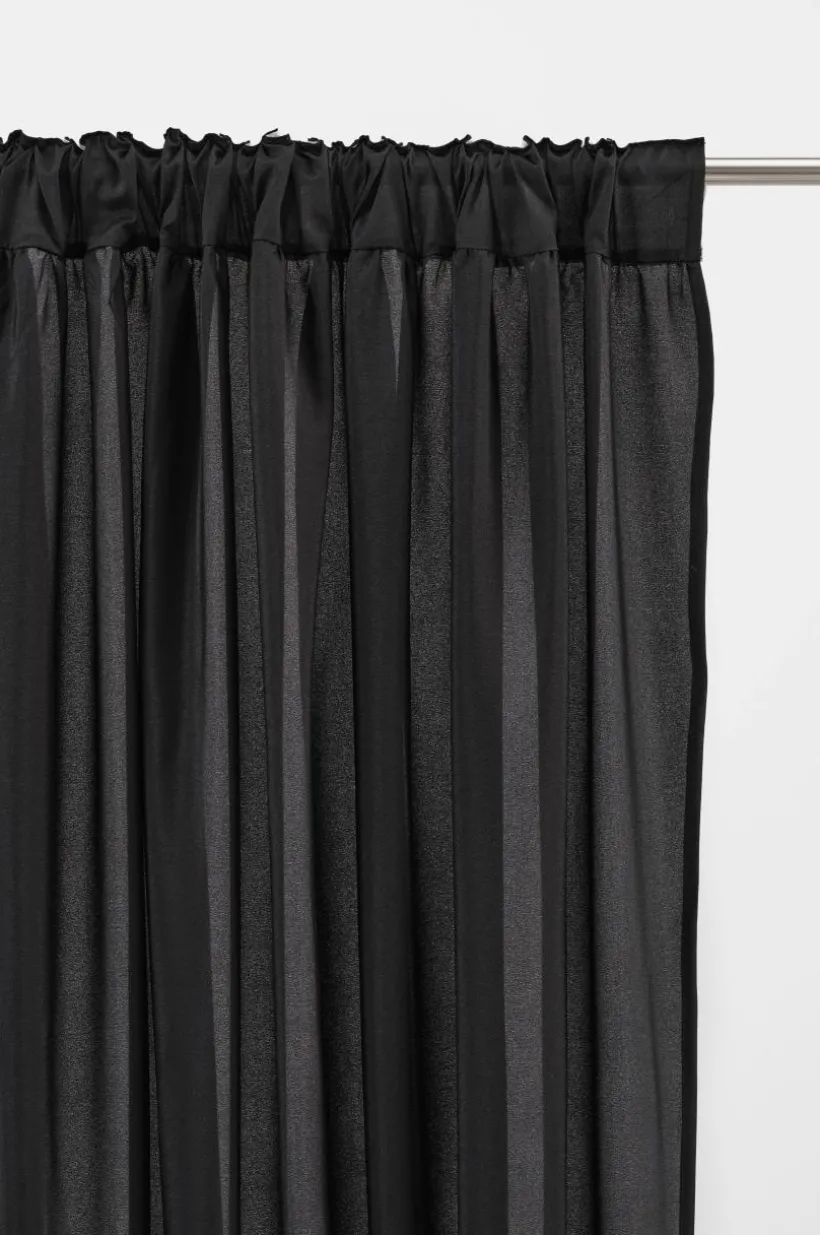 Två gardinlängder i enfärgat tyg av polyester i fina färger som skimrar och glittrar lite lätt. Längderna har breda volanger nedtill, en fin detalj som gör längderna speciella. Påsytt multifunktionsband upptill. Gardinen kan hängas upp med fingerkrokar, kanal samt dold hälla.