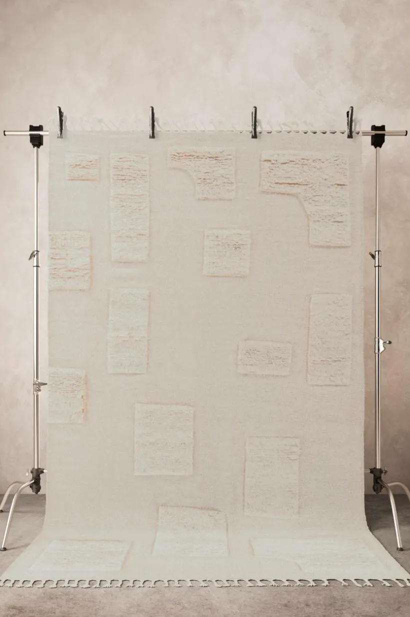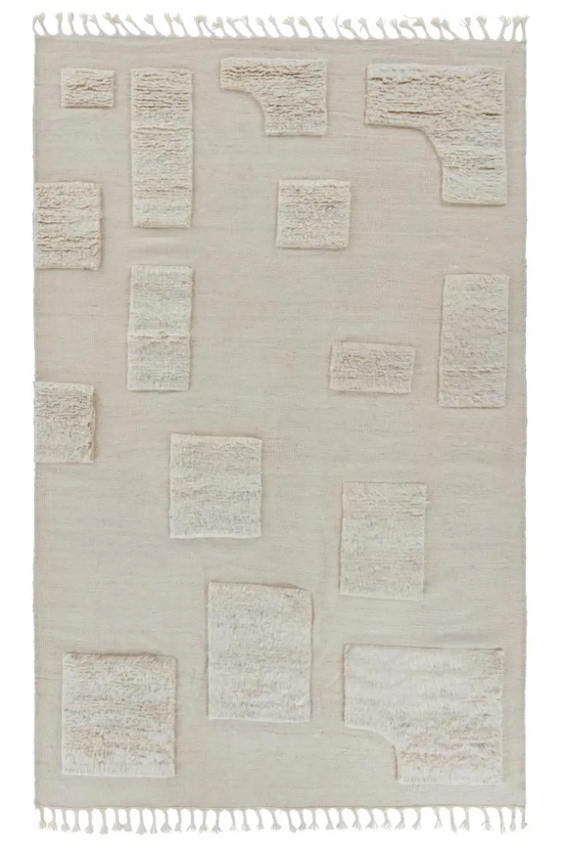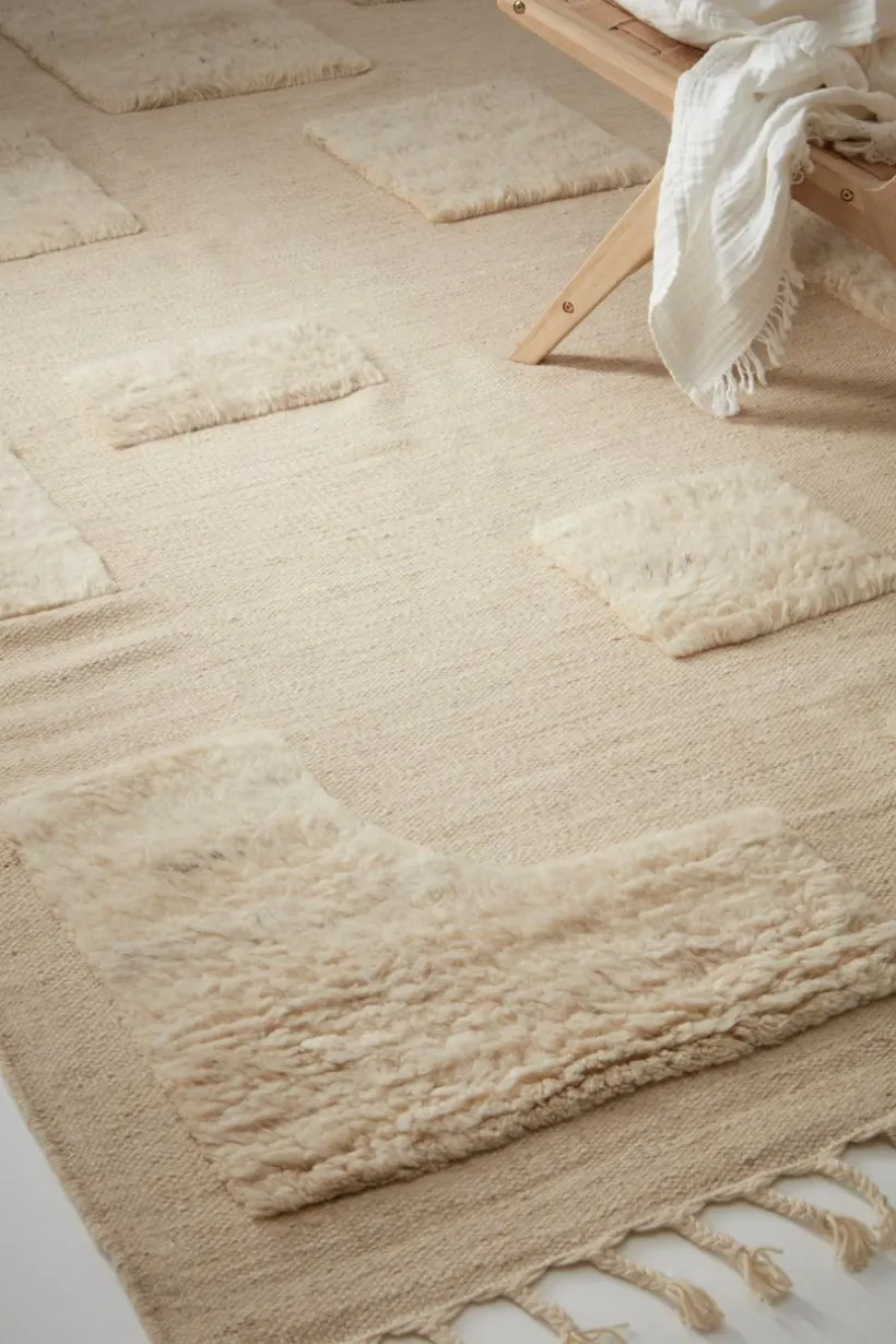Handknuten ullmatta som har slätvävd botten och mönstret av fyrkanter skapas av den knutna lugggen. Mattan har fint flätad franskant längs kortsidorna. Ull är ett naturligt material, varmt och skönt. En handgjord matta är ett fint hantverk och varje matta är unik. Franslängd 7 cm. Lugghöjd 2,6 cm. Tjocklek 2,9 cm. 2200 g/m².