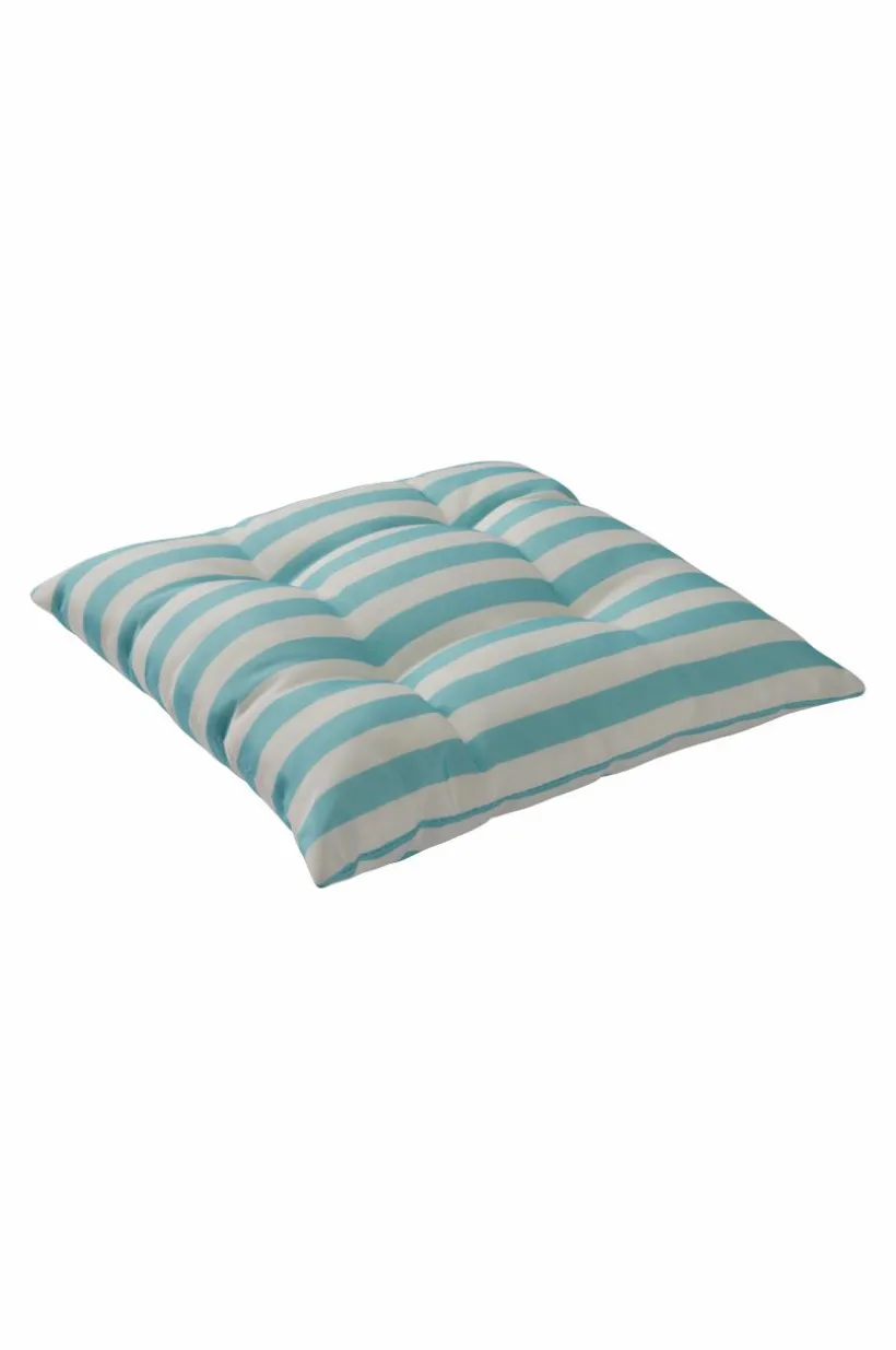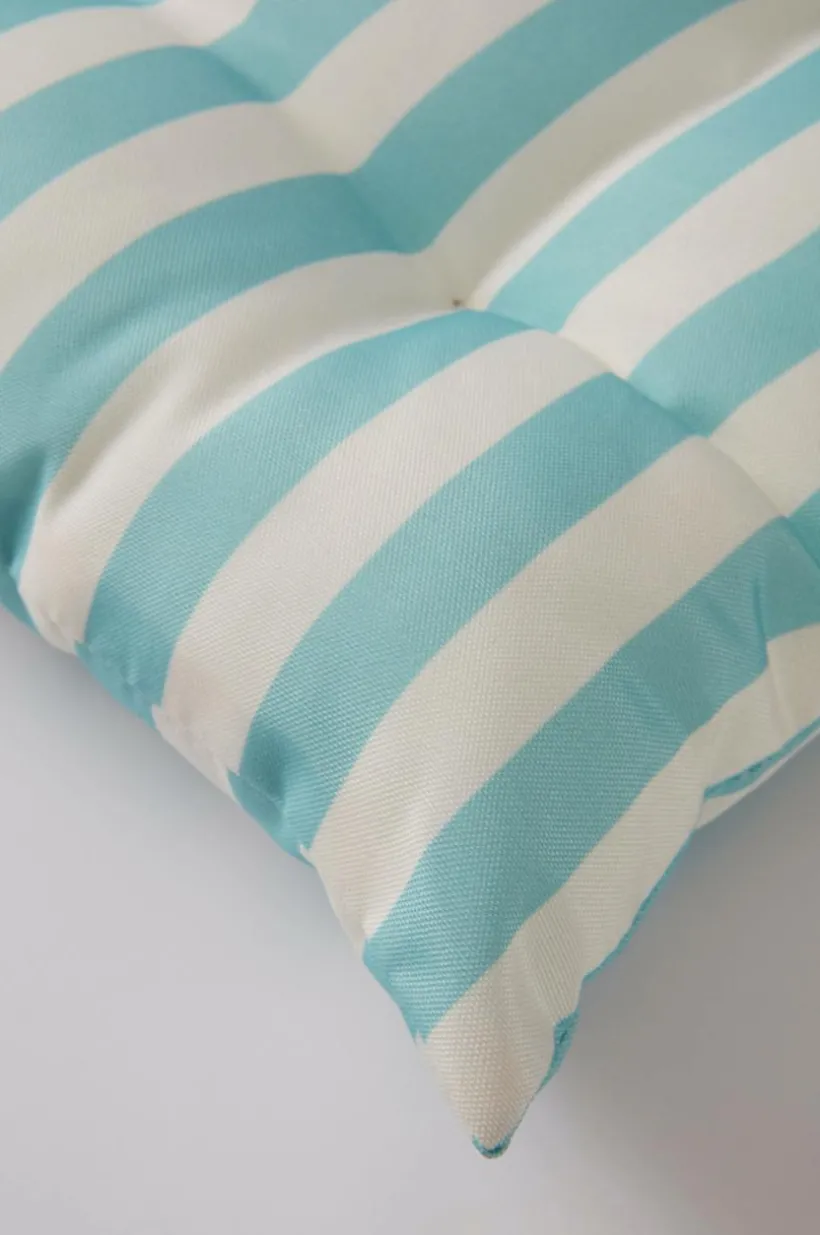 Randig sittdyna till utemöbler. Tyget är av polyester med tryckt mönster och vattenavvisande beläggning. Dynan har skumfyllning. Klädseln är inte avtagbar. Tygets slitstyrka 30000 Martindale.