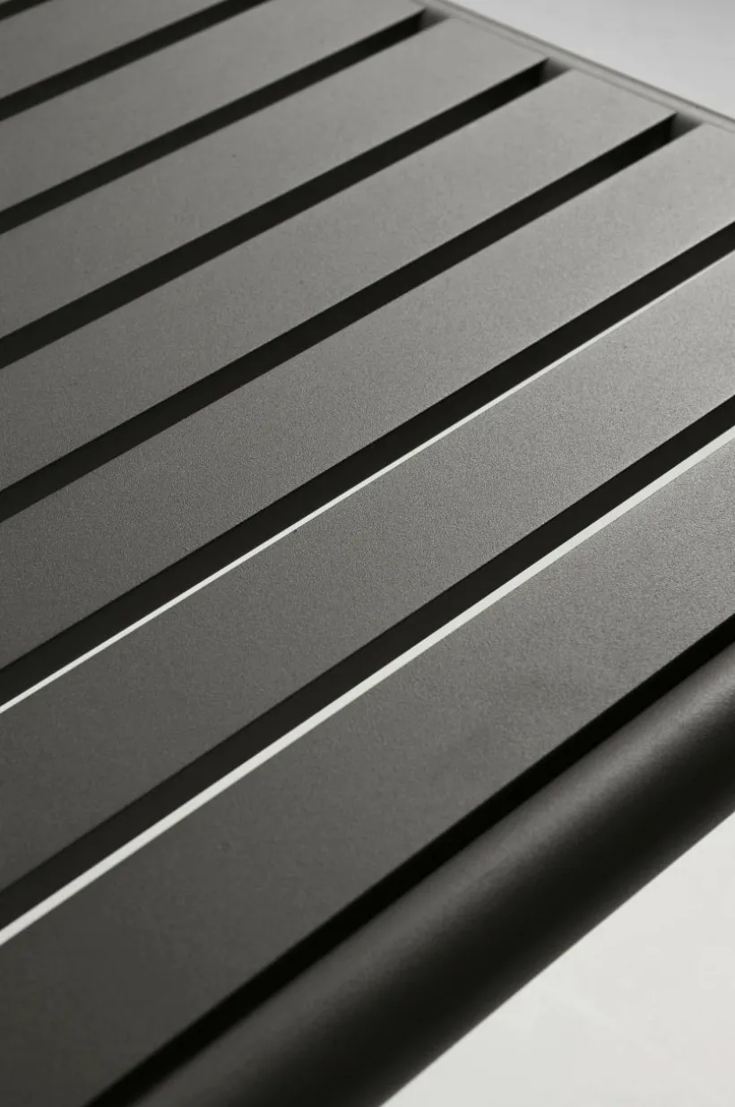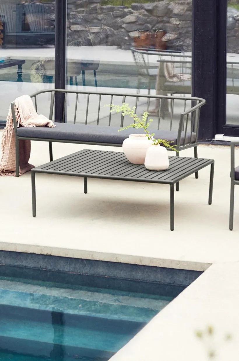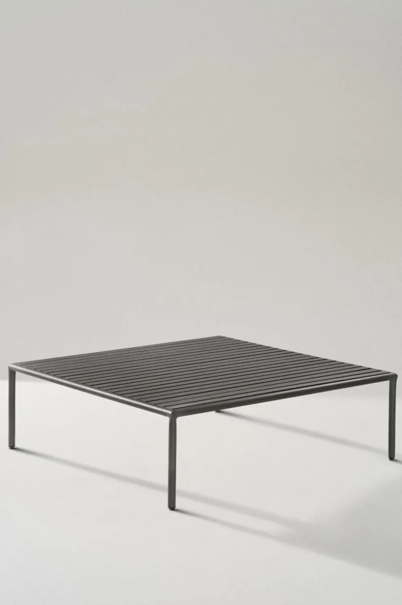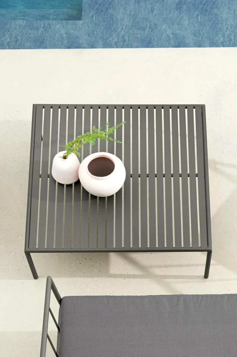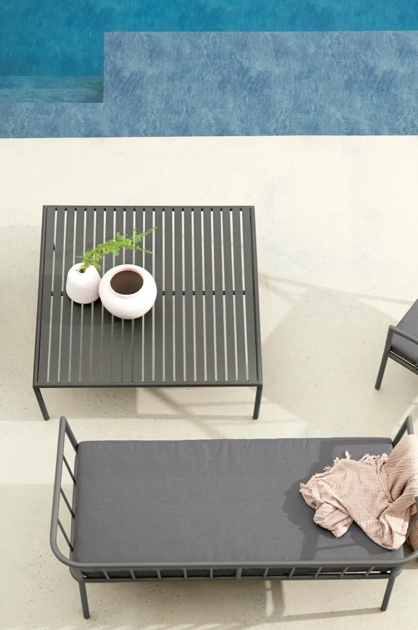 Soffbord av pulverlackerad aluminium med matt yta som inte bländar i solskenet. MENTON tål att stå utomhus och det gör utelivet enklare. Du slipper bära så fort du vill sitta ute. Möbeln är nätt och ger rätt loungekänsla. Låg vikt.