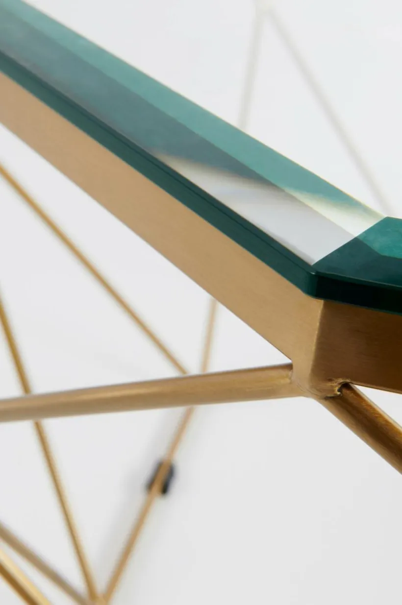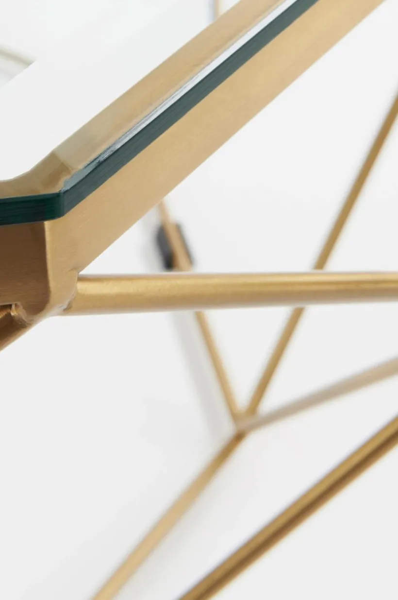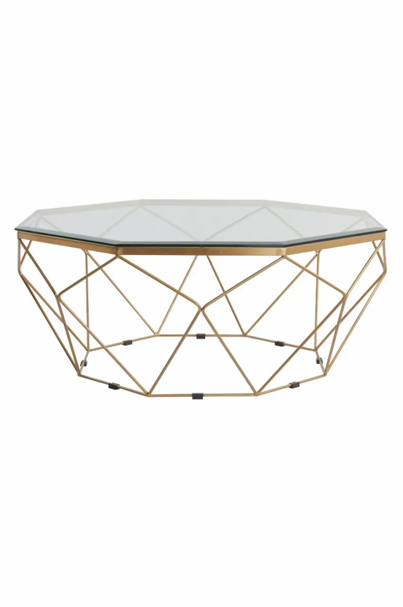 Stilfullt, åttahörnigt soffbord med bordsskiva i glas och dekorativa ben i rostfritt stål. Ett stilrent bord som drar blickarna till sig och ger ditt vardagsrum ett lyft.
