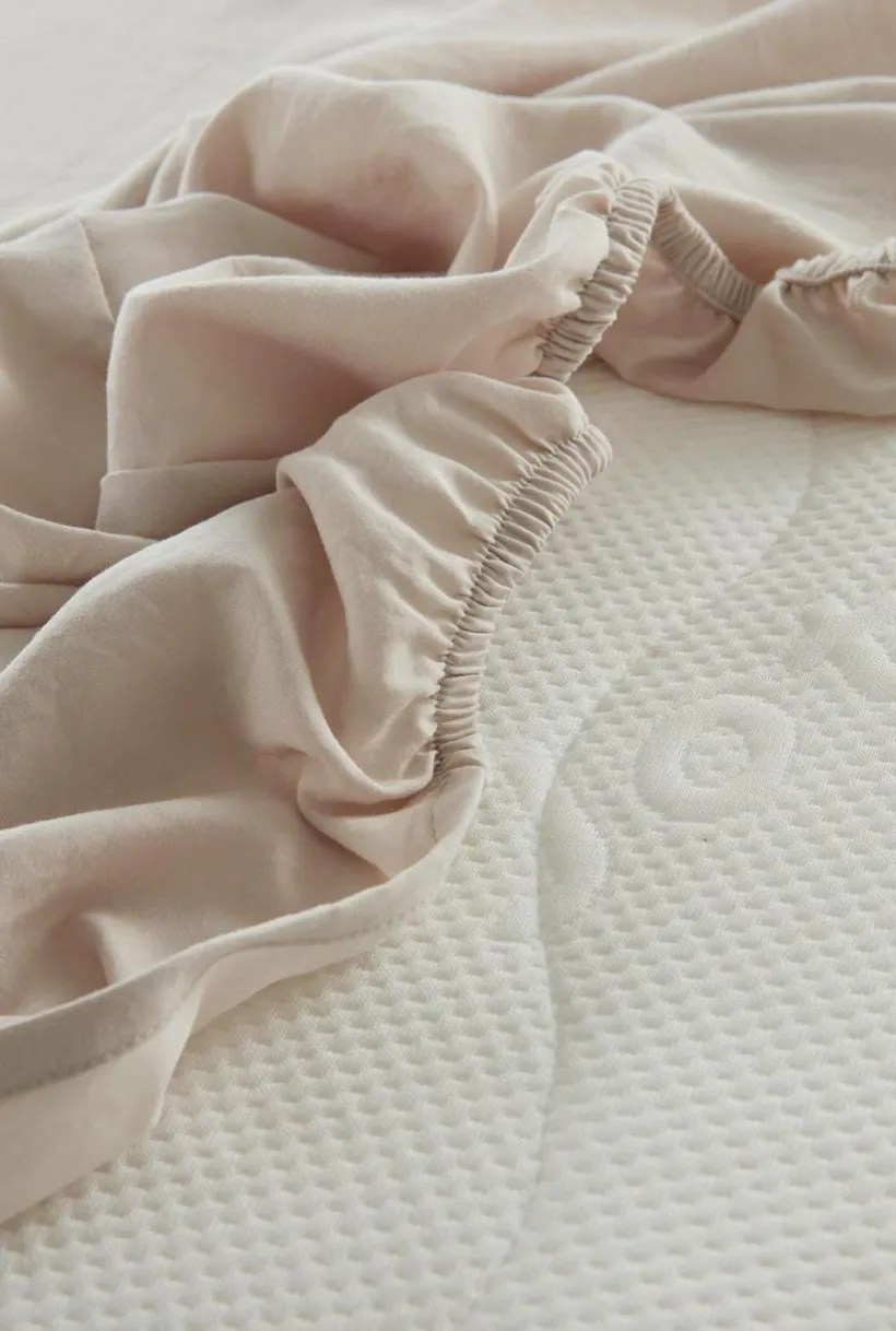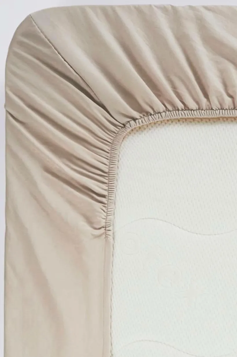 Enfärgat dra-på-lakan i supermjuk, tvättad kvalité med resår i hörnen. Tyget är en mikrofiber av polyester som är lätt och snabbtorkande. Den elastiska kanten gör att lakanet sitter bra på madrassen. Tygets gramvikt 80 g/m².