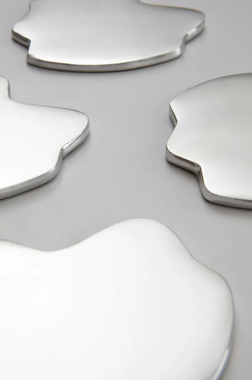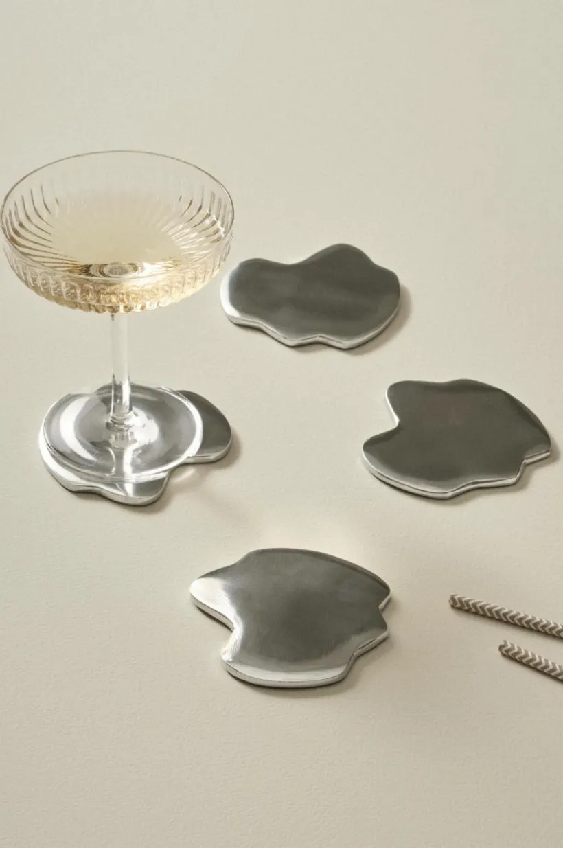 4-pack glasunderlägg av aluminium. De oregelbundet formade glasunderläggen ger en spännande dukning och de skyddar bordet från fläckar av både vätska och värme.