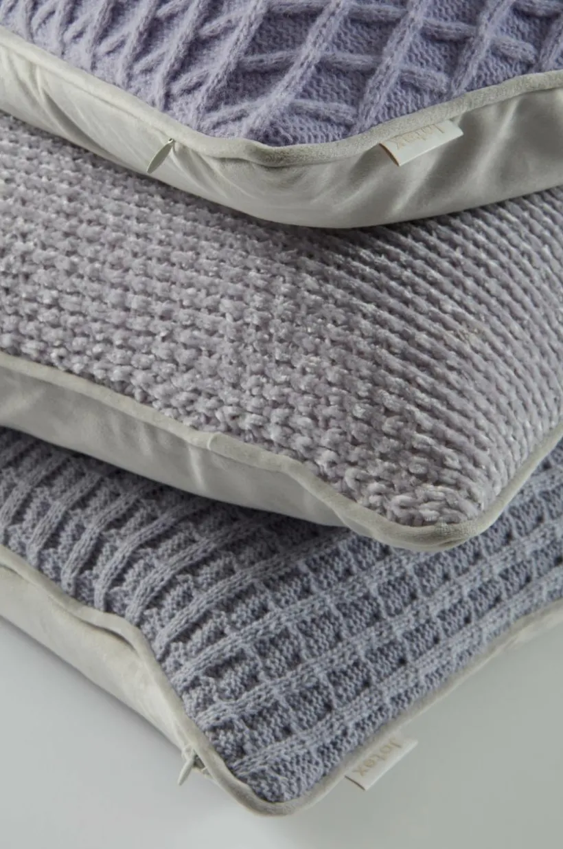 3-pack kuddfodral med stickad framsida. Baksidan är i skimrande sammet. De tre kuddfodralen är olika och matchar varandra perfekt, två är kvadratiska och ett är rektangulärt. Kuddfodralet har en liten kant runt om och en dragkedja i nederkant.