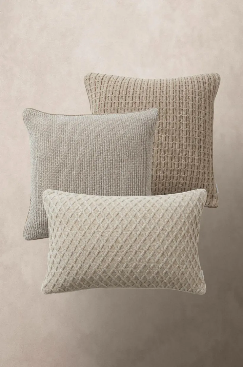 3-pack kuddfodral med stickad framsida. Baksidan är i skimrande sammet. De tre kuddfodralen är olika och matchar varandra perfekt, två är kvadratiska och ett är rektangulärt. Kuddfodralet har en liten kant runt om och en dragkedja i nederkant.