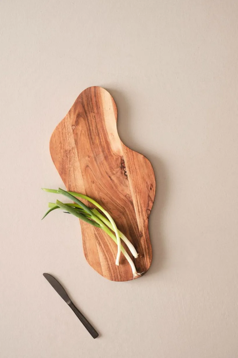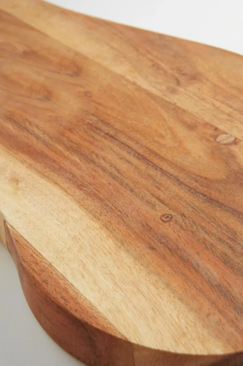 Handgjord skärbräda av FSC-certifierad acacia i naturligt vacker färg med fin ådring. MILIA har vacker oregelbunden form och passar fint till uppläggning och servering. Den mjuka ytan är behandlad med vegetabilisk olja. Varje skärbräda är unik då träet har naturliga variationer och de tillverkas för hand.