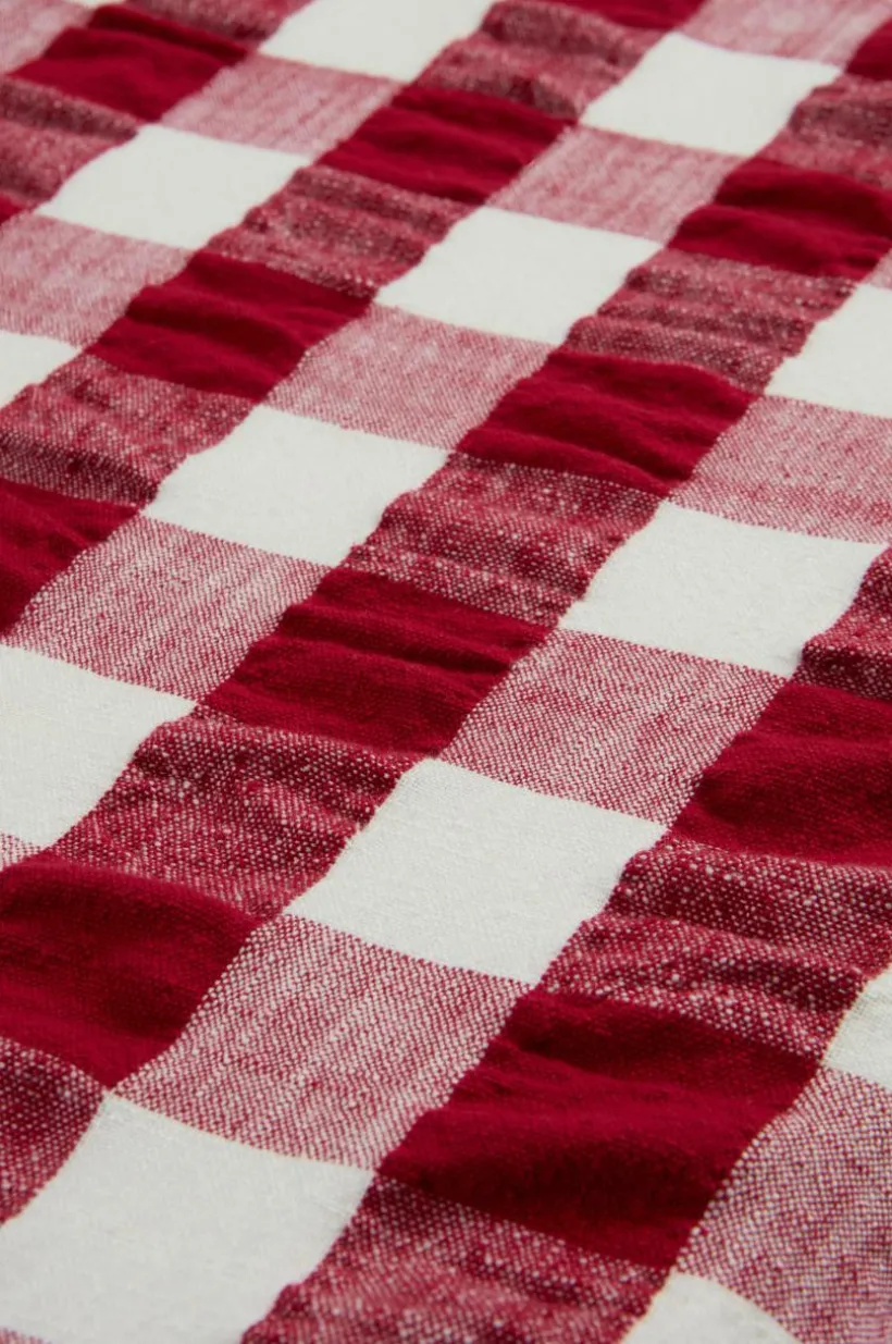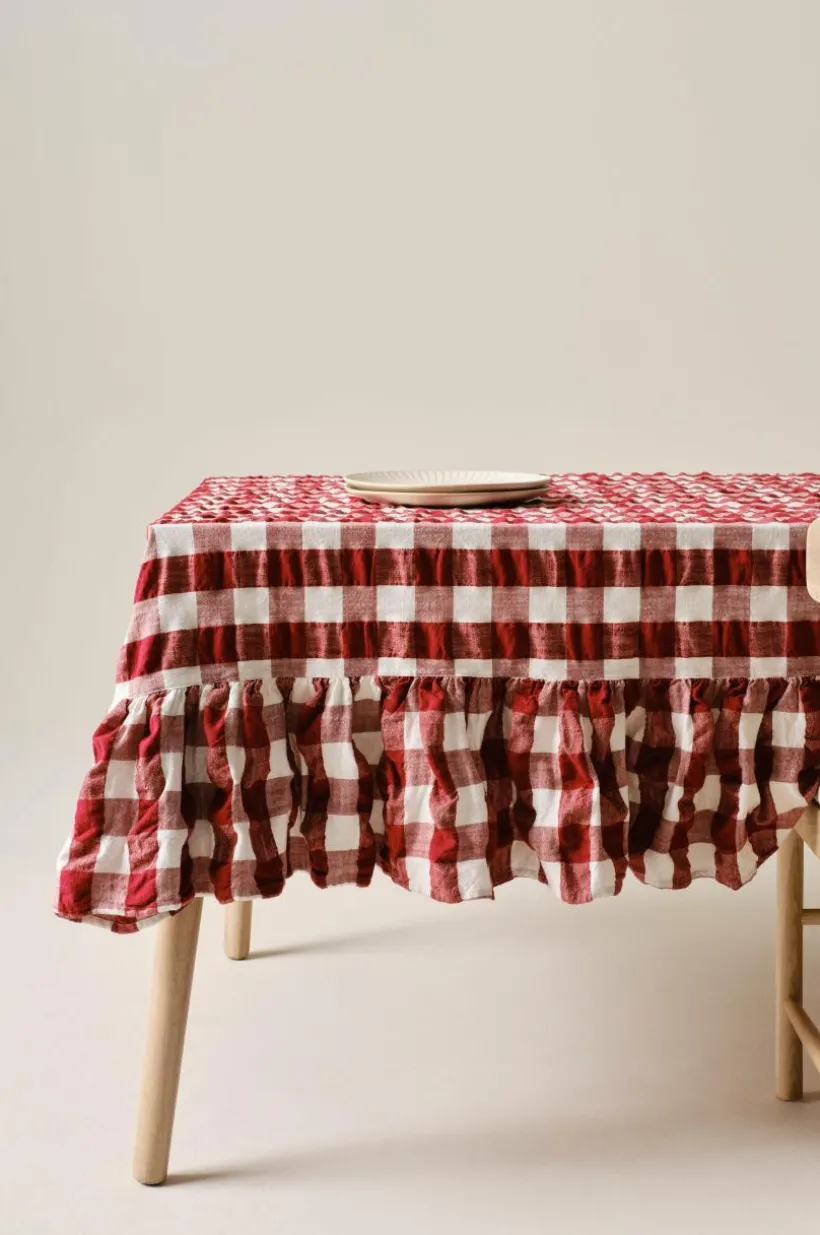 Bordsduken MIMMI har garnfärgat rutmönster och är tillverkad av bäckeböljatyg. Bomullsduken har en volangkant runt om. Det klassiska rutmönstret ger charm till ditt kök. Duken är perfekt för alla tillfällen och skapar en inbjudande atmosfär för familj och gäster.